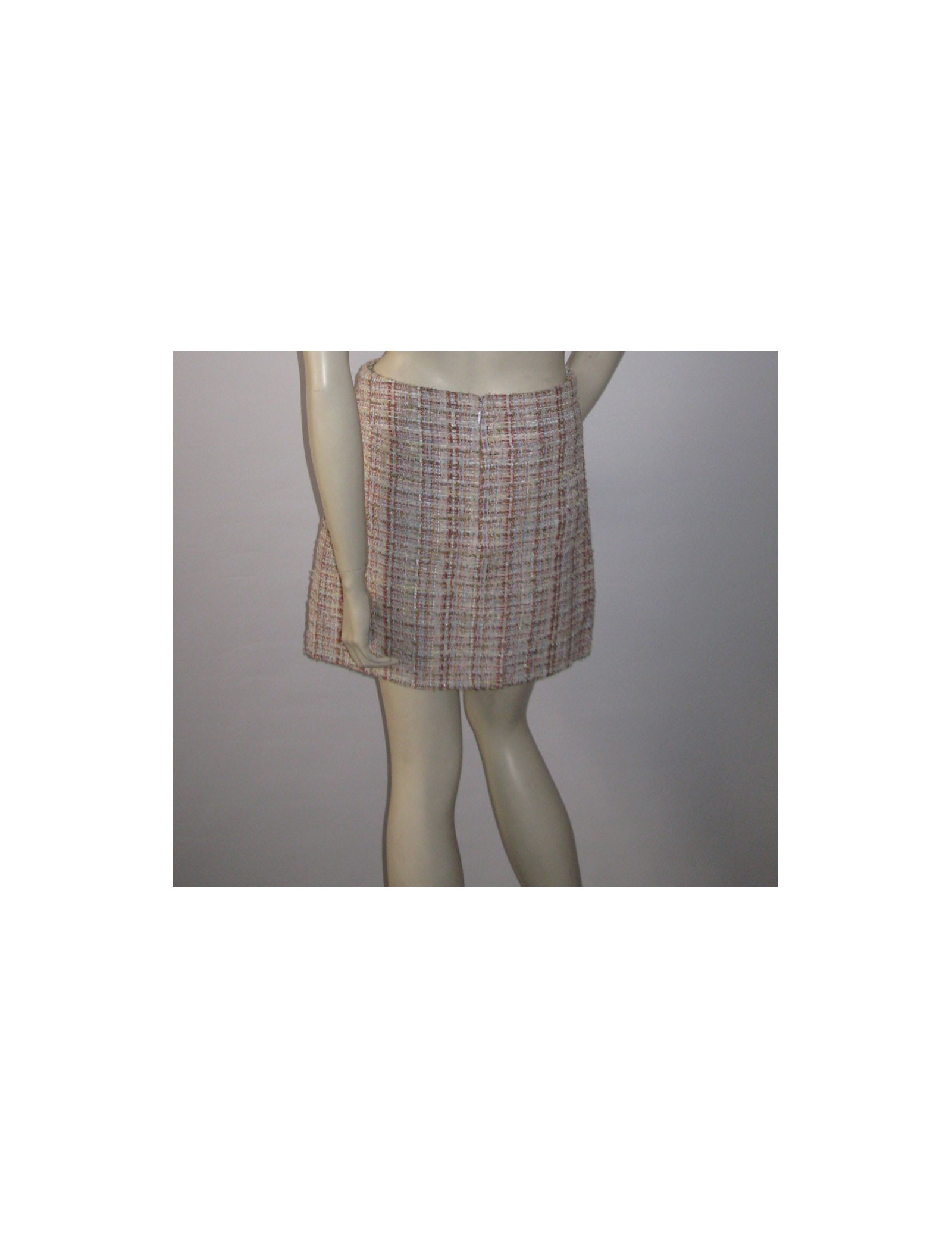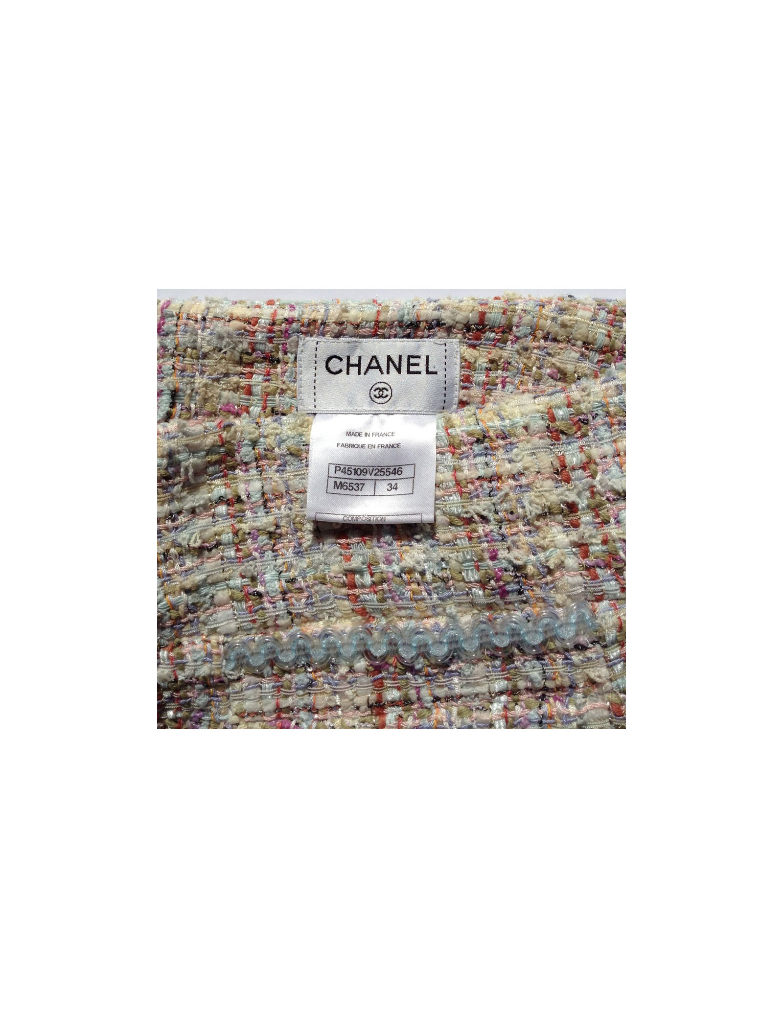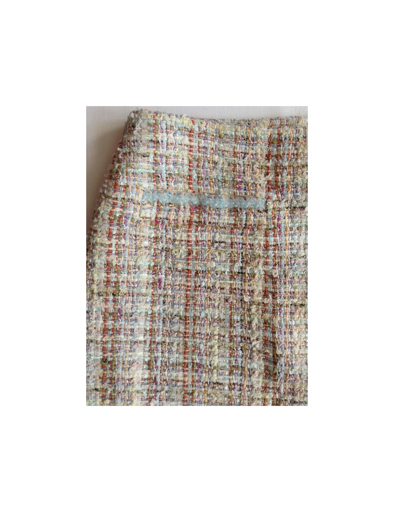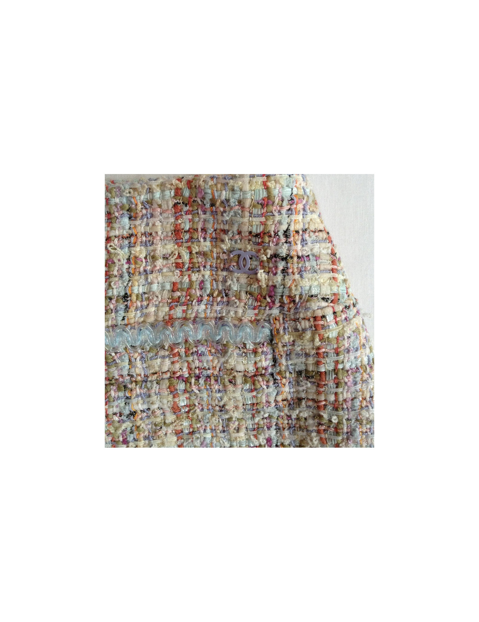 L'incontournable! Mini-jupe CHANEL en tweed chiné dans les tons pastel en taille 34Fr. Coupe trapèze. Jupe rehaussée de 2 poches plaquées de décorations gansées d'une petite "vague" plastifié (Voir photo). Fermeture au dos par un long zip discret orné d'une petite tirette de couleur lilas siglé CC. 55% coton, 27% polyamide. Doublure 100% soie.