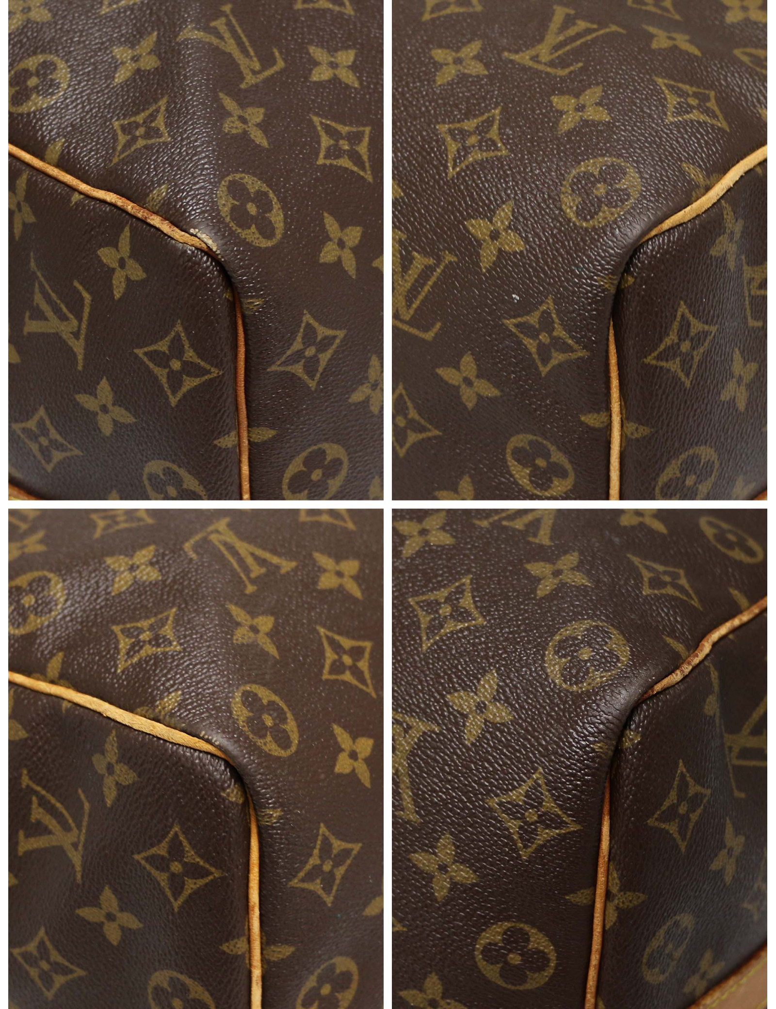 Détails : le plus emblématique des sacs de voyage depuis sa création en 1930. Confectionné dans la toile enduite Monogram emblématique de Louis Vuitton, ce Keepall 50 vintage est en très bel état. Il se distingue par la superbe patine miel, profonde et chaleureuse, de son cuir de vachette naturel, qui sublime les finitions, les poignées roulées et la bandoulière amovible. Il présente des marques d'usure sur les empiècements en cuir et sur la bijouterie. Spacieux et fonctionnel, il est parfaitement adapté aux escapades de week-end ou comme bagage cabine élégant.
