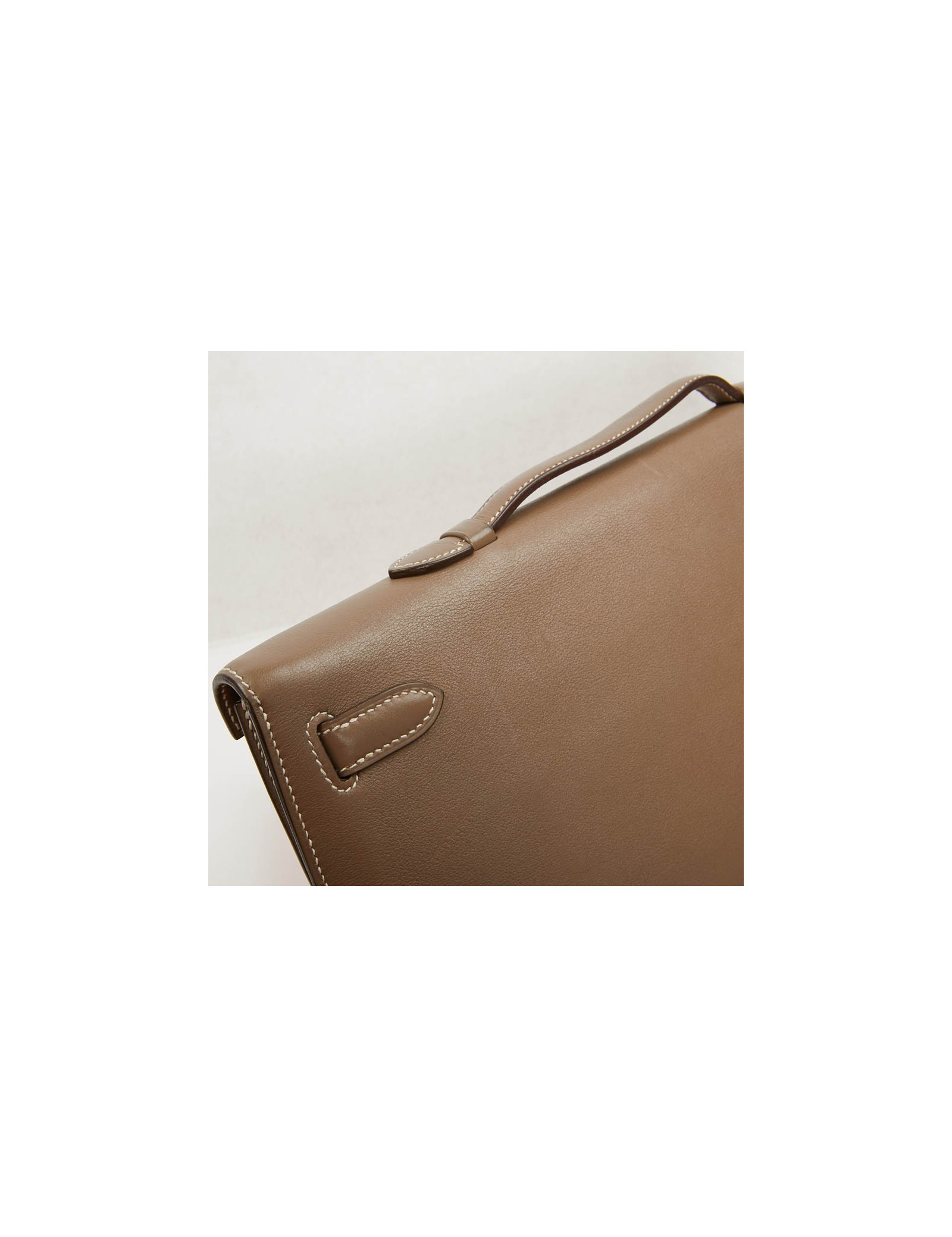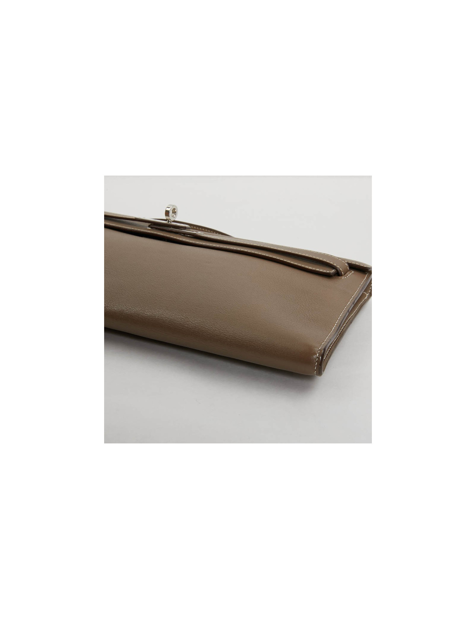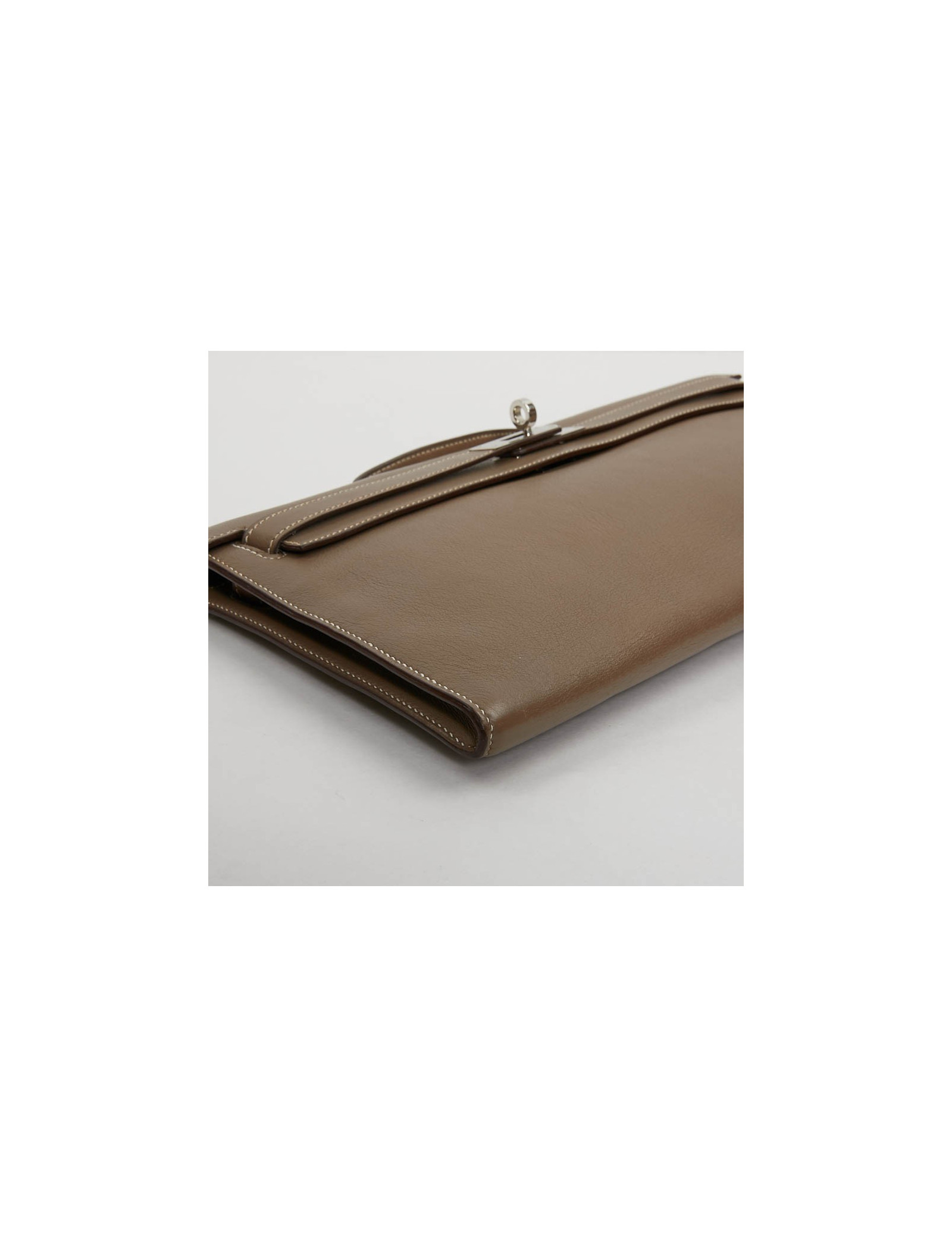 Chic pochette "Kelly cut" de la Maison Hermès en cuir Swift de couleur étoupe. L'accastillage est en argent palladié. Elle se porte à la main.