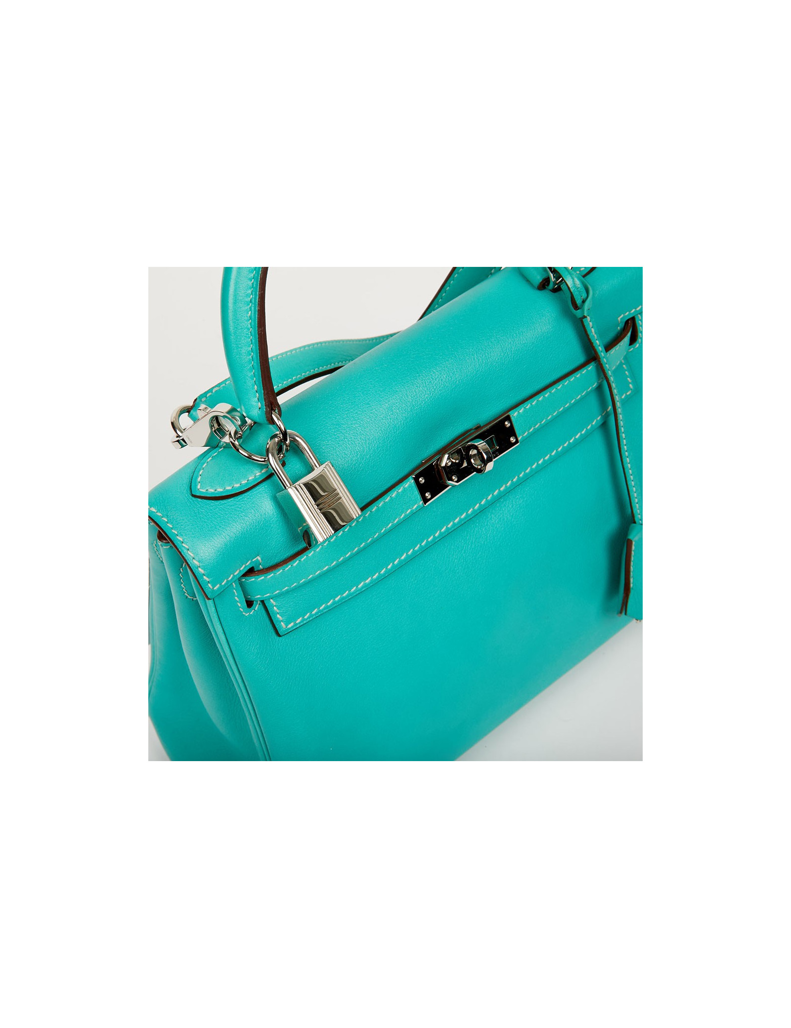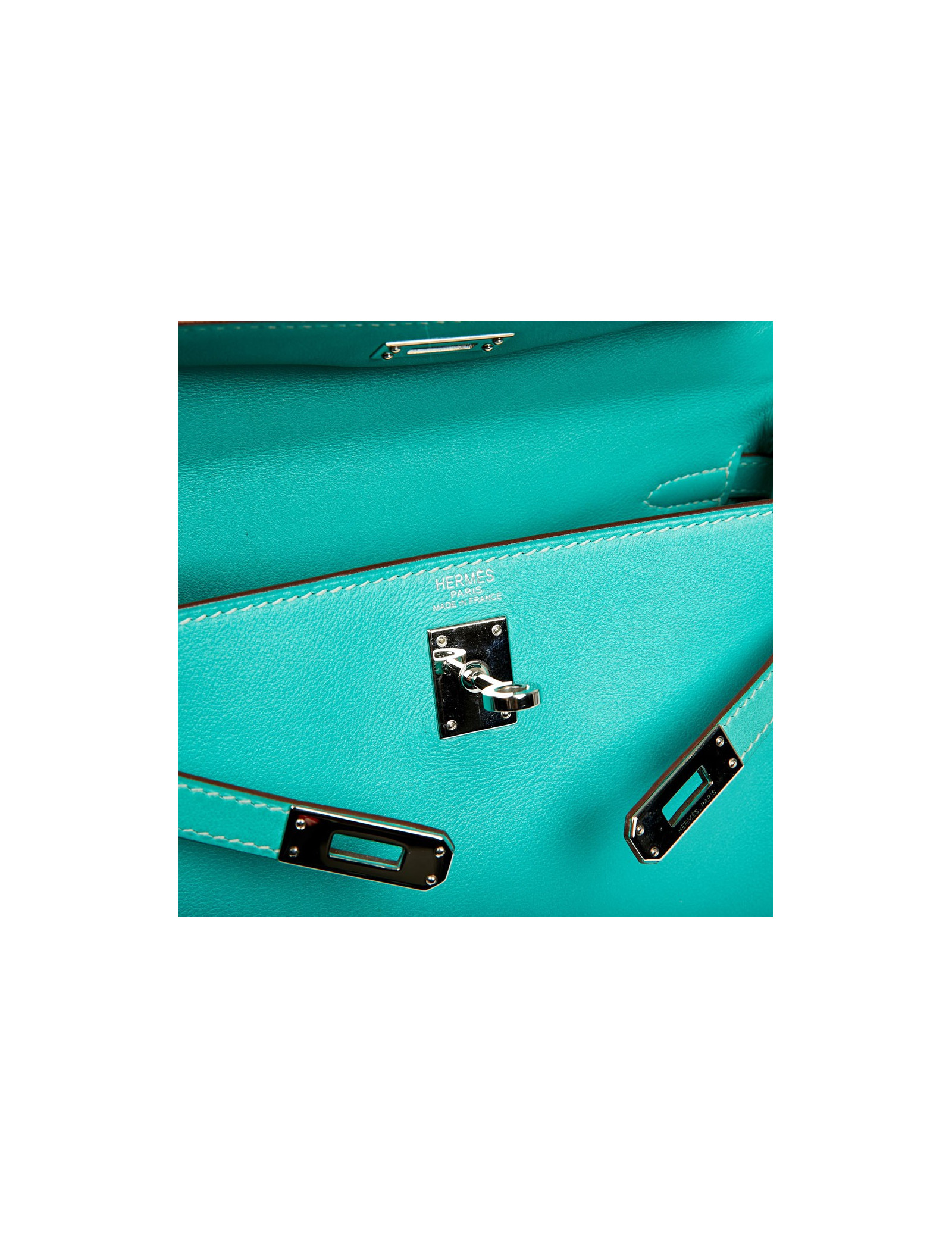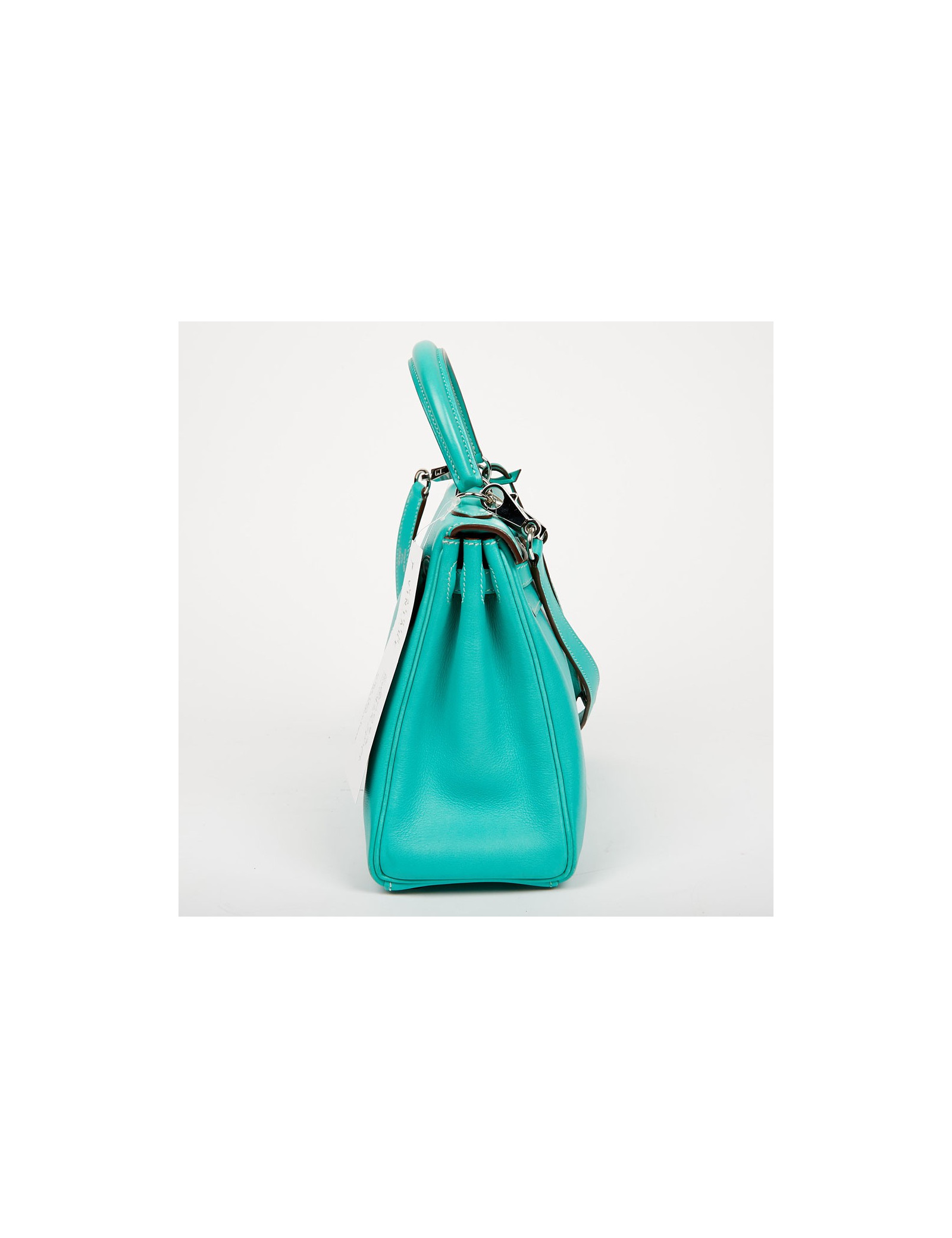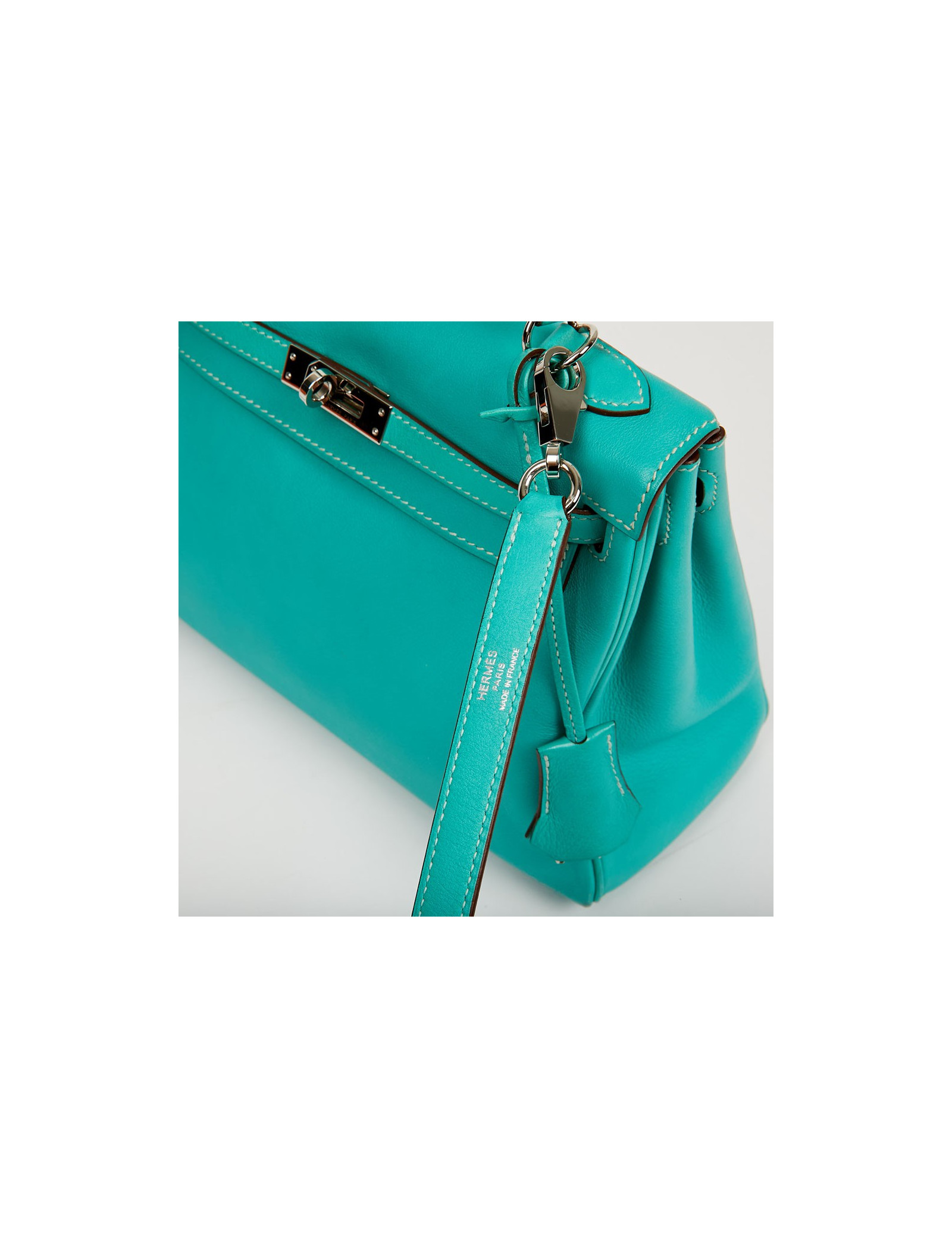Joli sac Kelly II en swift, de couleur turquoise vert. Il a sa bandoulière. Les attributs sont argent palladié. Les coins sont légèrement marqués, voir photos. ll se porte à la main ou avec sa bandoulière amovible.