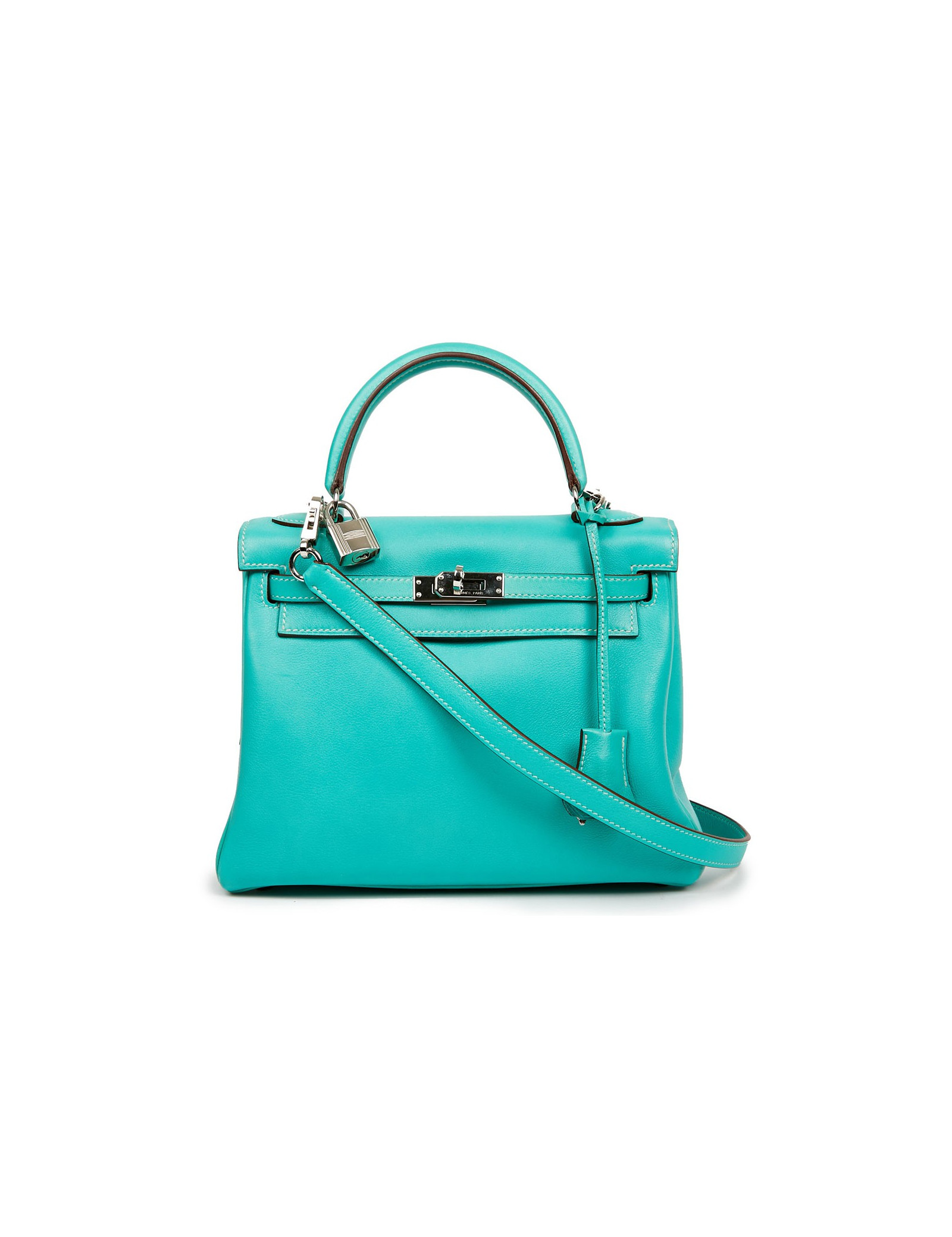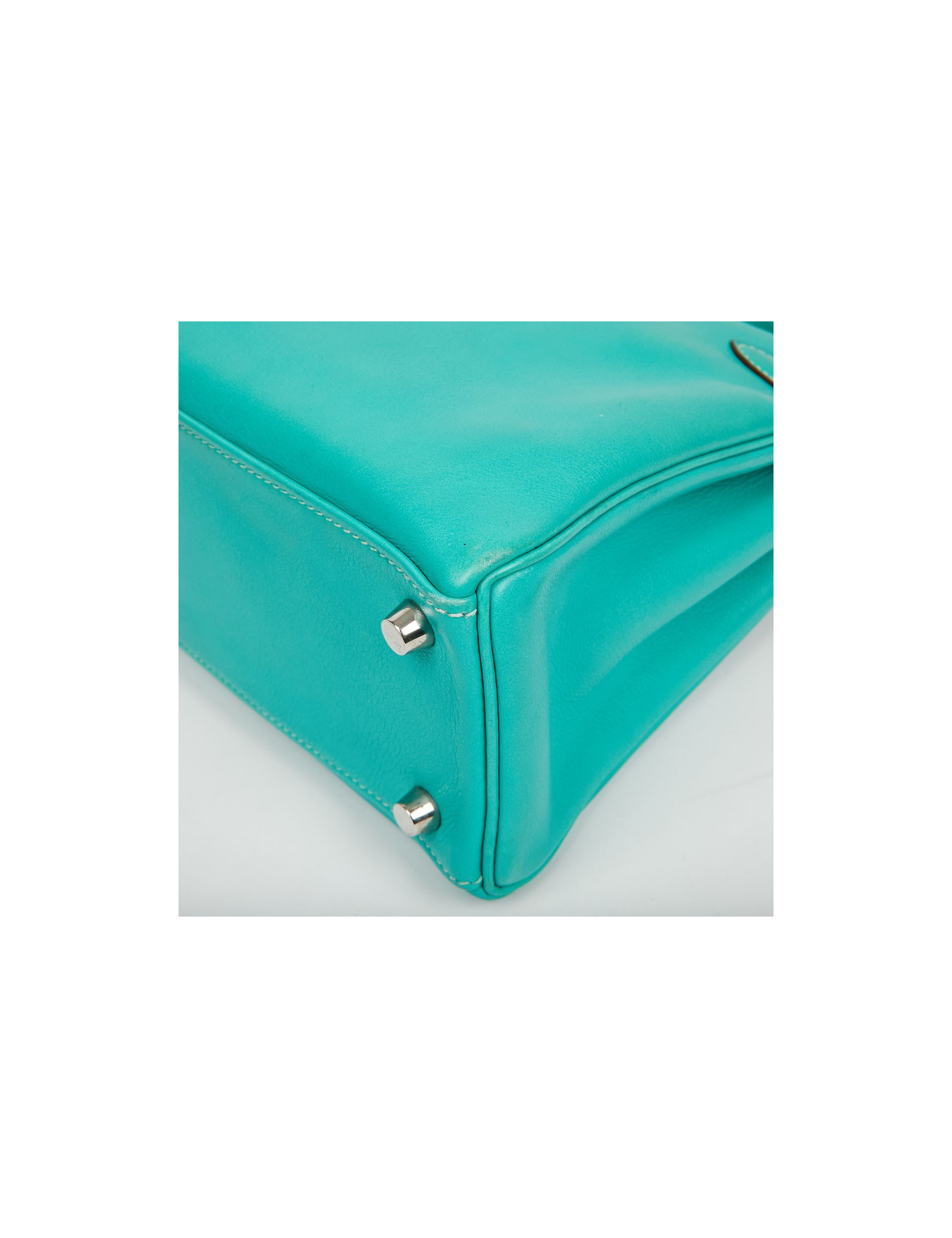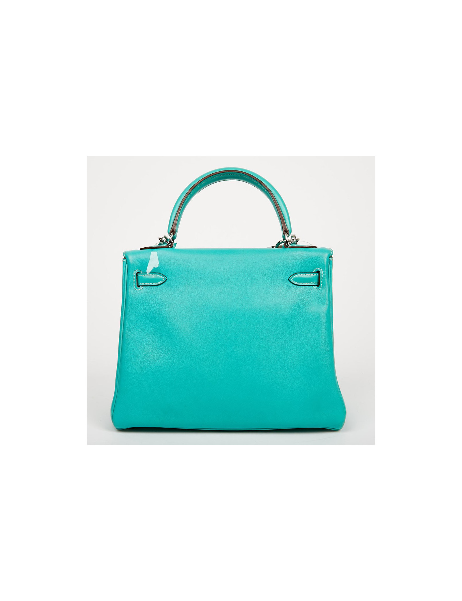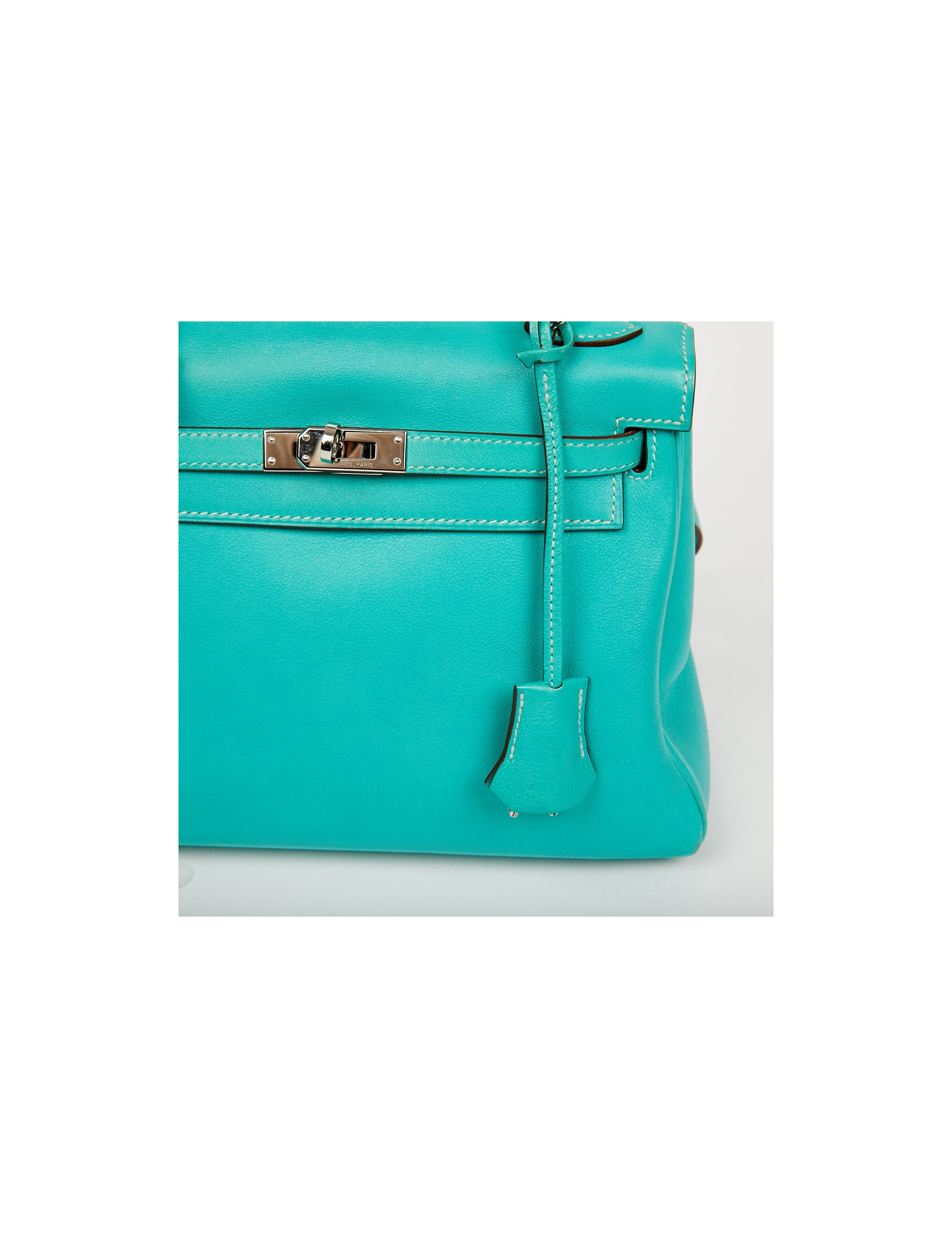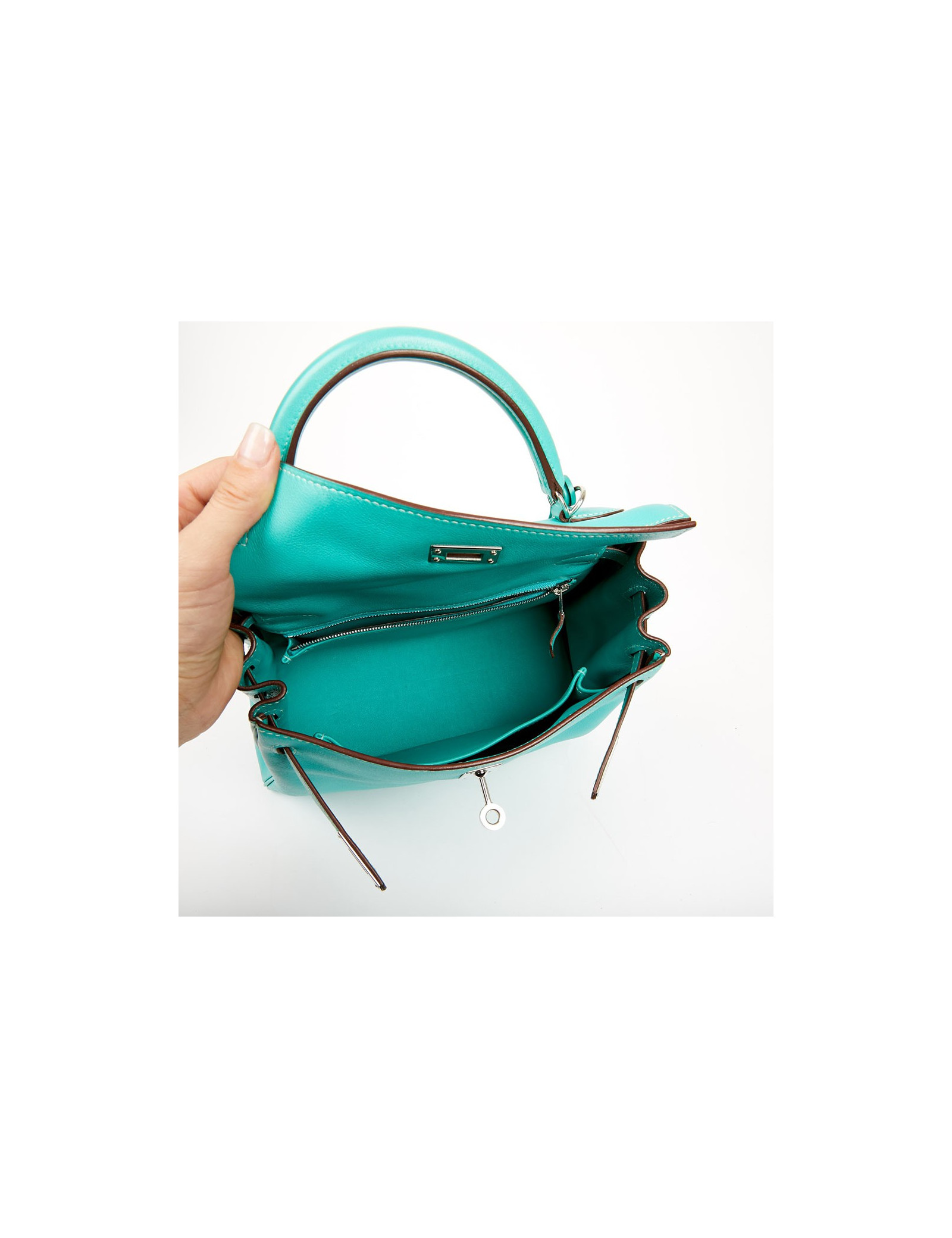 Joli sac Kelly II en swift, de couleur turquoise vert. Il a sa bandoulière. Les attributs sont argent palladié. Les coins sont légèrement marqués, voir photos. ll se porte à la main ou avec sa bandoulière amovible.