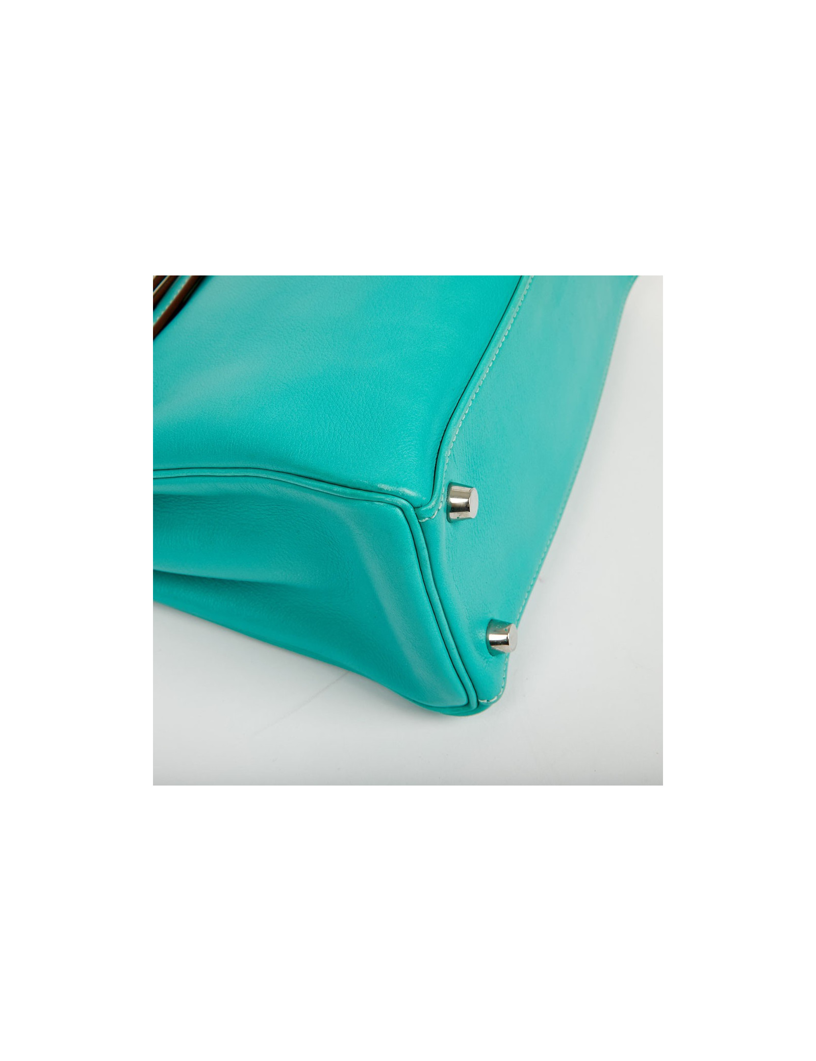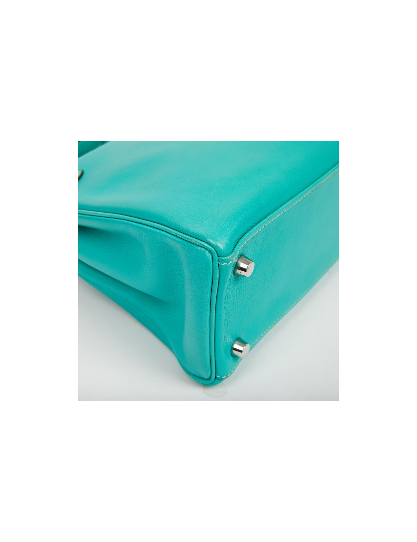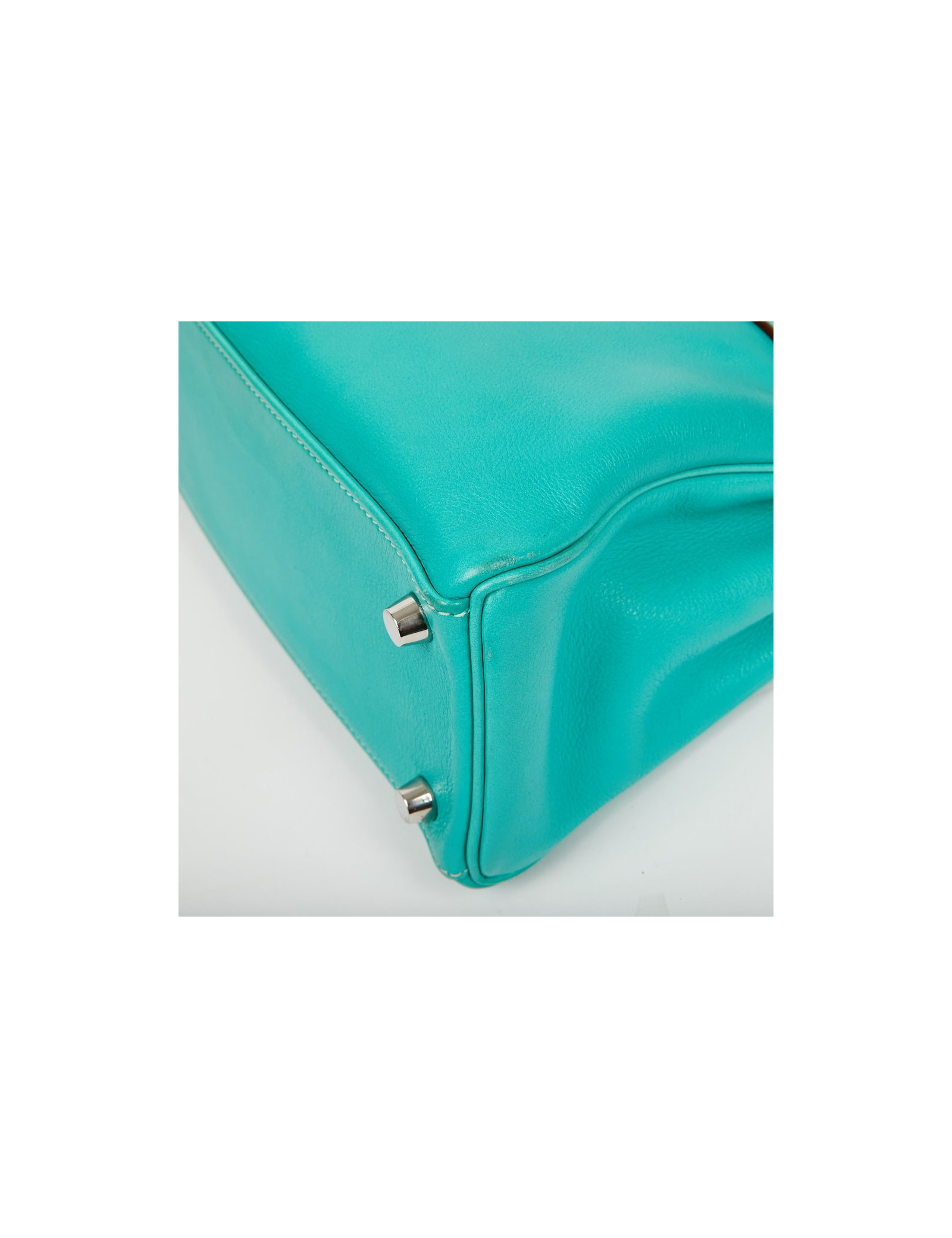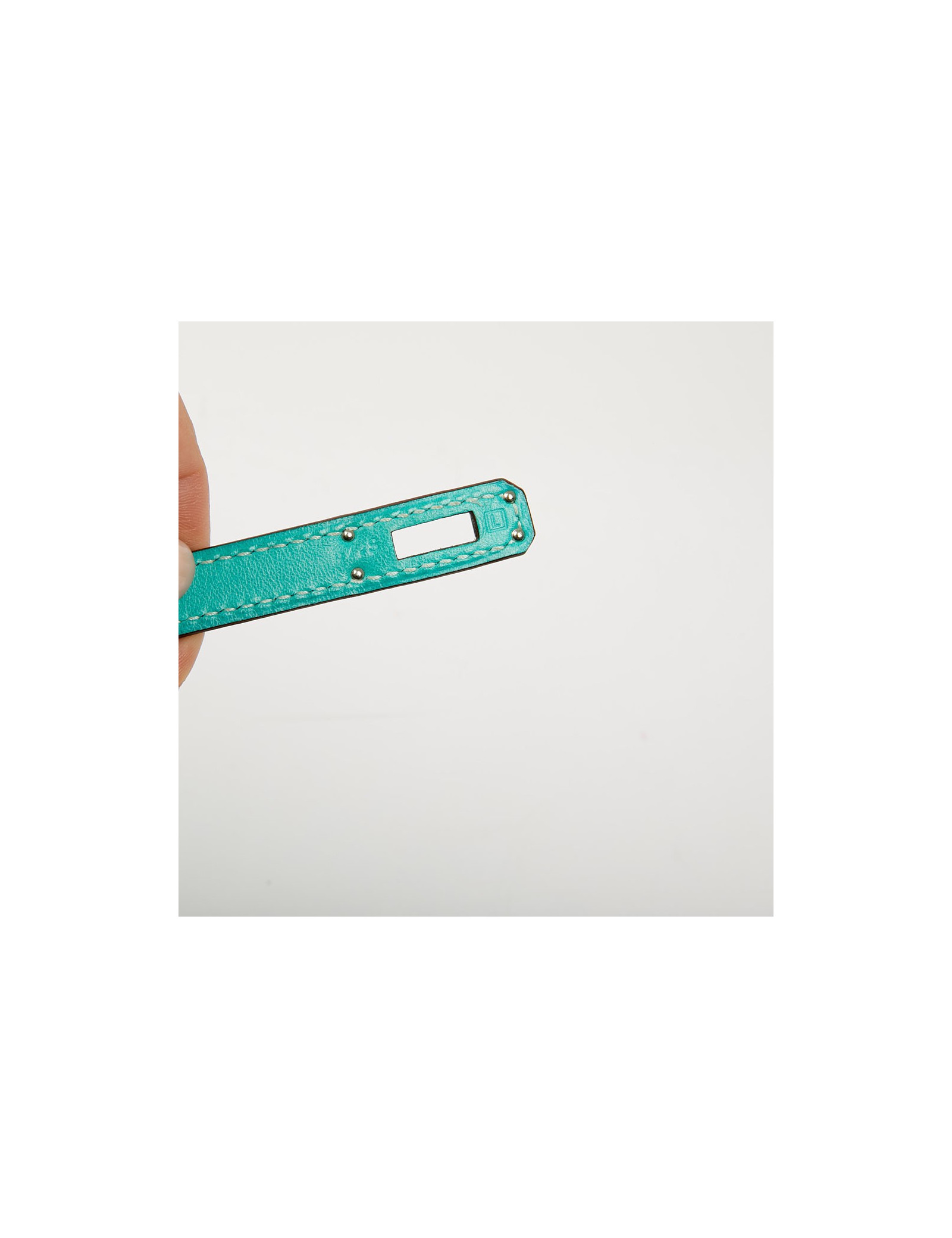 Joli sac Kelly II en swift, de couleur turquoise vert. Il a sa bandoulière. Les attributs sont argent palladié. Les coins sont légèrement marqués, voir photos. ll se porte à la main ou avec sa bandoulière amovible.