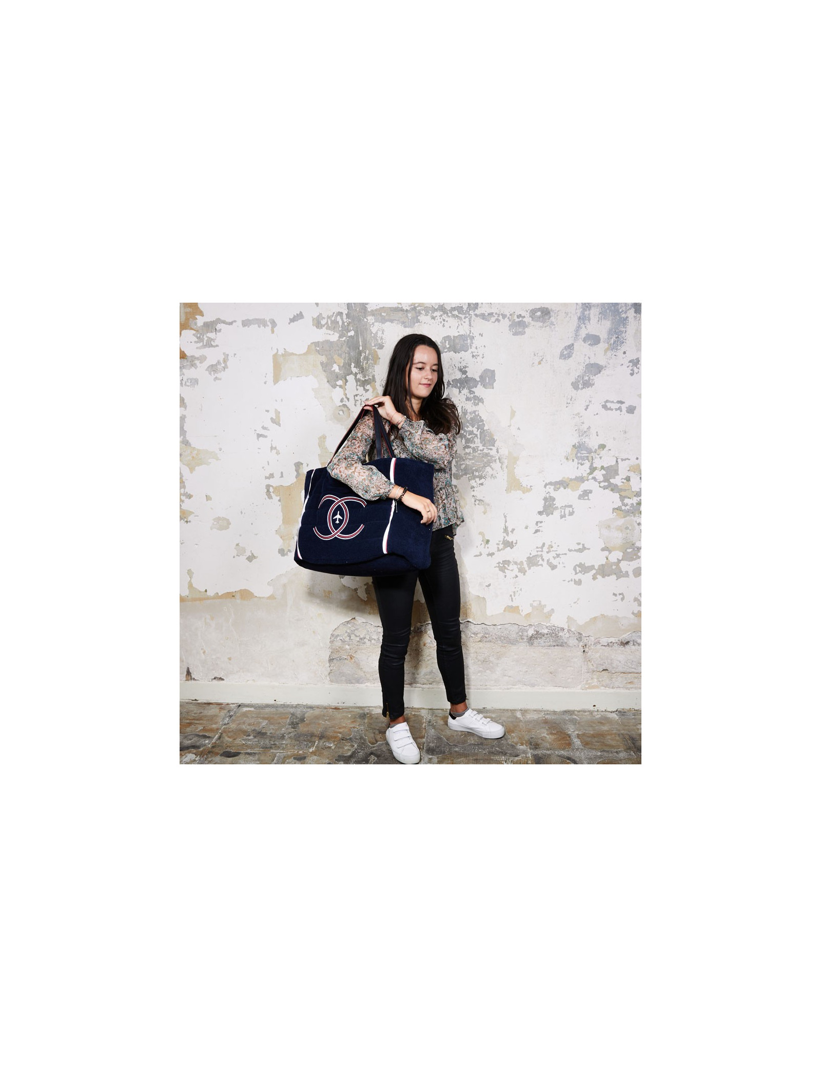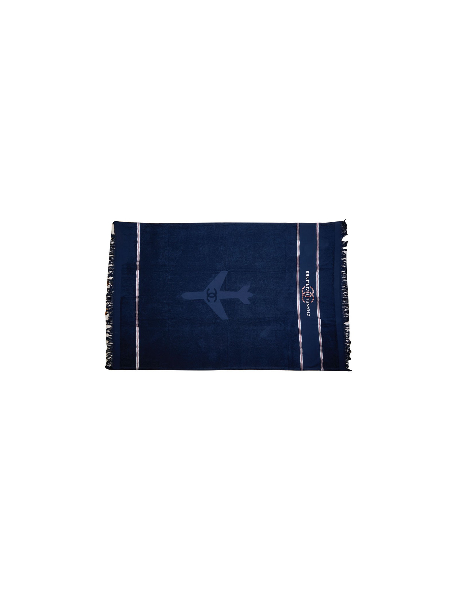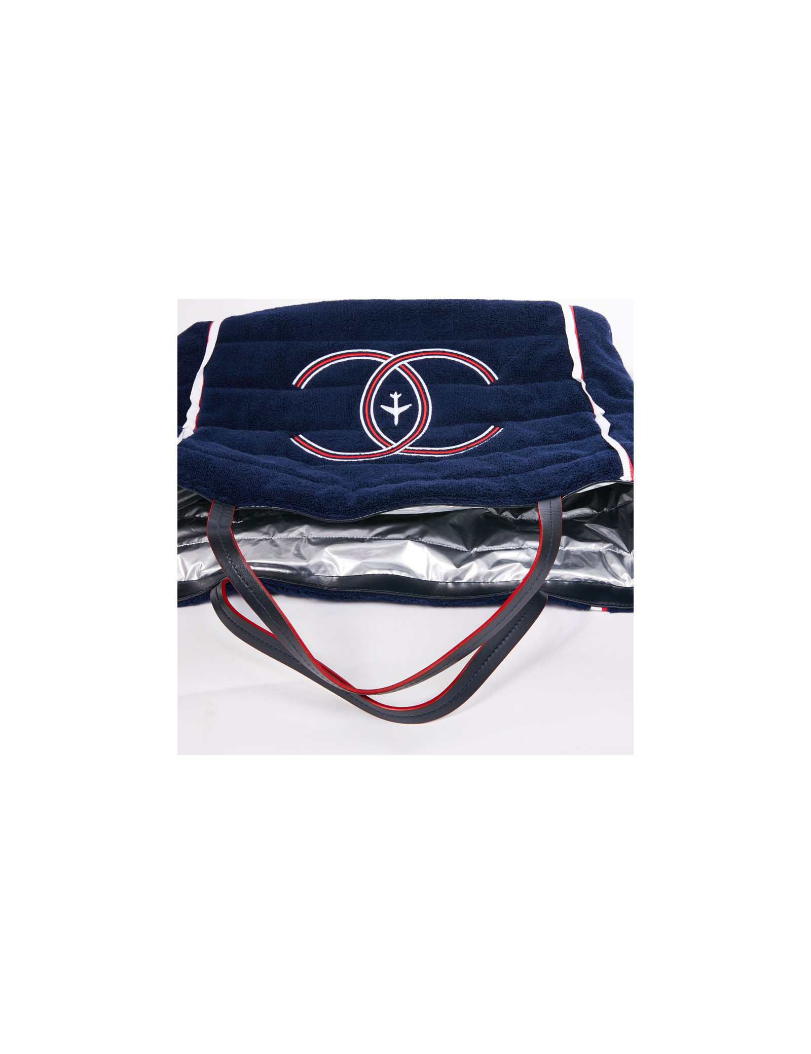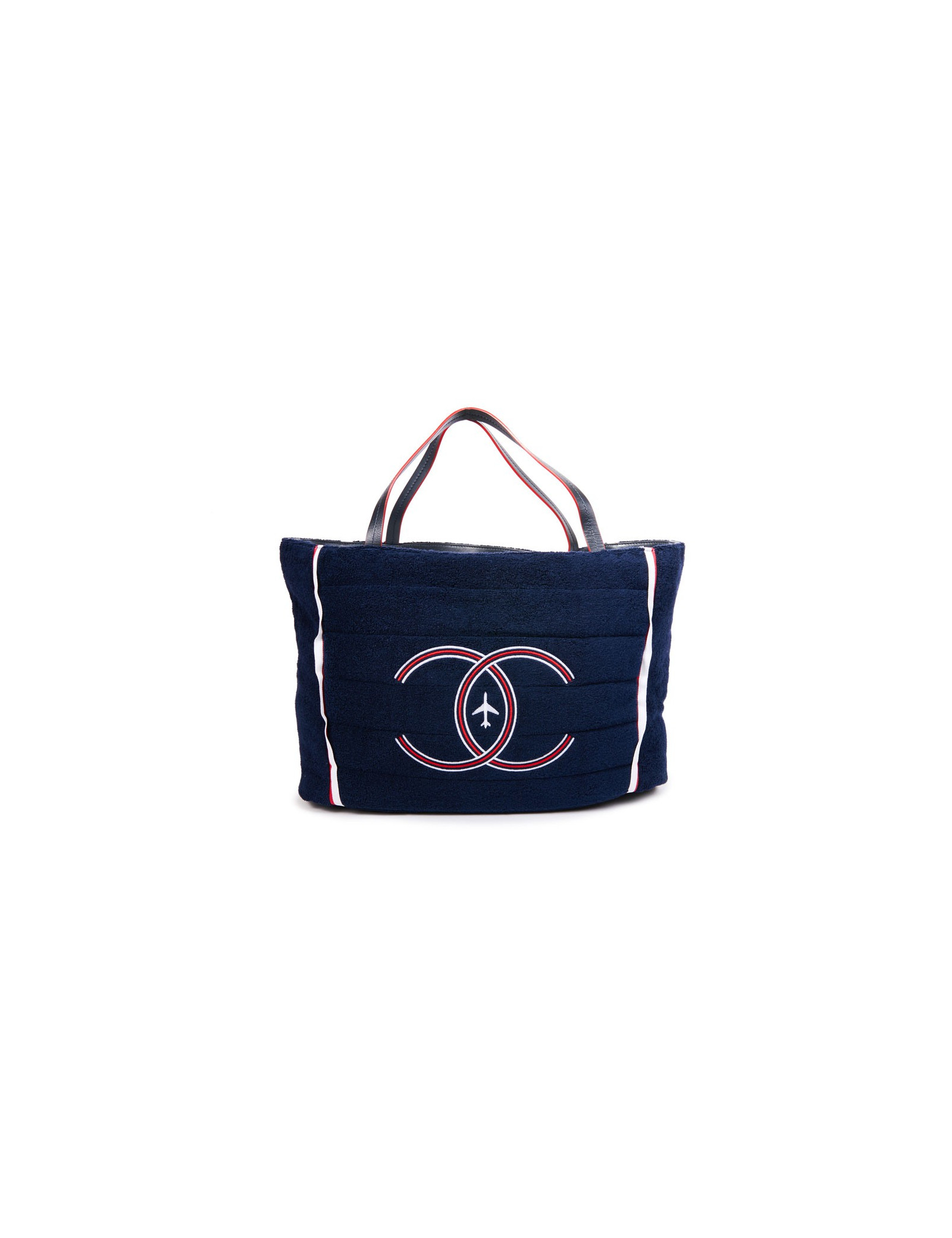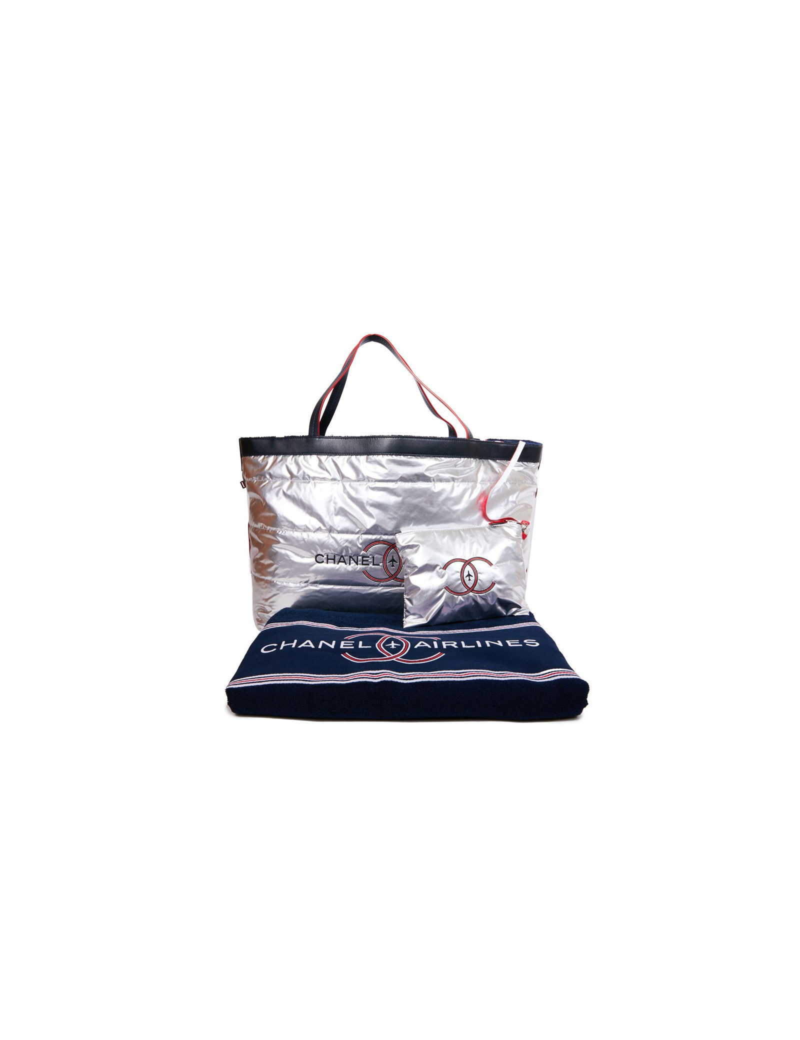 Sac CHANEL Airlines argent et sa serviette de plage bleue marine