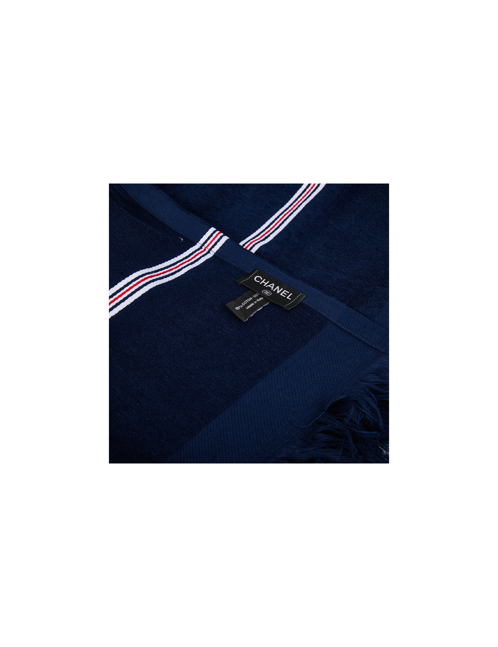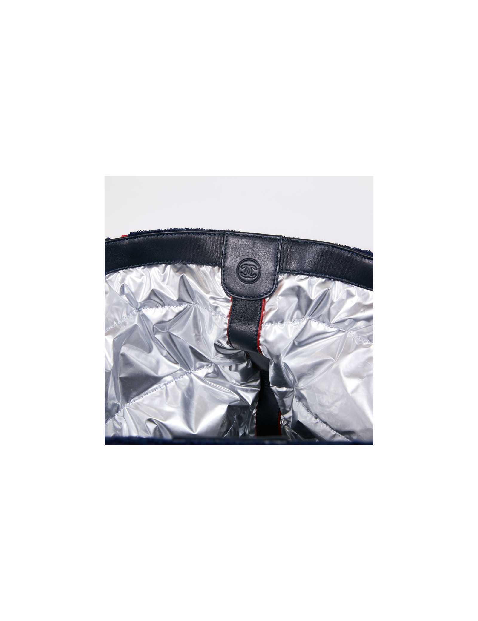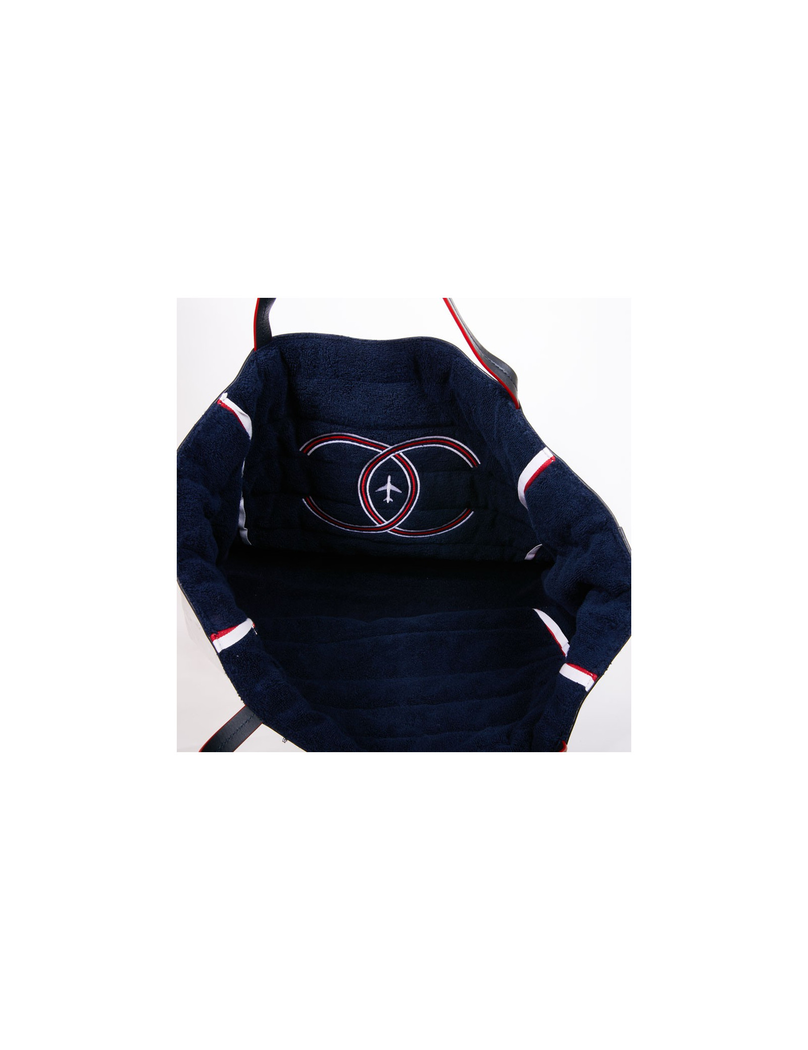 Ce sac de plage d'occasion CHANEL issu de la Collection "Airlines" est de couleur argent et sa serviette de plage bleue marine. Les bordures sont en cuir de veau bleu marine. La doublure intérieure en tissu éponge bleu marine. On y trouve à l'intérieur une pochette zippée amovible ainsi qu'une grande serviette de plage 100% coton bleu marine jamais utilisée.