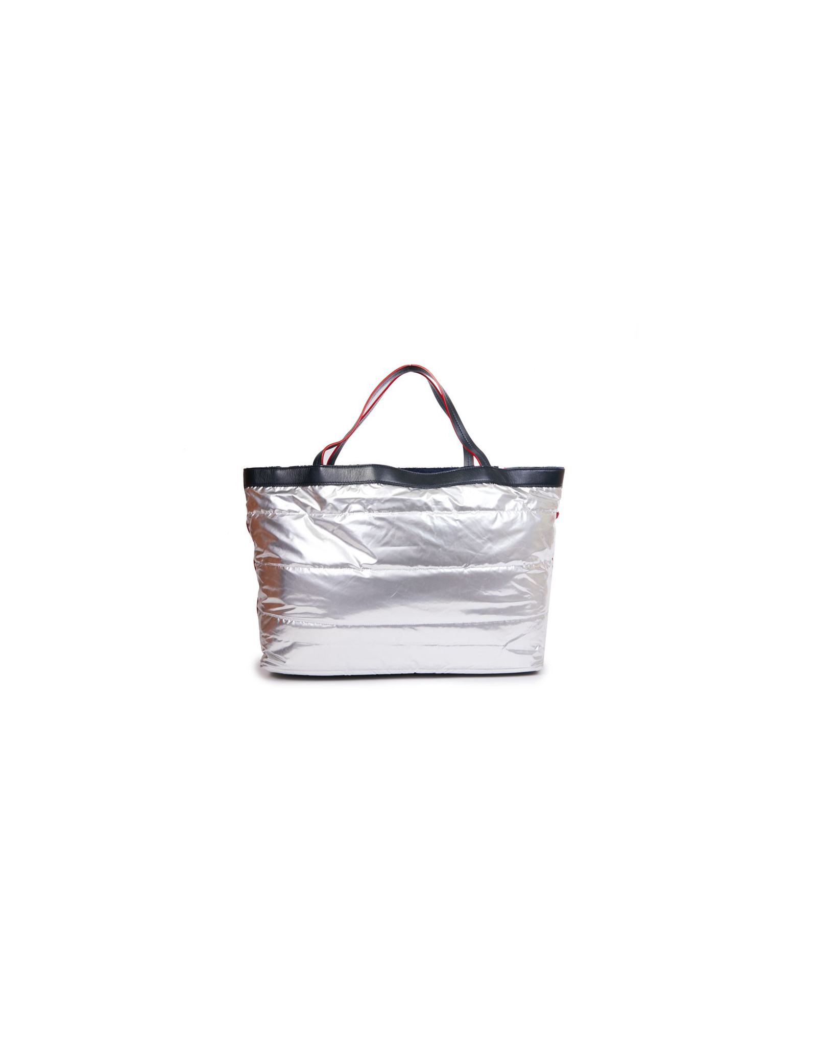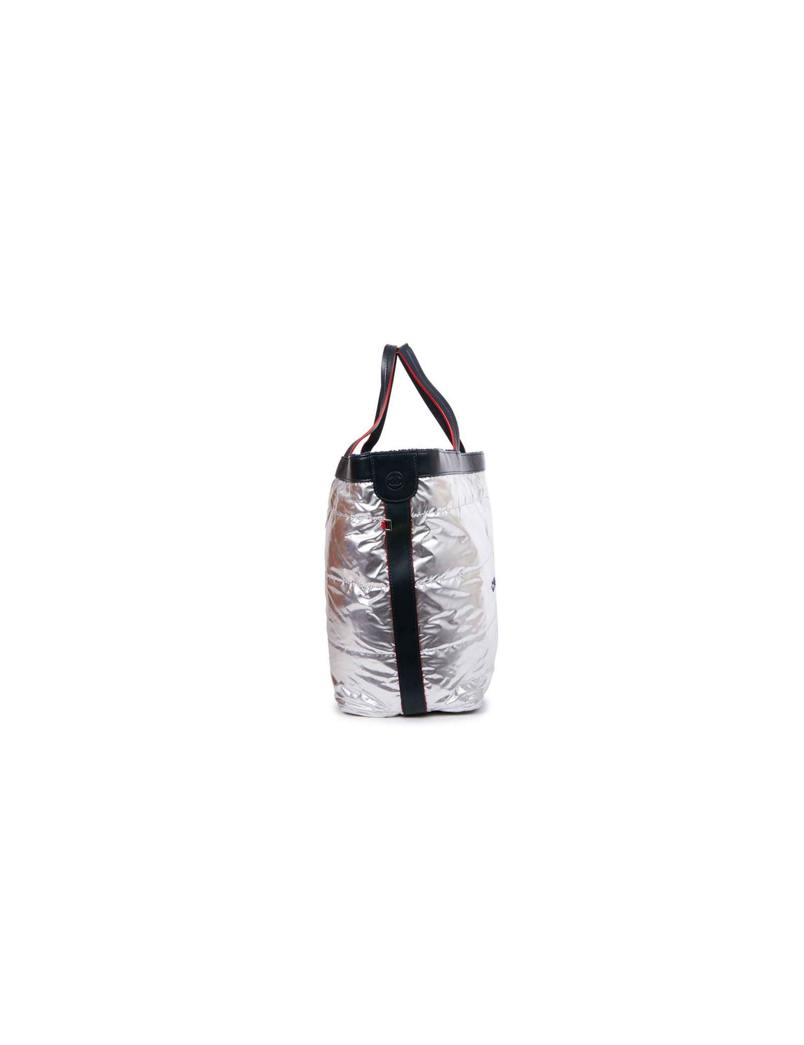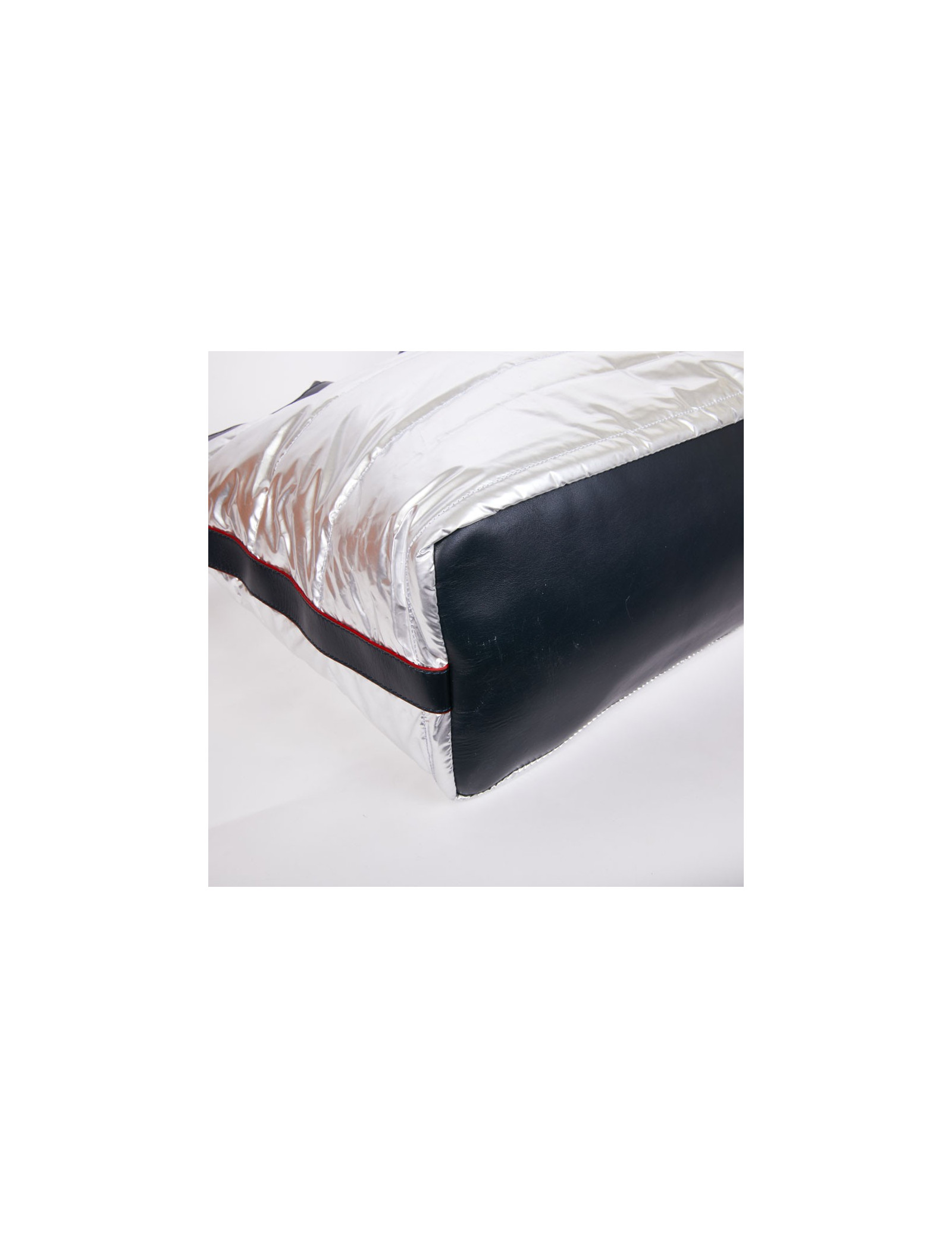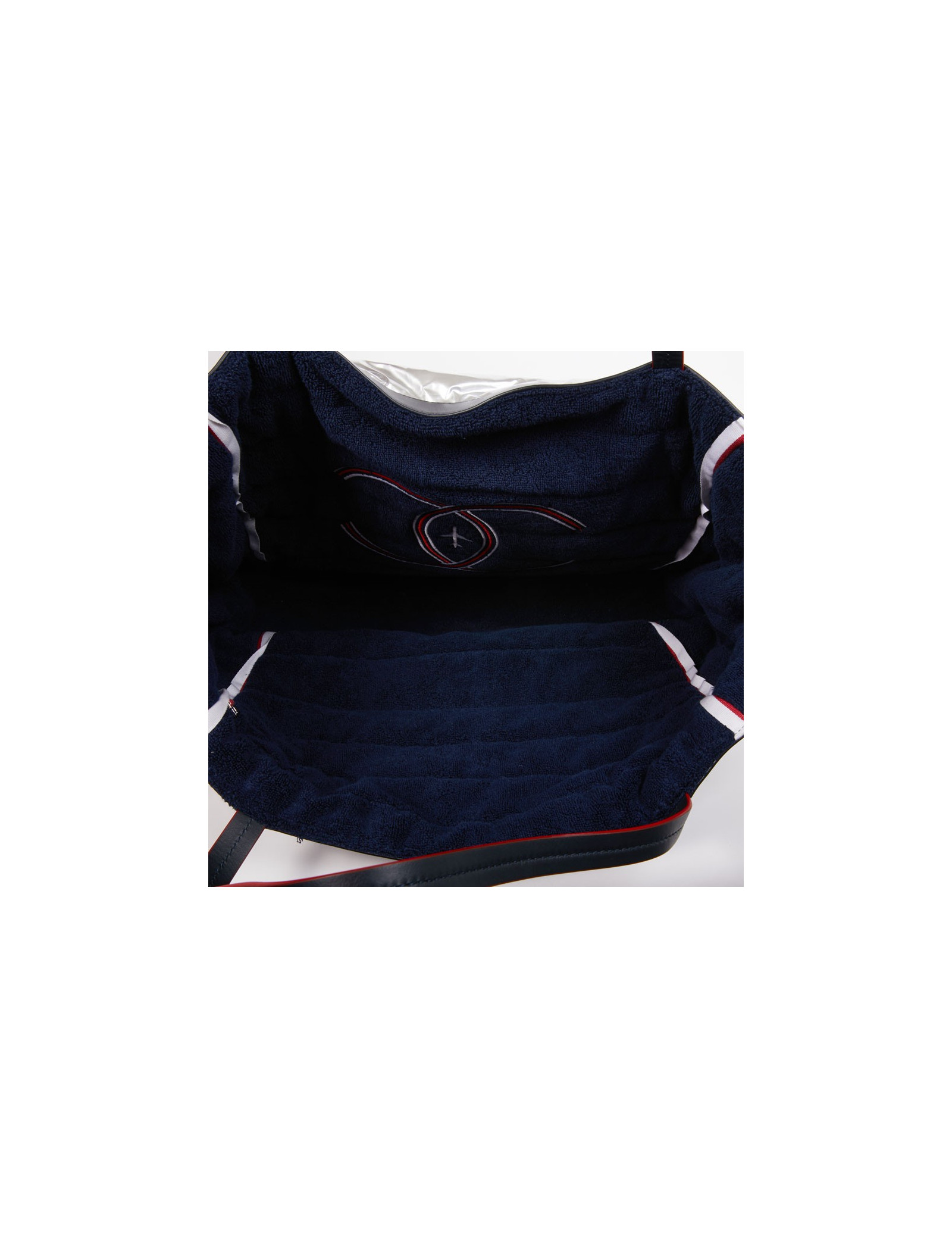 Ce sac de plage d'occasion CHANEL issu de la Collection "Airlines" est de couleur argent et sa serviette de plage bleue marine. Les bordures sont en cuir de veau bleu marine. La doublure intérieure en tissu éponge bleu marine. On y trouve à l'intérieur une pochette zippée amovible ainsi qu'une grande serviette de plage 100% coton bleu marine jamais utilisée.
