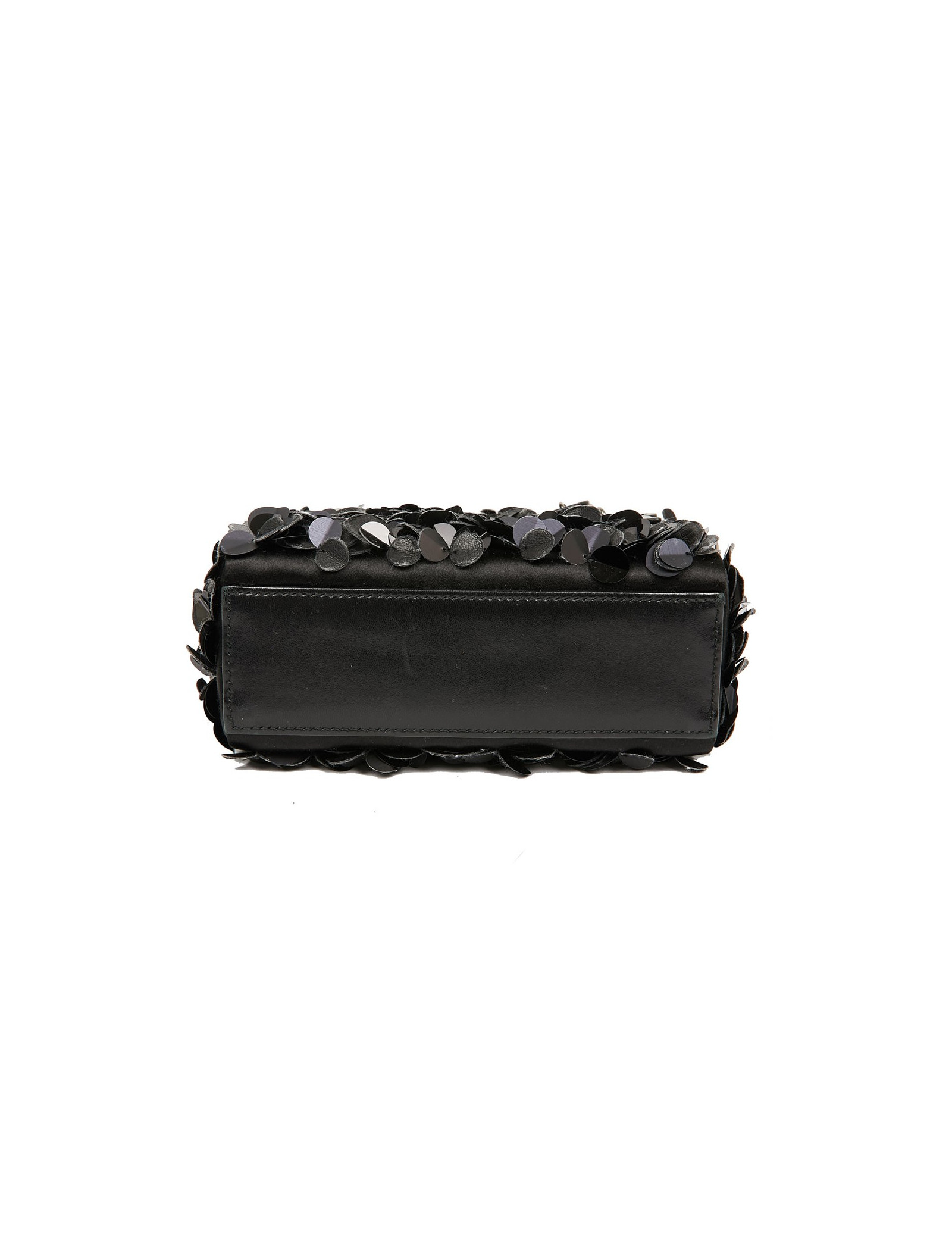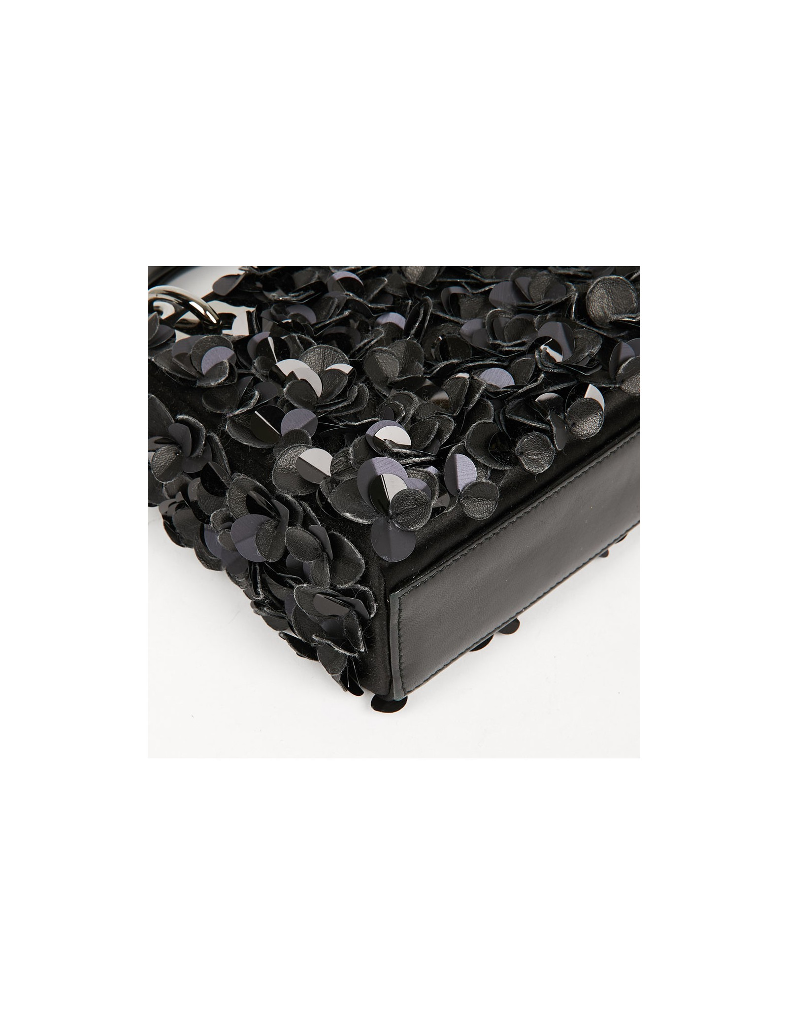 Serti de fleurs en cuir et sequins noirs, ce ravissant sac du soir se porte à la main avec une poignée en cuir d'agneau. L'accastillage est en métal argenté. L'intérieur est en satin noir avec une poche zippée.