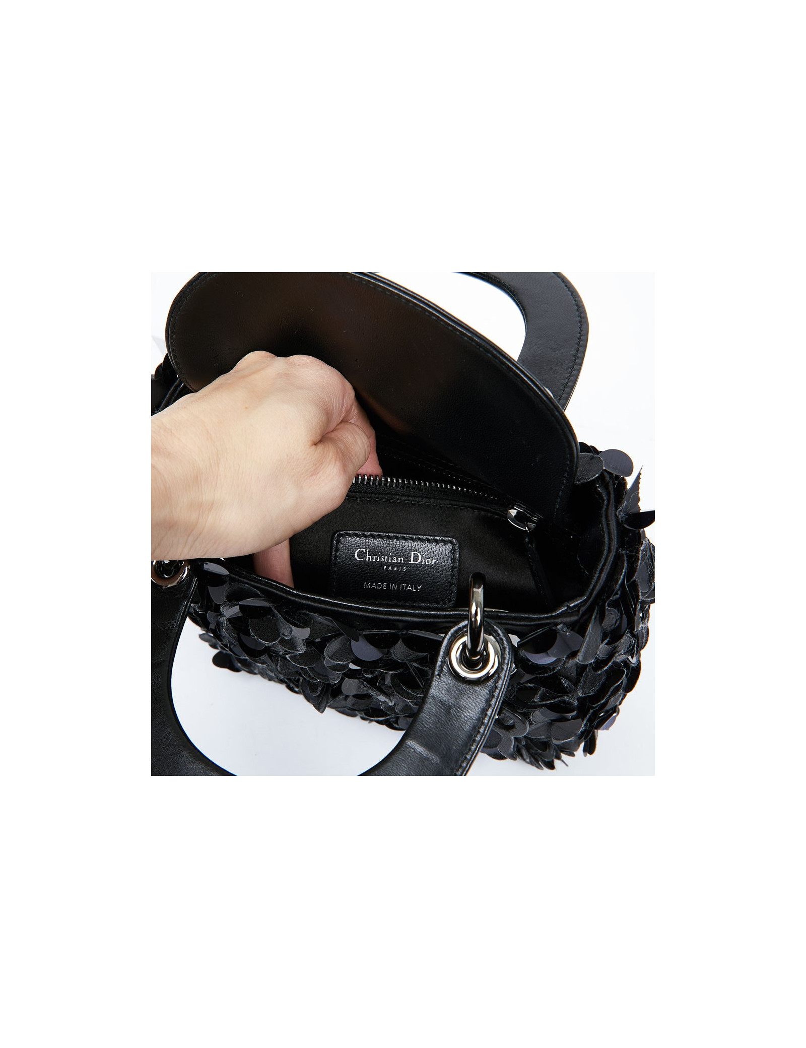 Ses dimensions sont : longueur 18 cm, hauteur 14 cm, profondeur 5 cm. Il manque la lettre O sur les breloques “D I O R “..