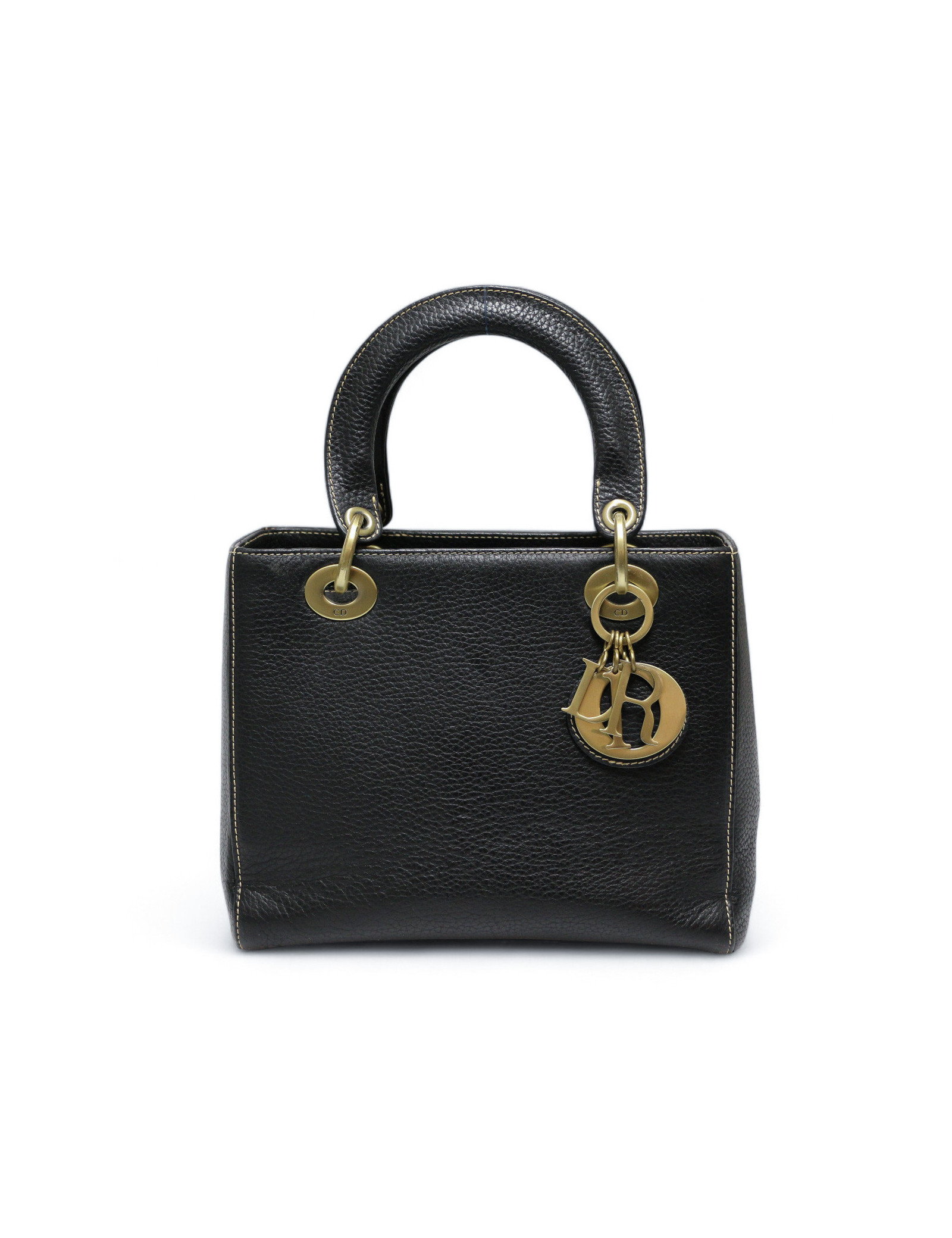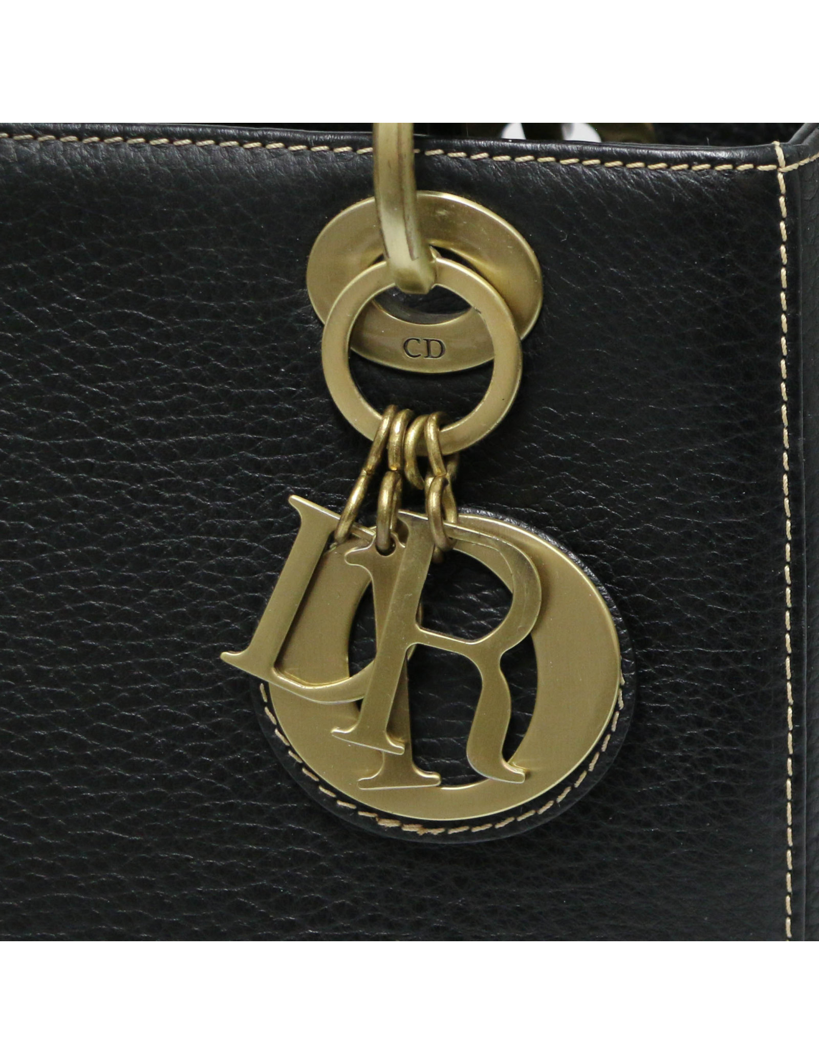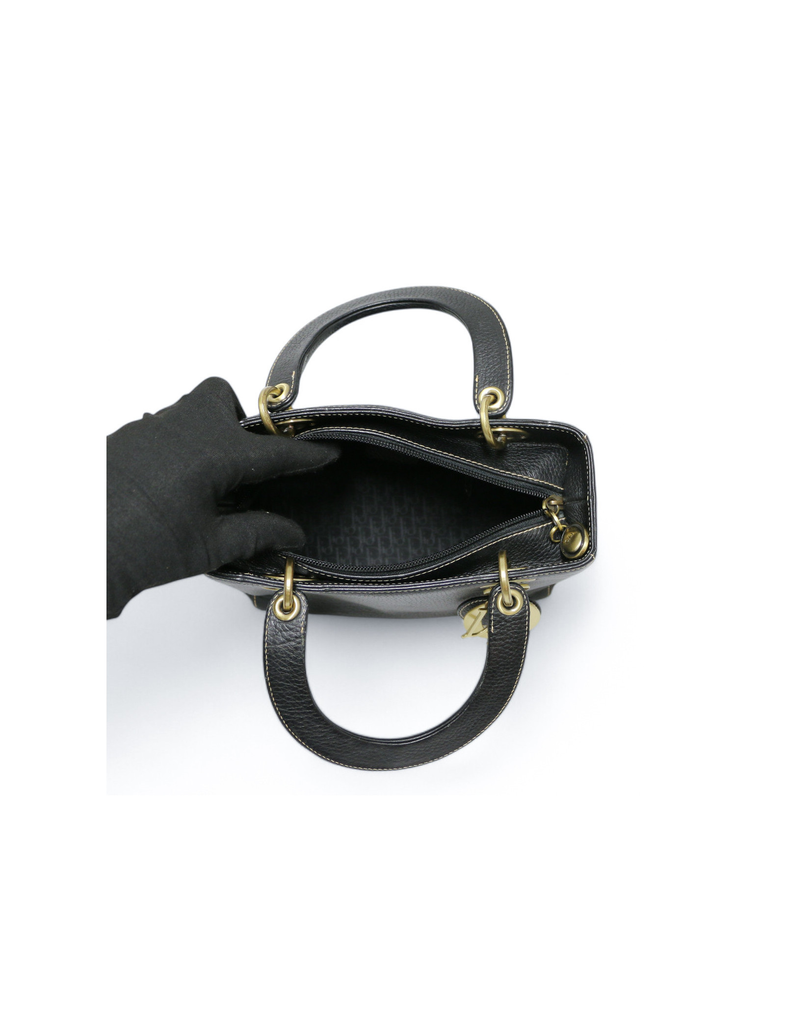 Version en cuir grainé de l'emblématique Lady DIOR, breloques D.I.O.R doré sur l'avant du sac, fermeture à glissière et une poche zippée à l'intérieur du sac