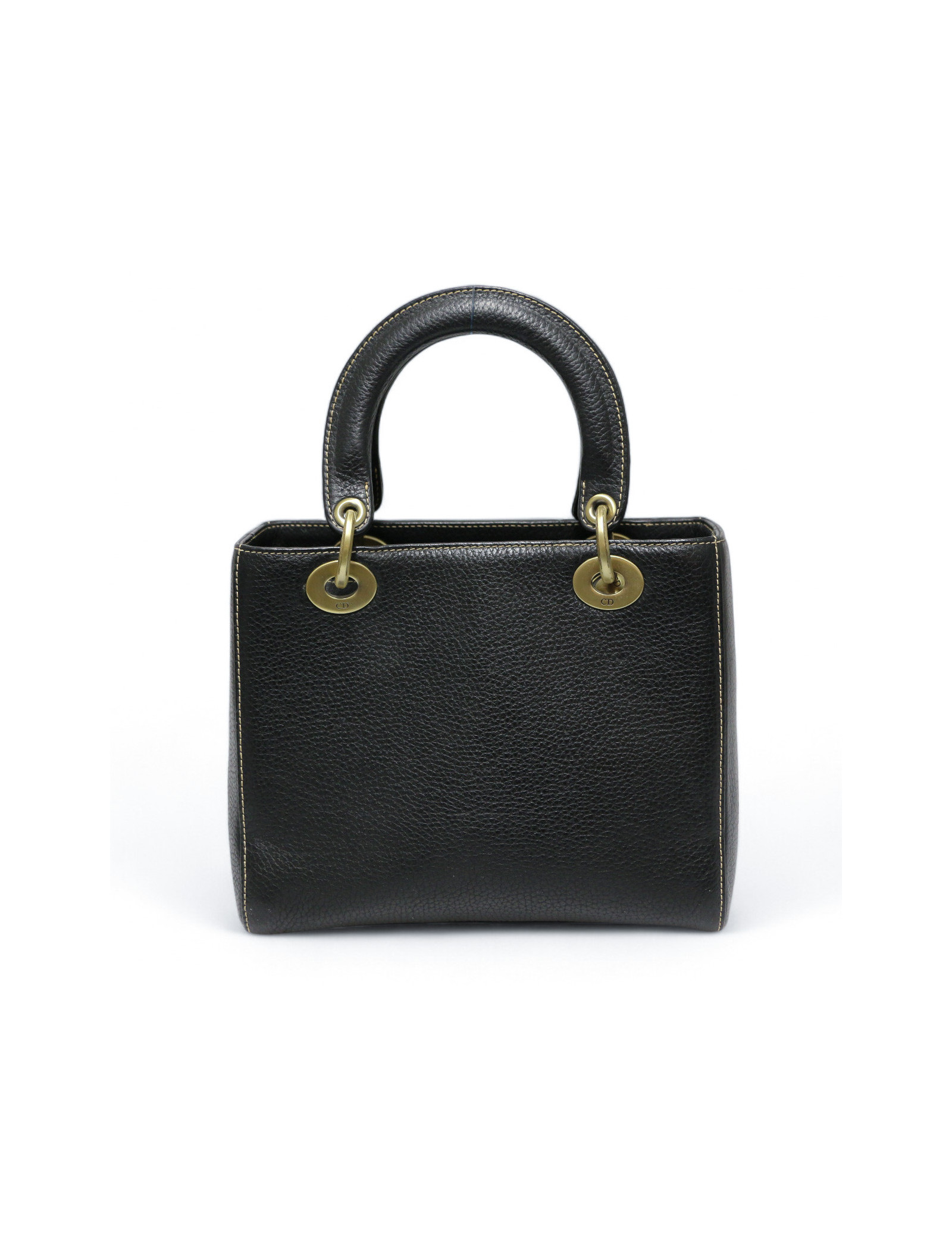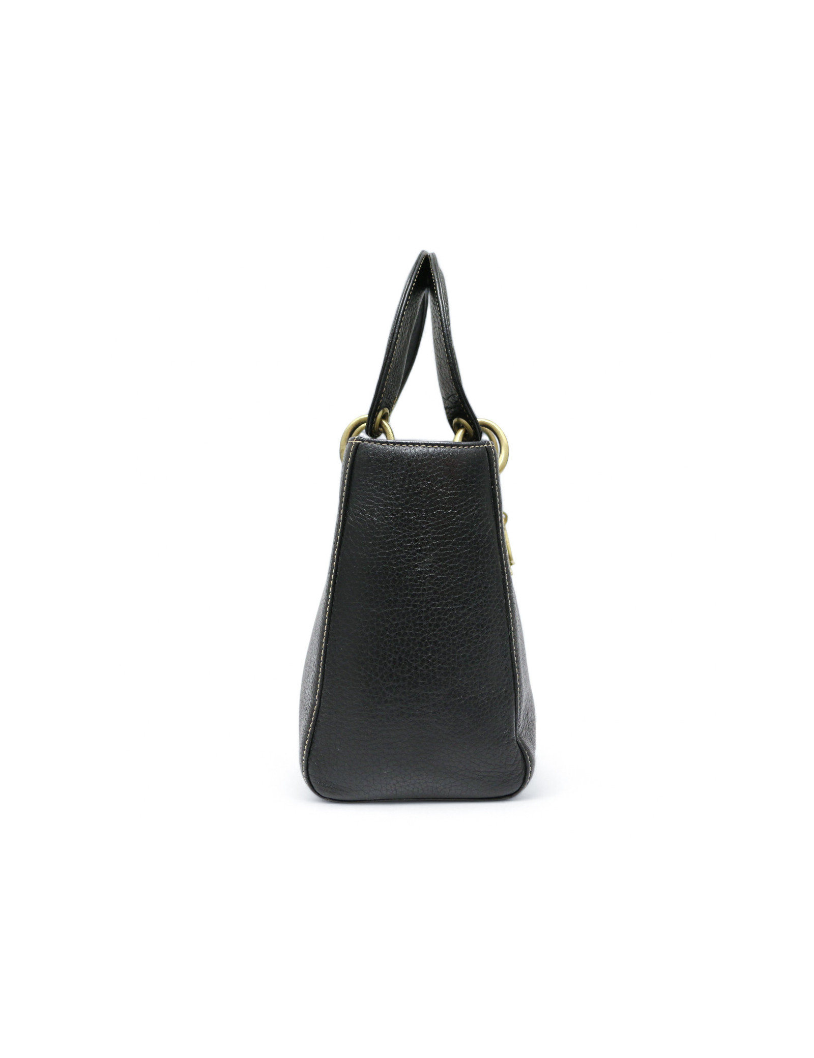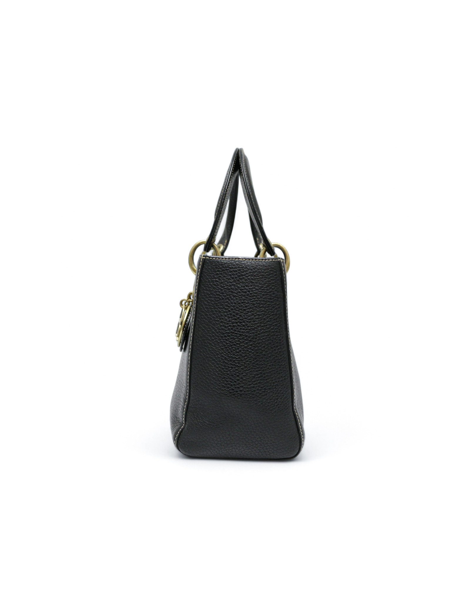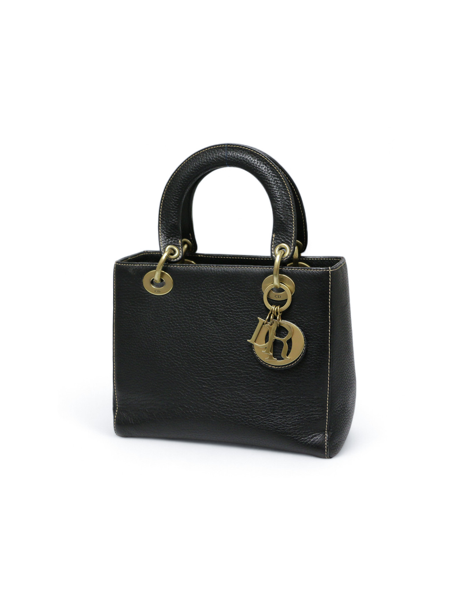 Version en cuir grainé de l'emblématique Lady DIOR, breloques D.I.O.R doré sur l'avant du sac, fermeture à glissière et une poche zippée à l'intérieur du sac