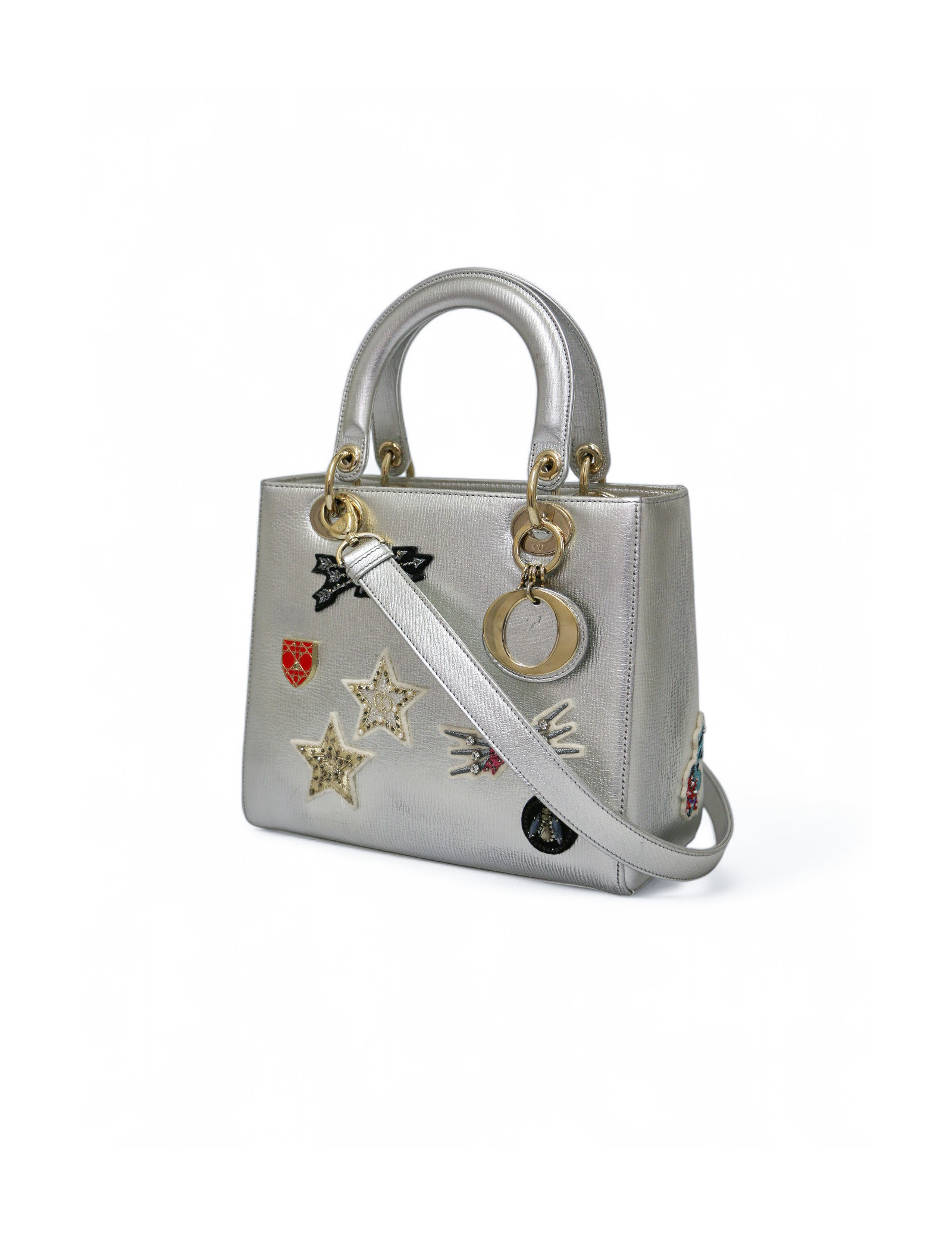 écussons en tissu et en métal accolés sur l'avant du sac, breloques D.I.O.R., fermeture à glissière.