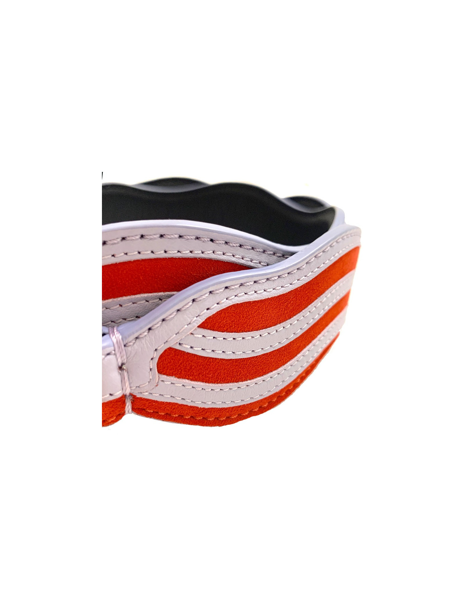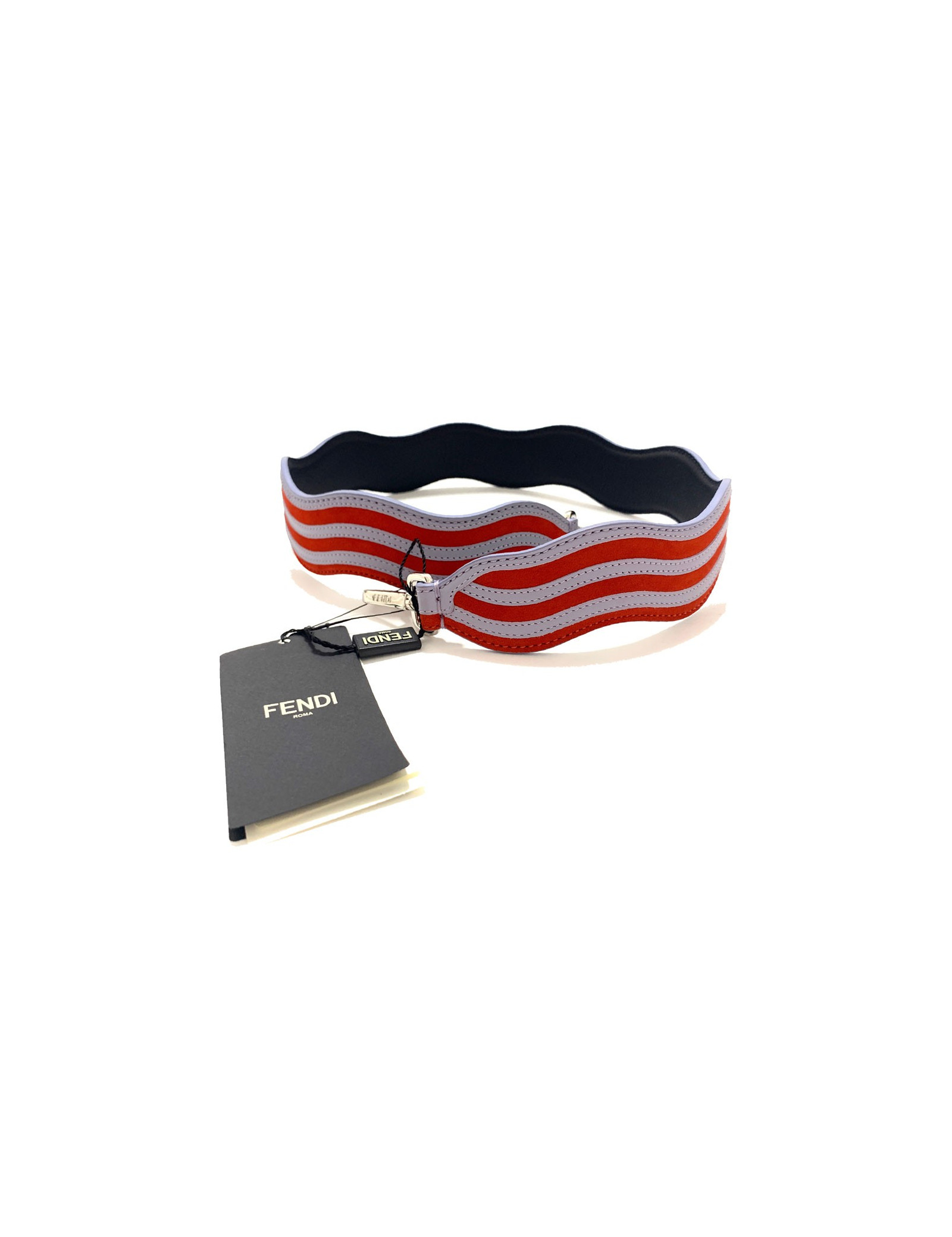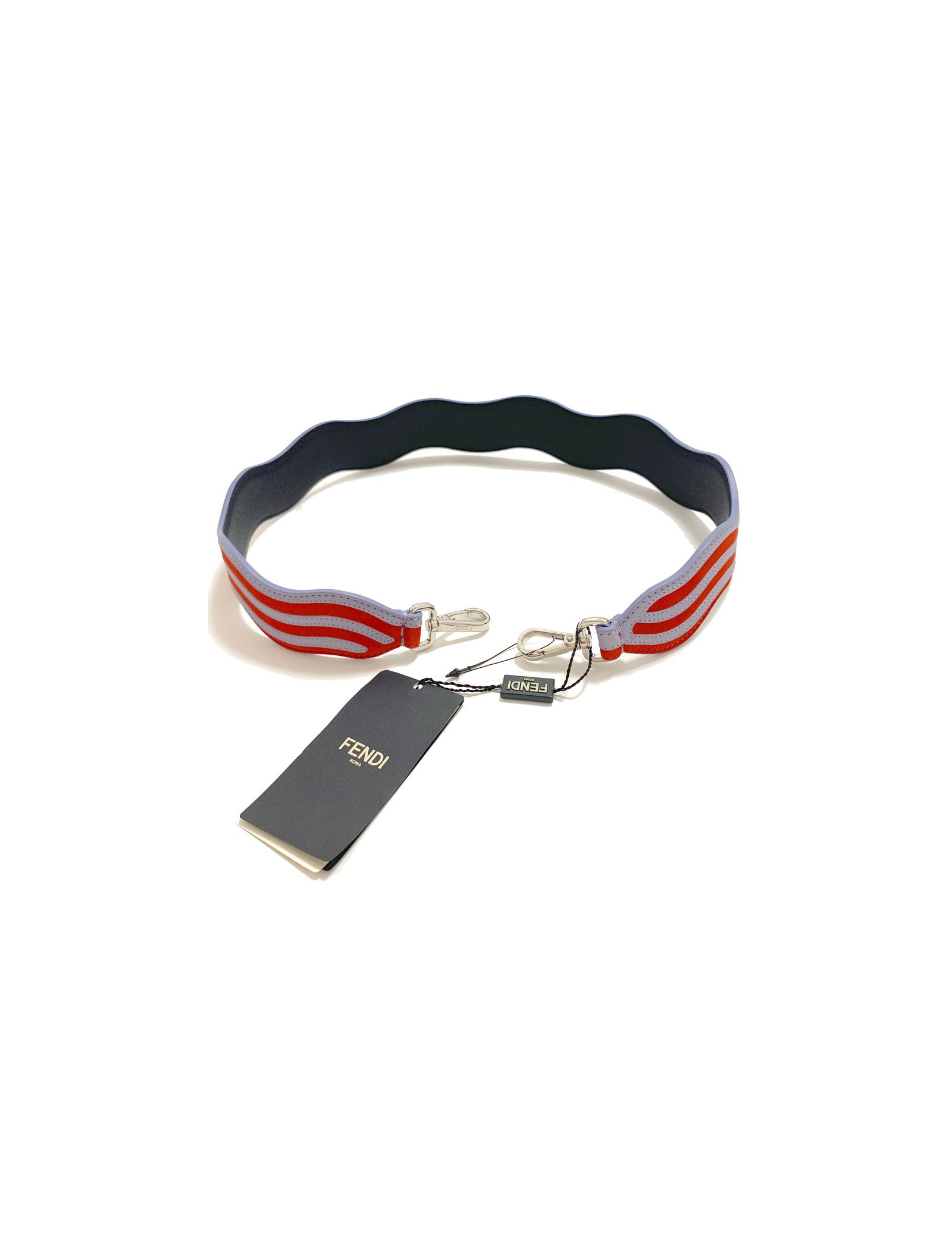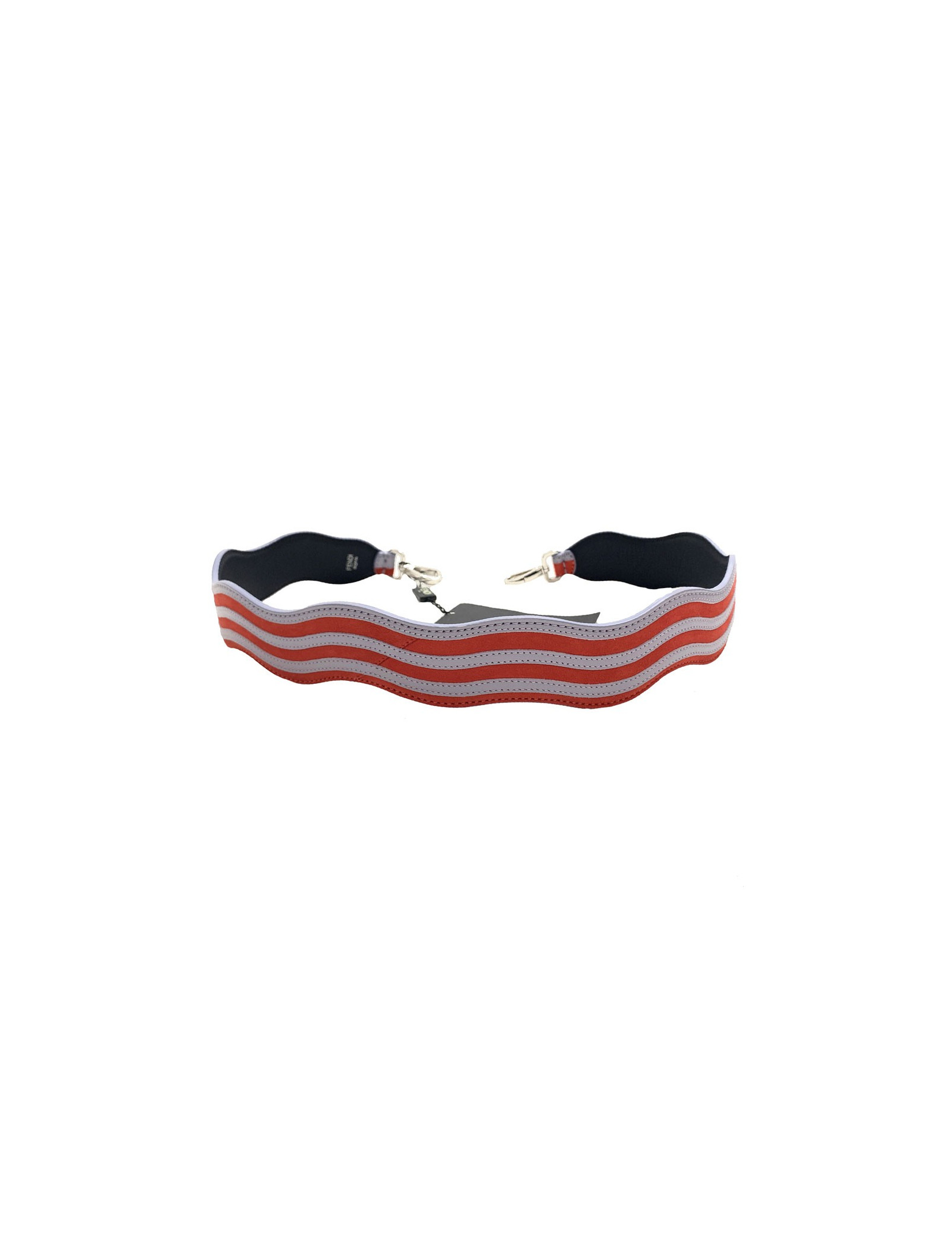 Bandoulière FENDI, modèle Strap You, en cuir et suède à rayures gris clair et rouge. La bandoulière a un effet ondulé. La lanière a un double mousqueton finition palladium, à utiliser sur tous les sacs à attaches.