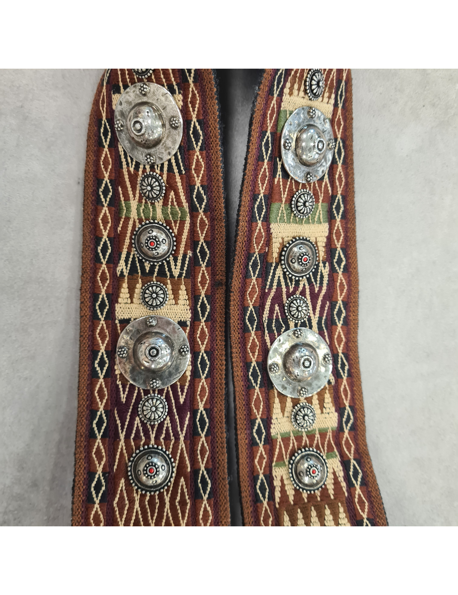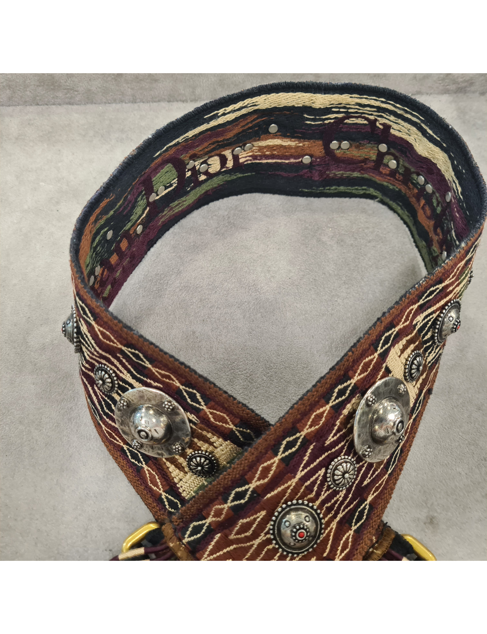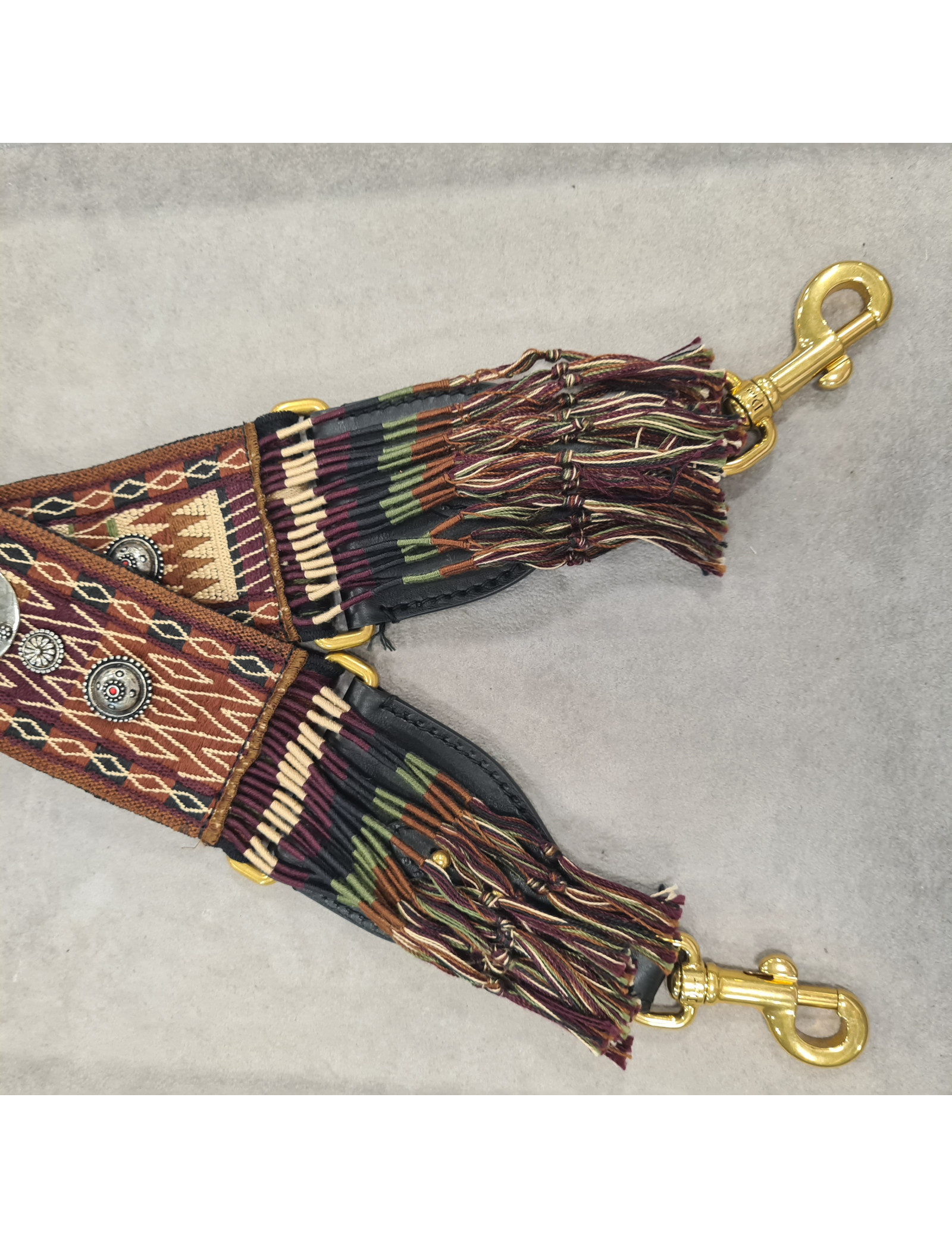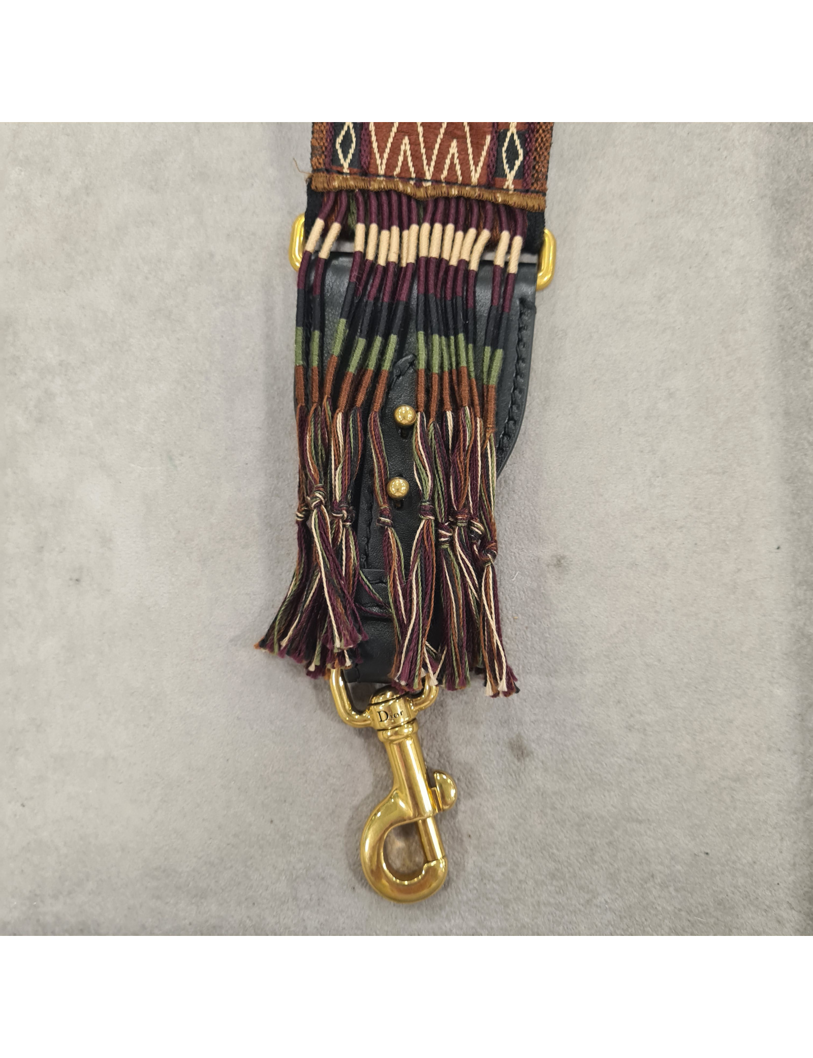 Bandoulière amovible rehaussée de franges DIOR pour sac à main aux couleurs de l'hiver bordeaux, marron, noir et vert. Les finitions sont en métal doré et les médaillons ornant cet accessoire sont en argent. Sur la face intérieure "CHRISTIAN DIOR Paris" est brodée. Maria Grazia Chiuri en a fait sa signature.