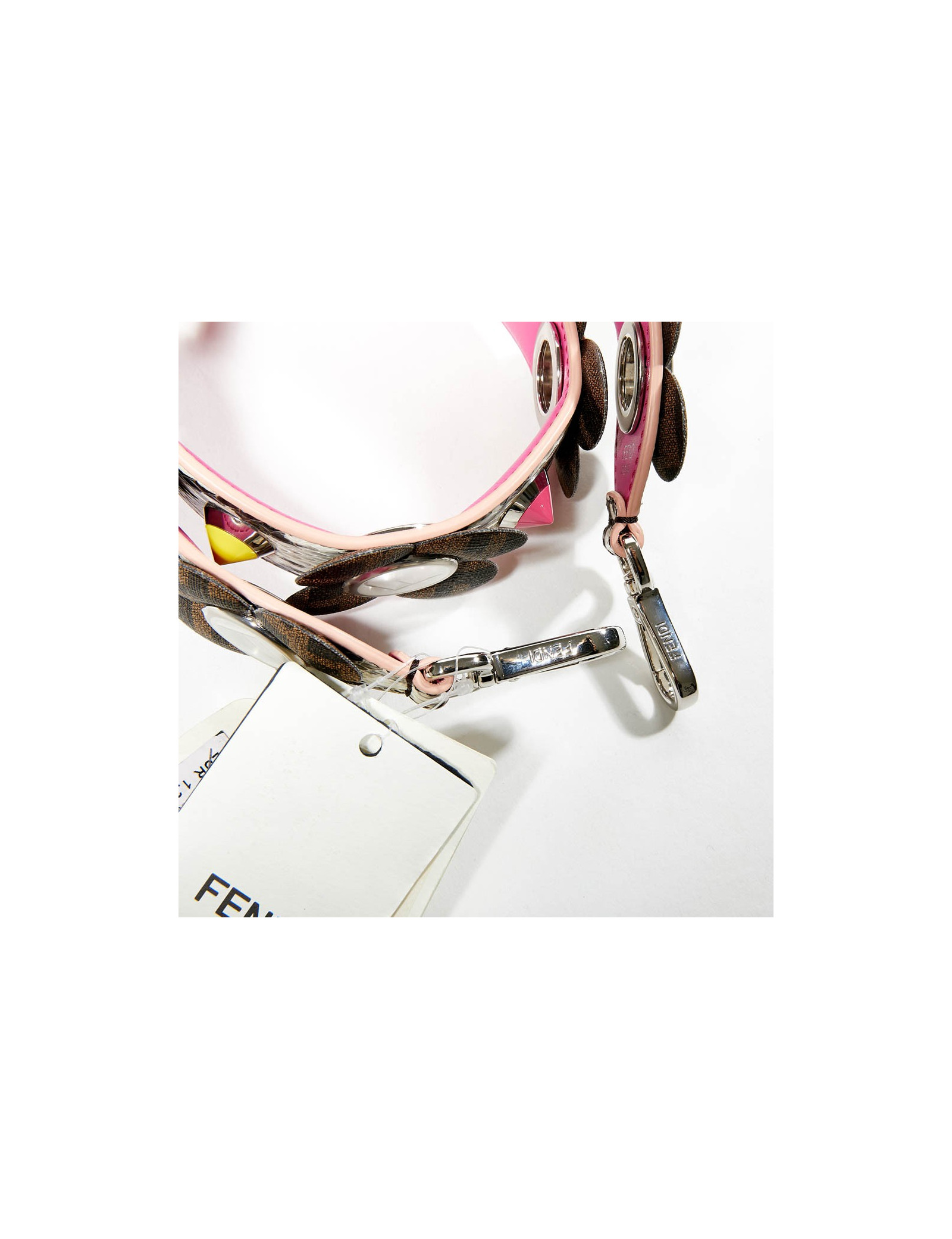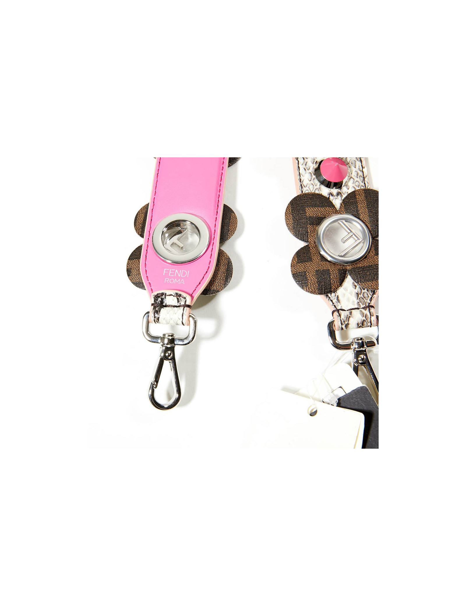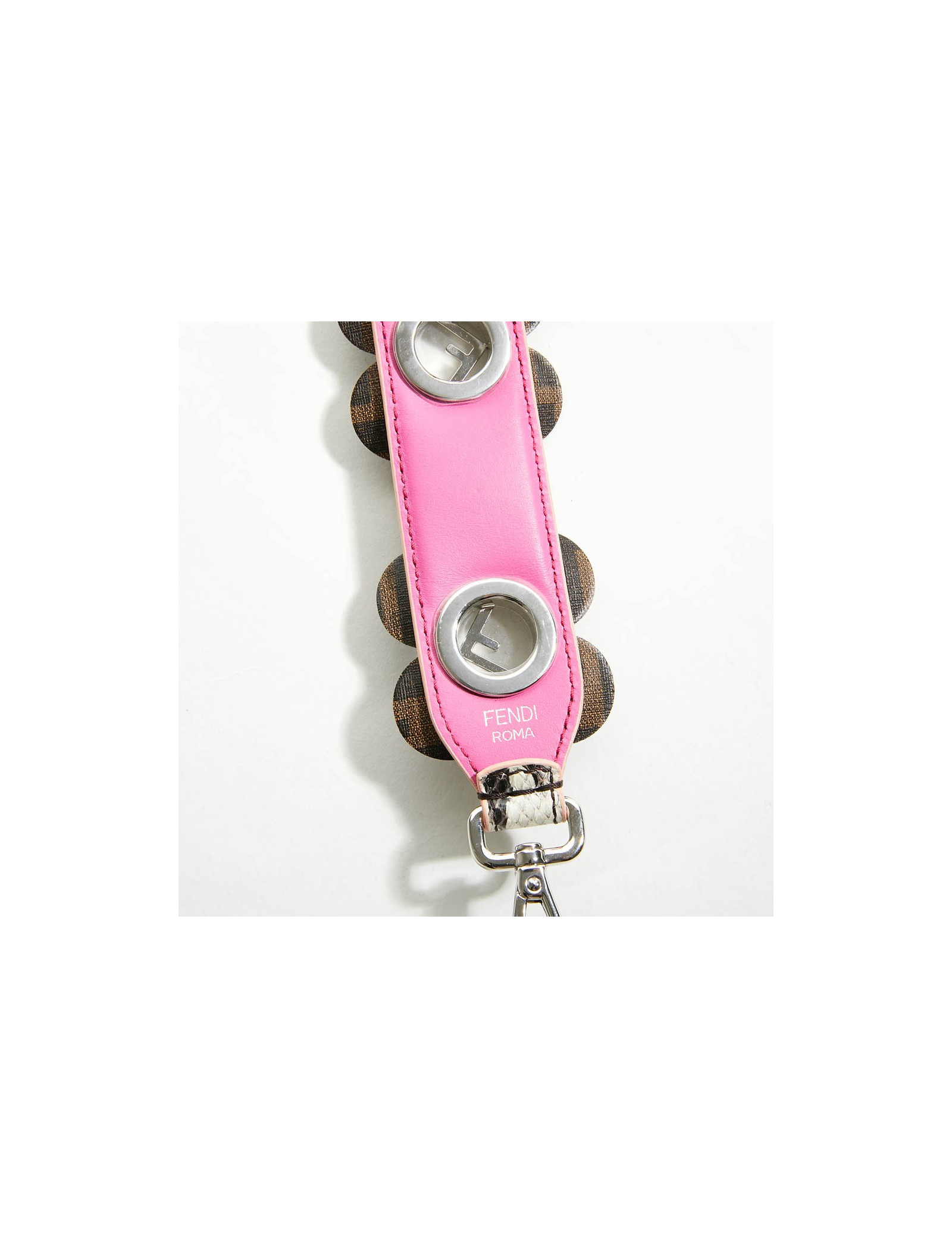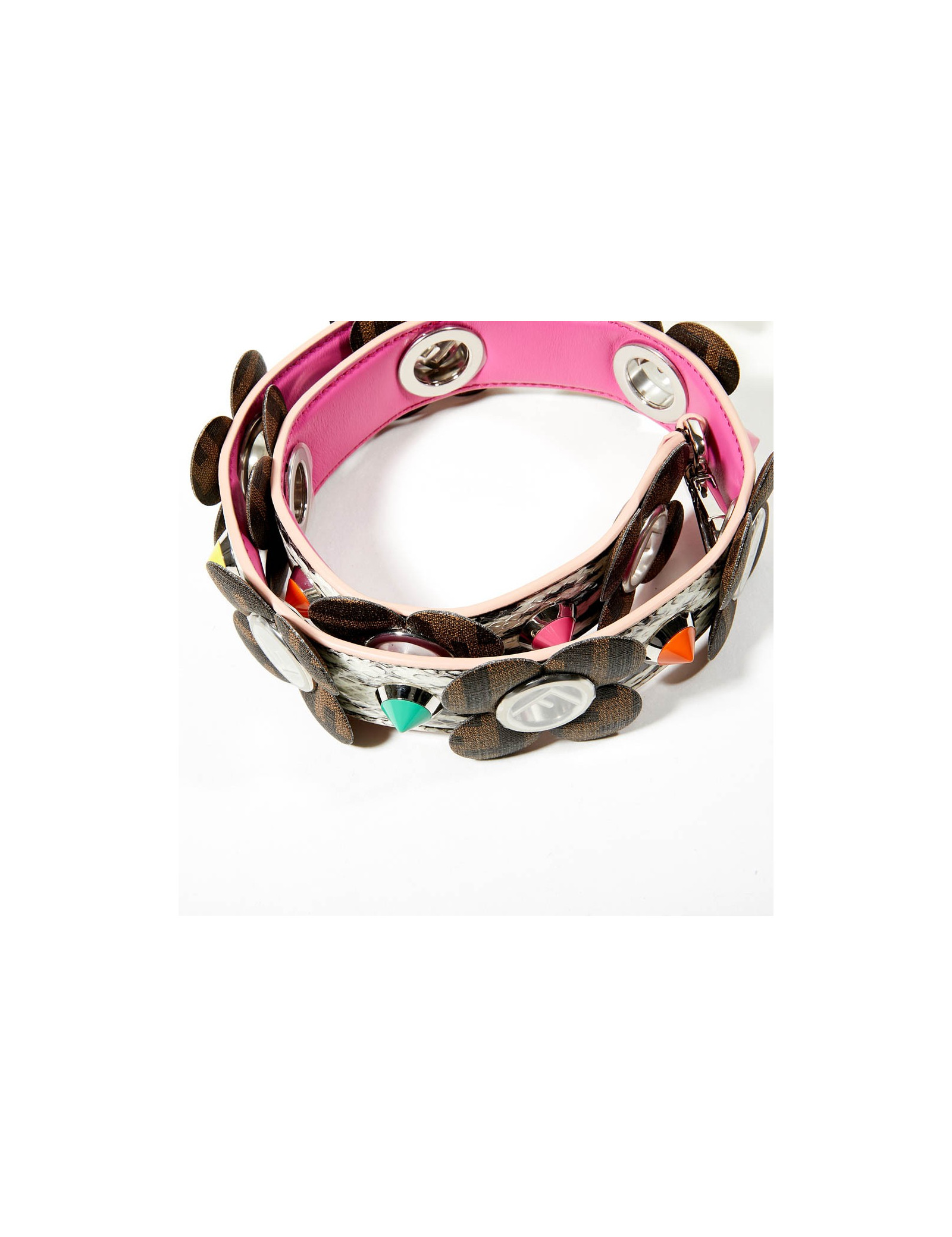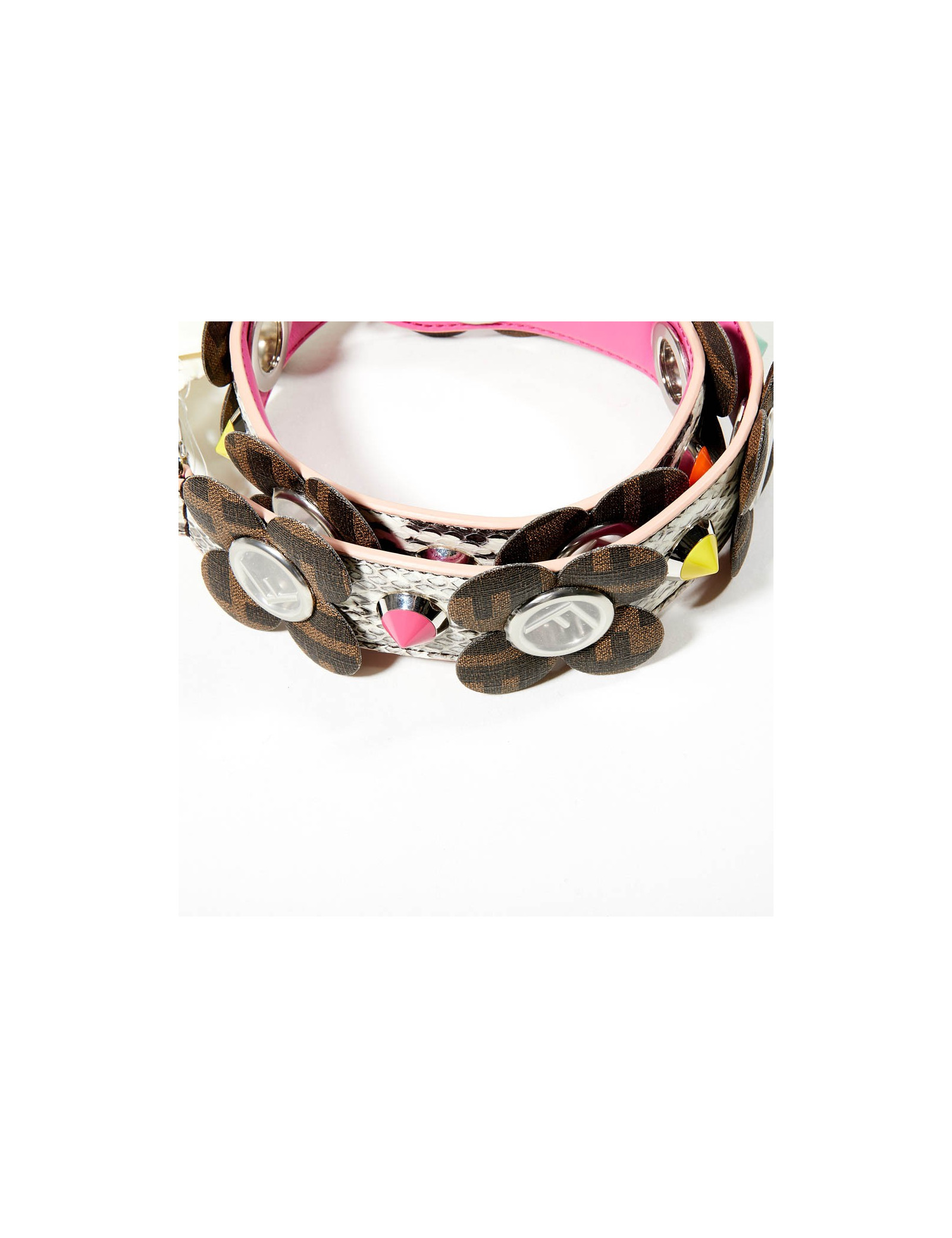 Strap Fendi, en cuir python gris, sur lequel sont fixées des fleurs monogramme FF.