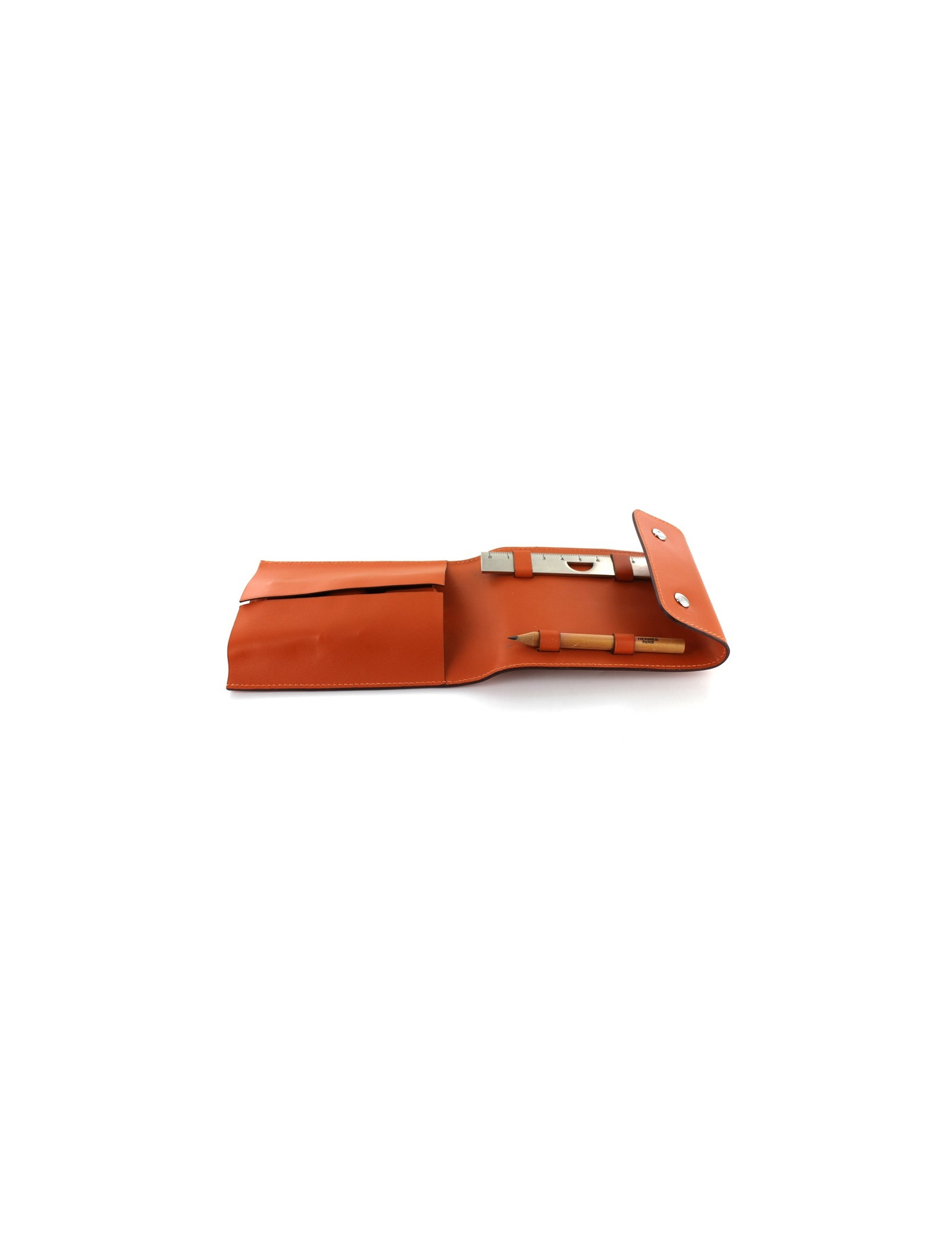 Trousse de bureau HERMES "In the pocket" en veau chamonix couleur potiron, finitions en aluminium. A l'intérieur de cette pochette, vous trouverez une règle (10 cm), un crayon à papier, une mini agrafeuse, ainsi qu'une gomme et un taille-crayon miniatures. Un très joli cadeau sous le sapin de noël ! Vendu avec son dustbag d'origine. "S"
