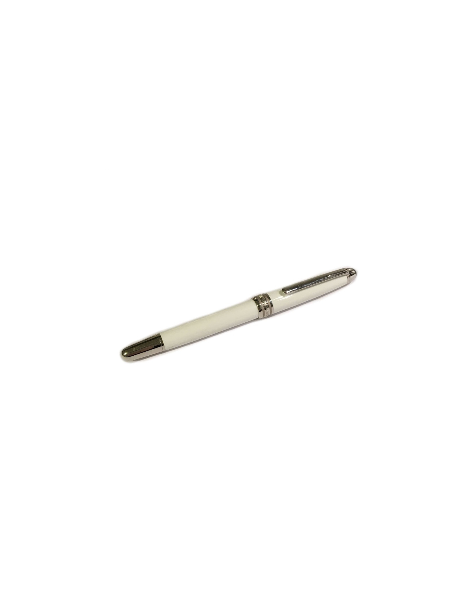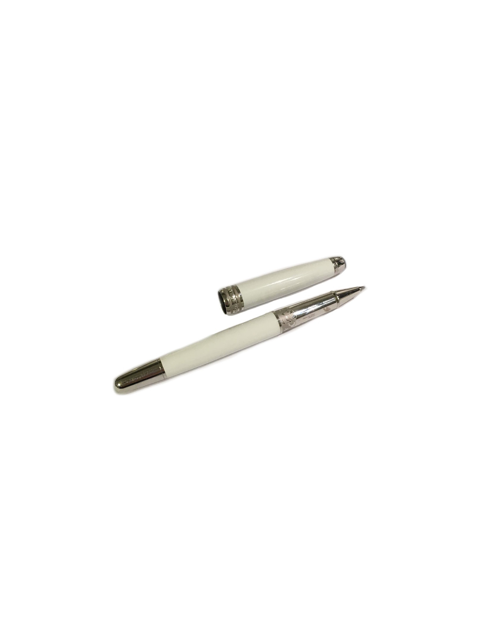 Rollerball Meisterstück tribute to the Montblanc. Le corps et capuchon sont en laque blanche. Dessin gravé du massif du Mont Blanc réalisé au laser. Agrafe platinée. L'emblème MONT-BLANC est en quartz blanc.