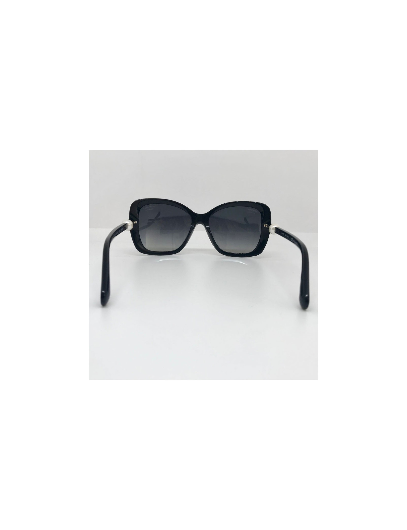 Très belle paire de lunettes de soleil CHANEL en acétate noir. Les verres ont une couleur foncée en dégradé et sont polarisés. Une perle nacrée se trouve sur chaque branche (voir photo).