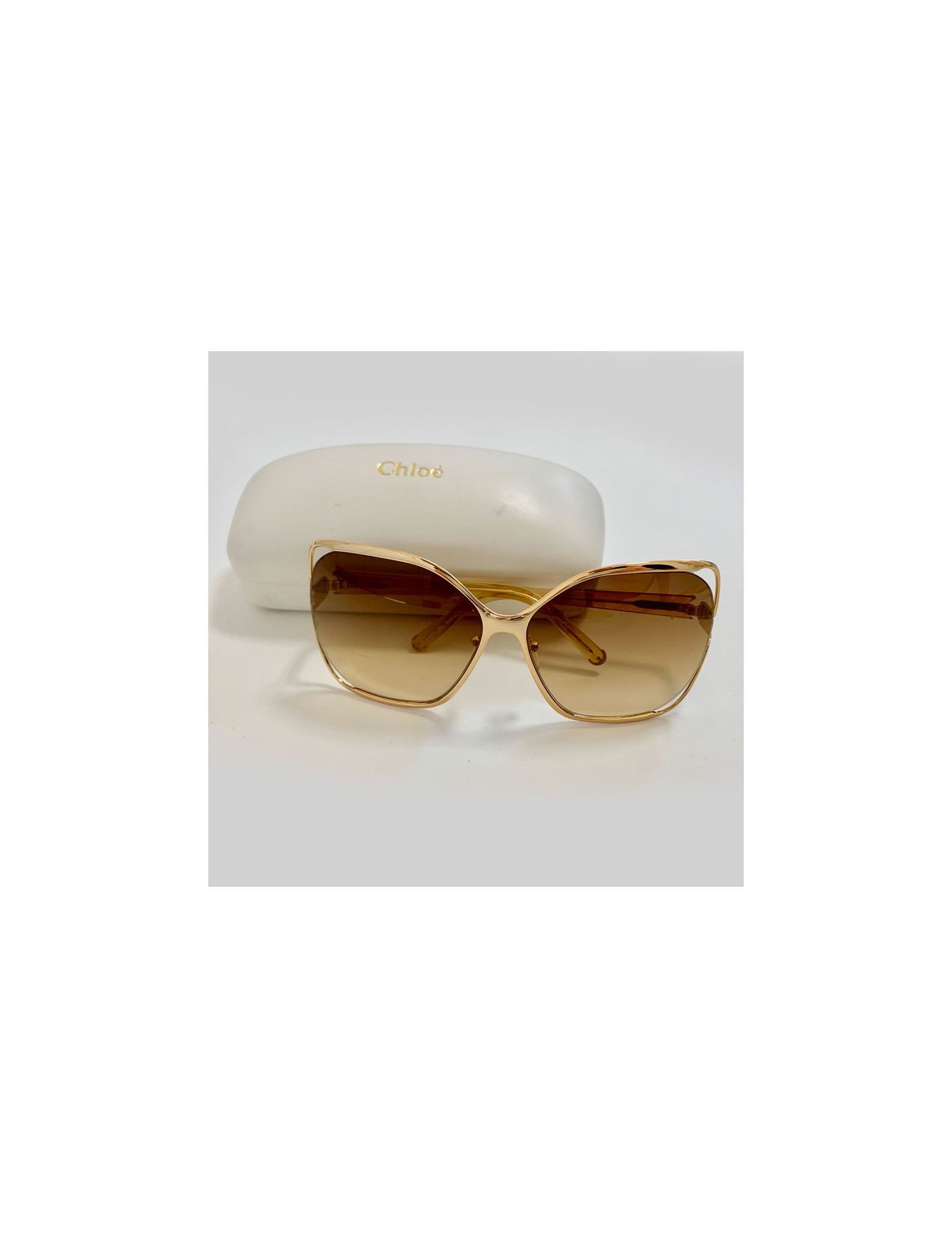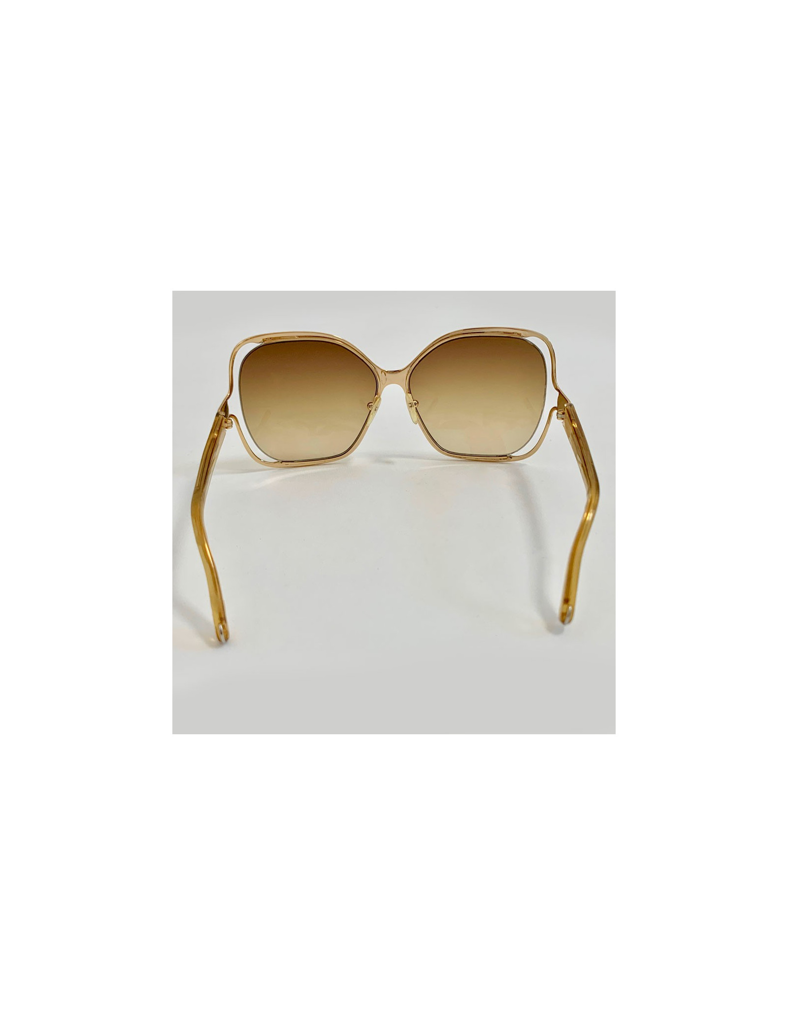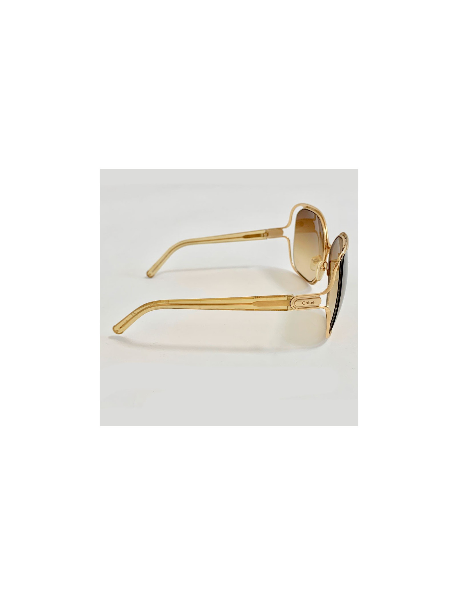 Modèle incontournable de la Maison CHLOE, lunettes de soleil oversize carrées CE108S taille 62/14. La monture est en plastique doré, les verres sont dans un dégradé de marron. Made in Italy.