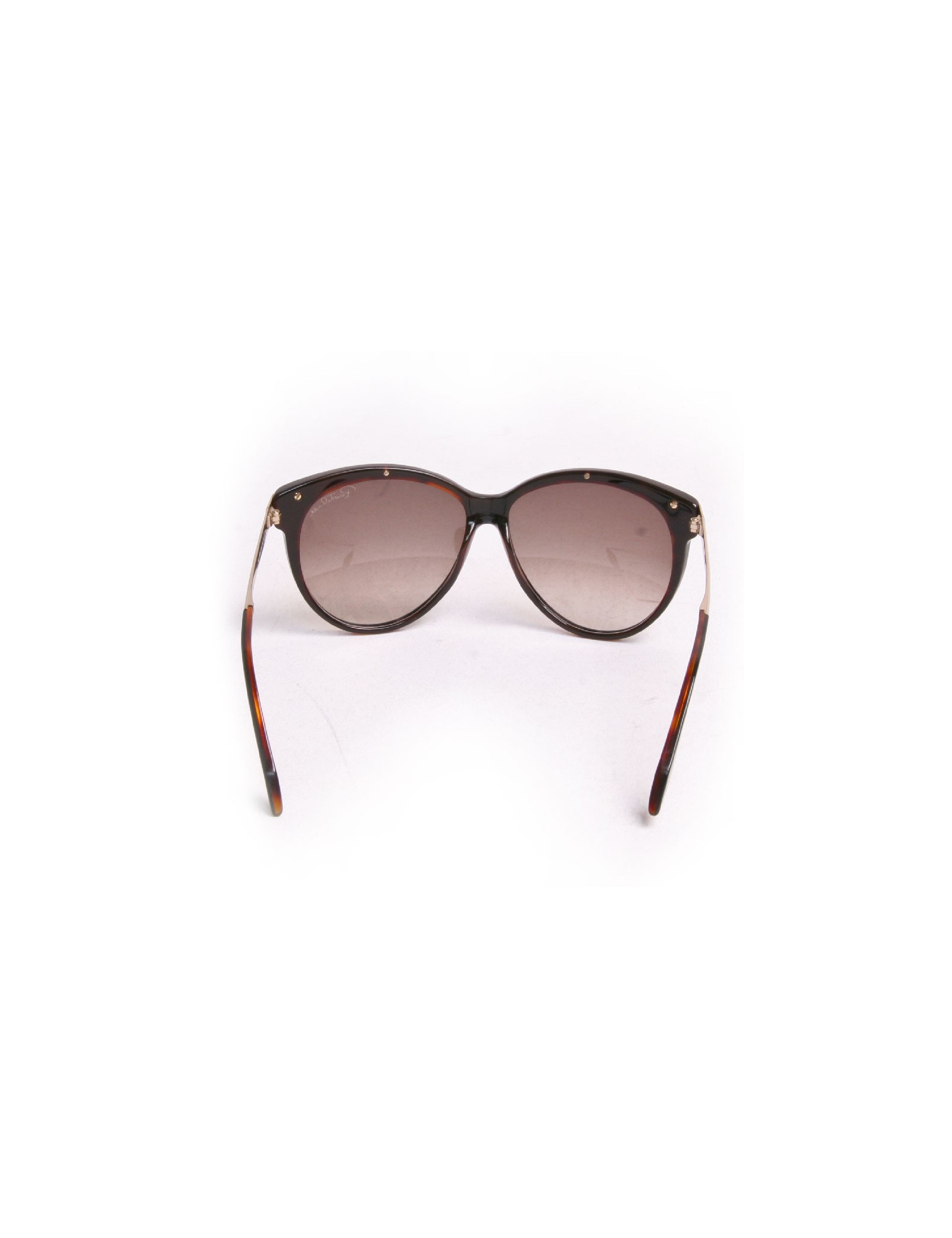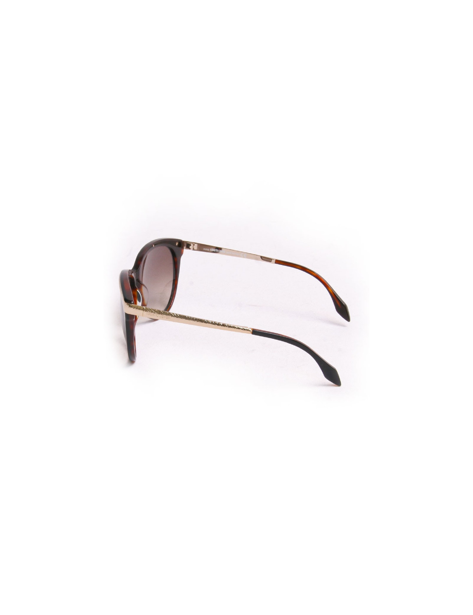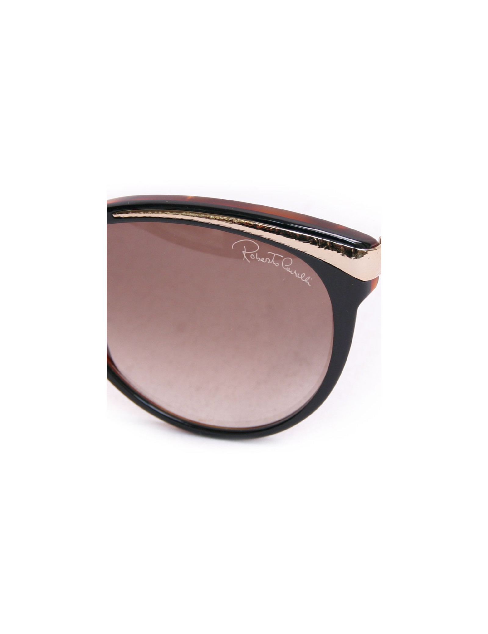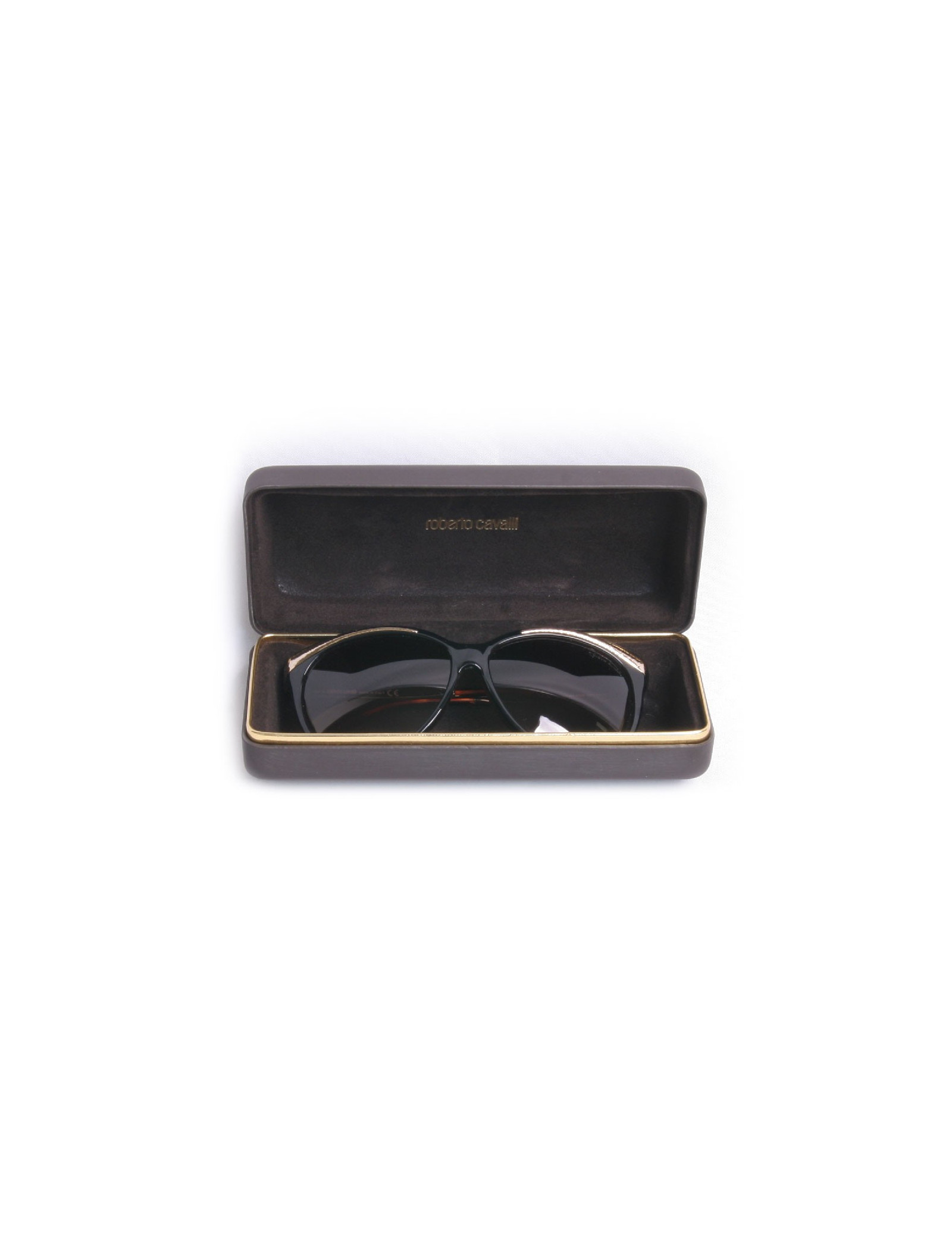 Lunettes de soleil ROBERTO CAVALLILunettes de soleil Roberto Cavalli, verres et cercles de couleur noire, l'intérieur est de couleur marron glacé, les demi- branches sont de couleur dorée. Des micros rayures sont présentent sur les verres. Très bon état.