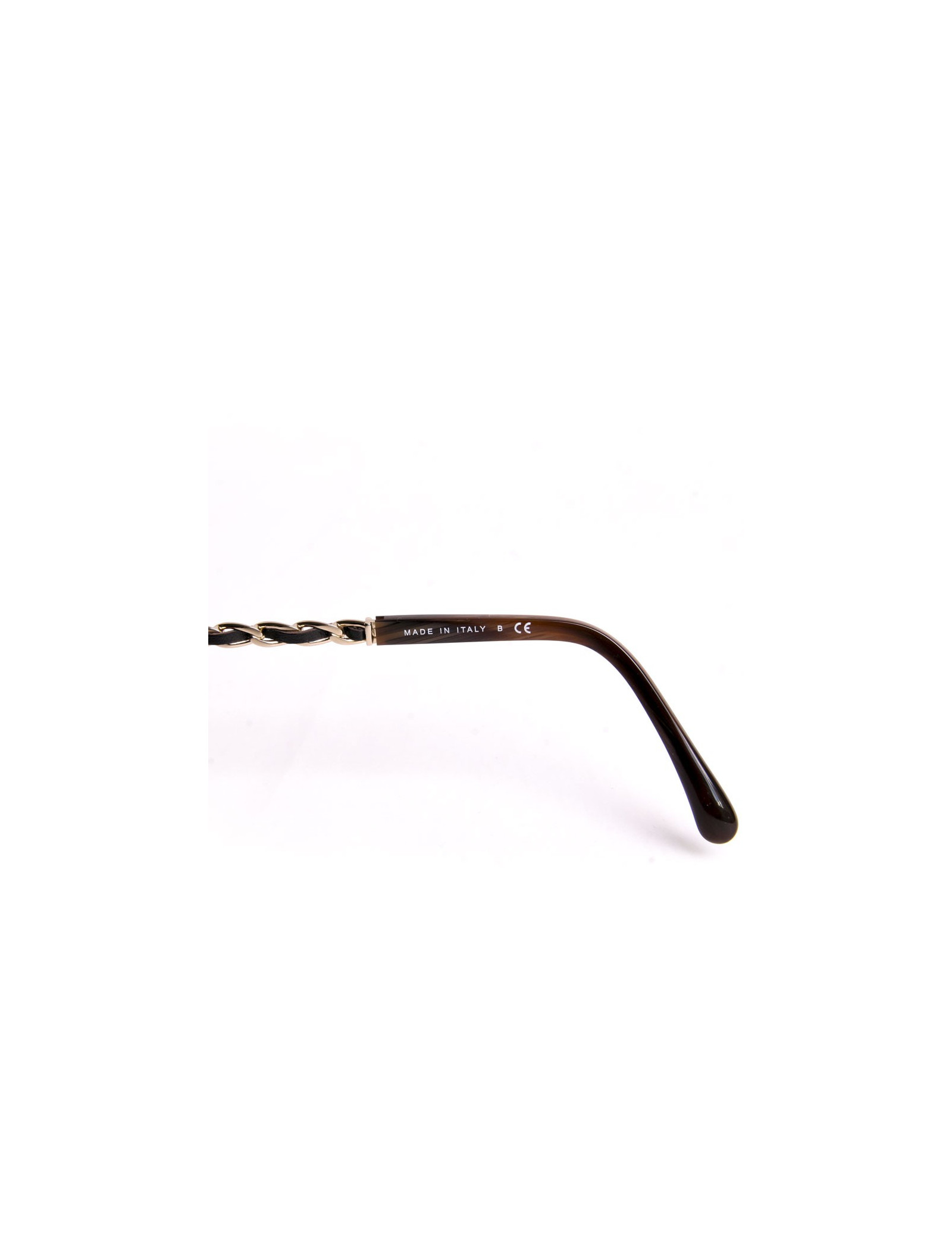 Sublime paire de lunettes de soleil Chanel, la monture est marron imitation bois, les branches sont en chaîne de métal doré entrelacées d'une fine bande de cuir marron glacé. Meilleur prix public : 230 euros.