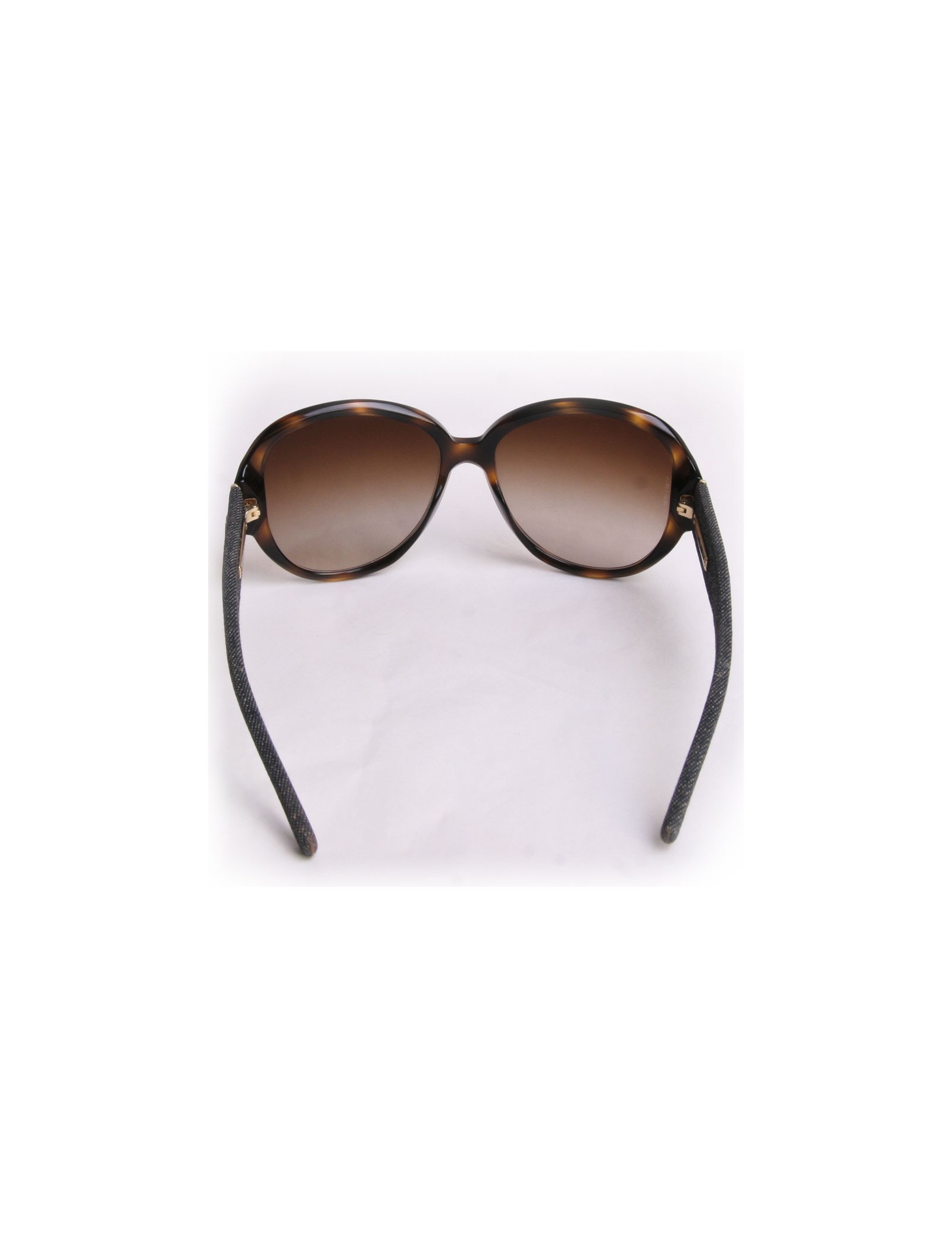 Lunettes de soleil foncées Chanel avec contour façon écaille de tortue et branches gainées de tissu en jean's bleu. La bijouterie est dorée.