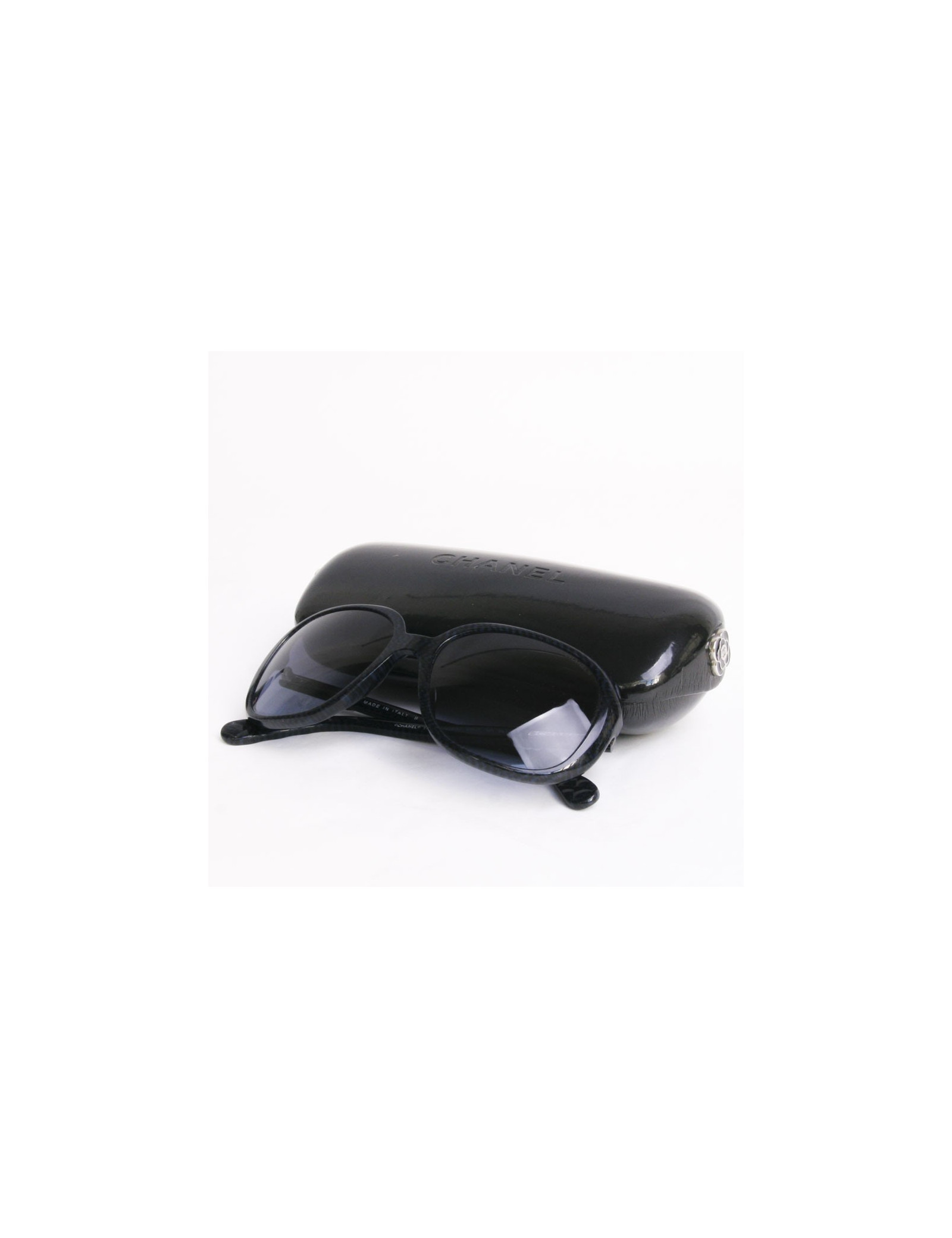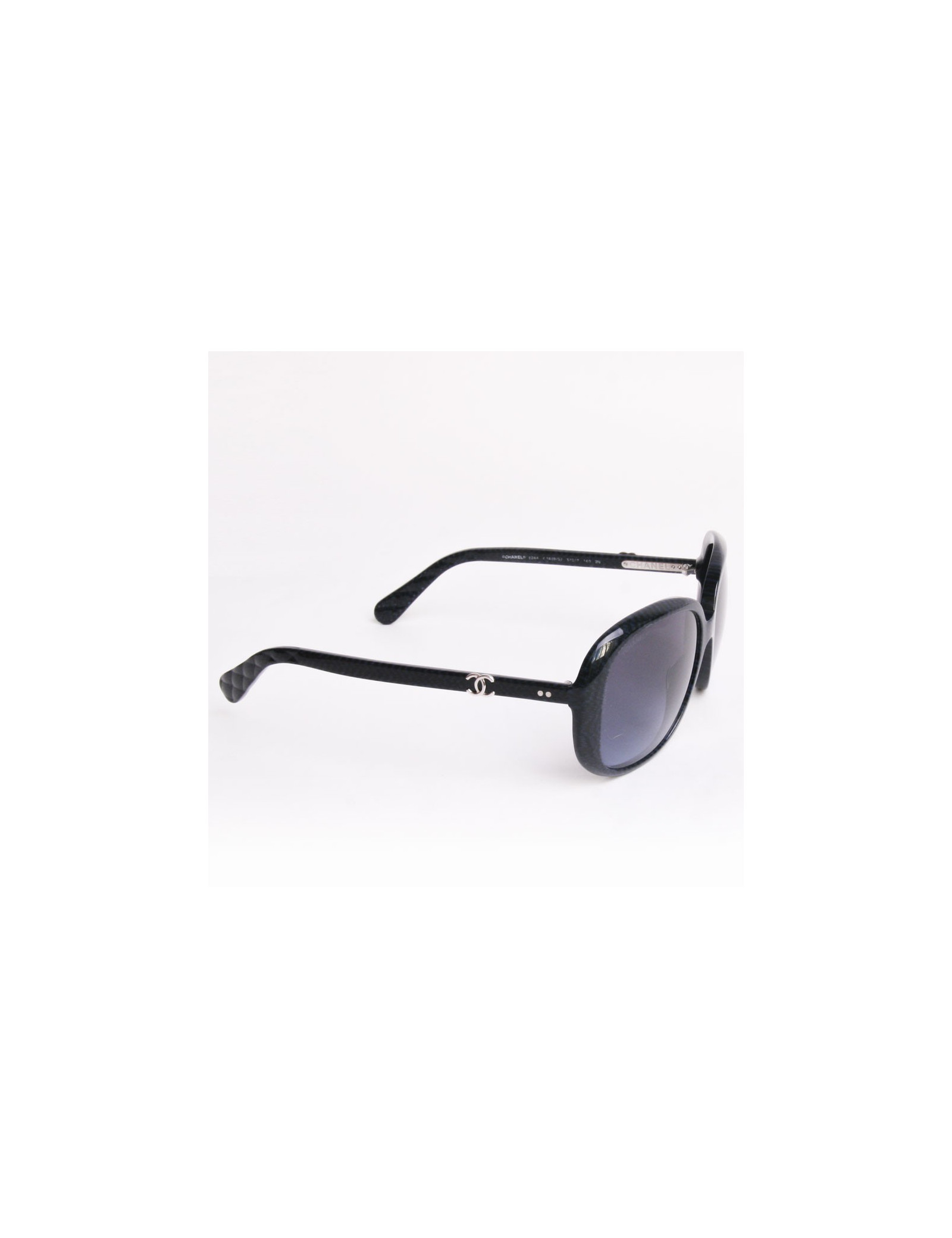 Lunettes de soleil Chanel,fond bleu marine et striées de noir. les verres sont bleu foncé. Les branches se terminent façon cuir matelassé, bijouterie métal argenté