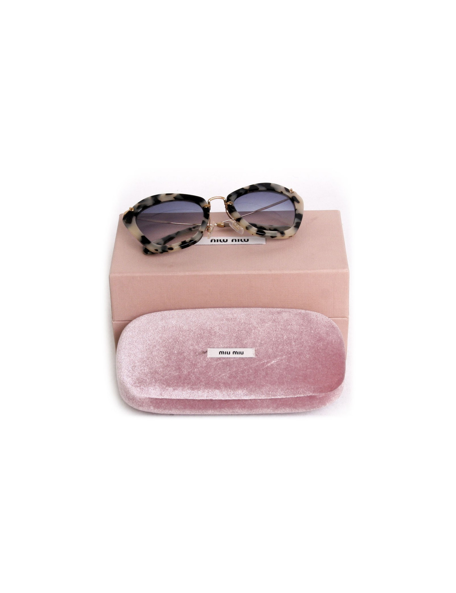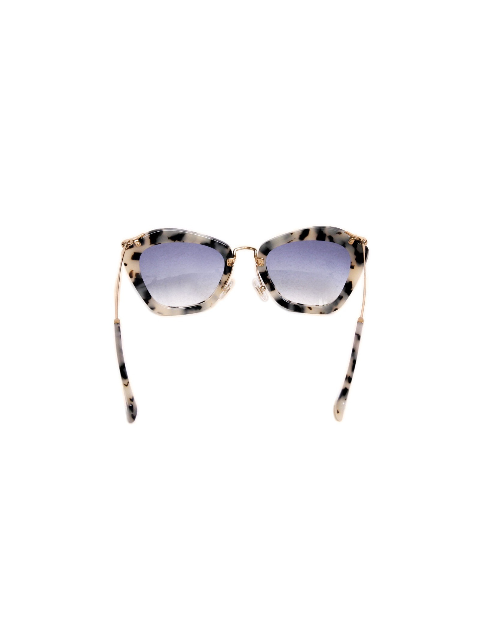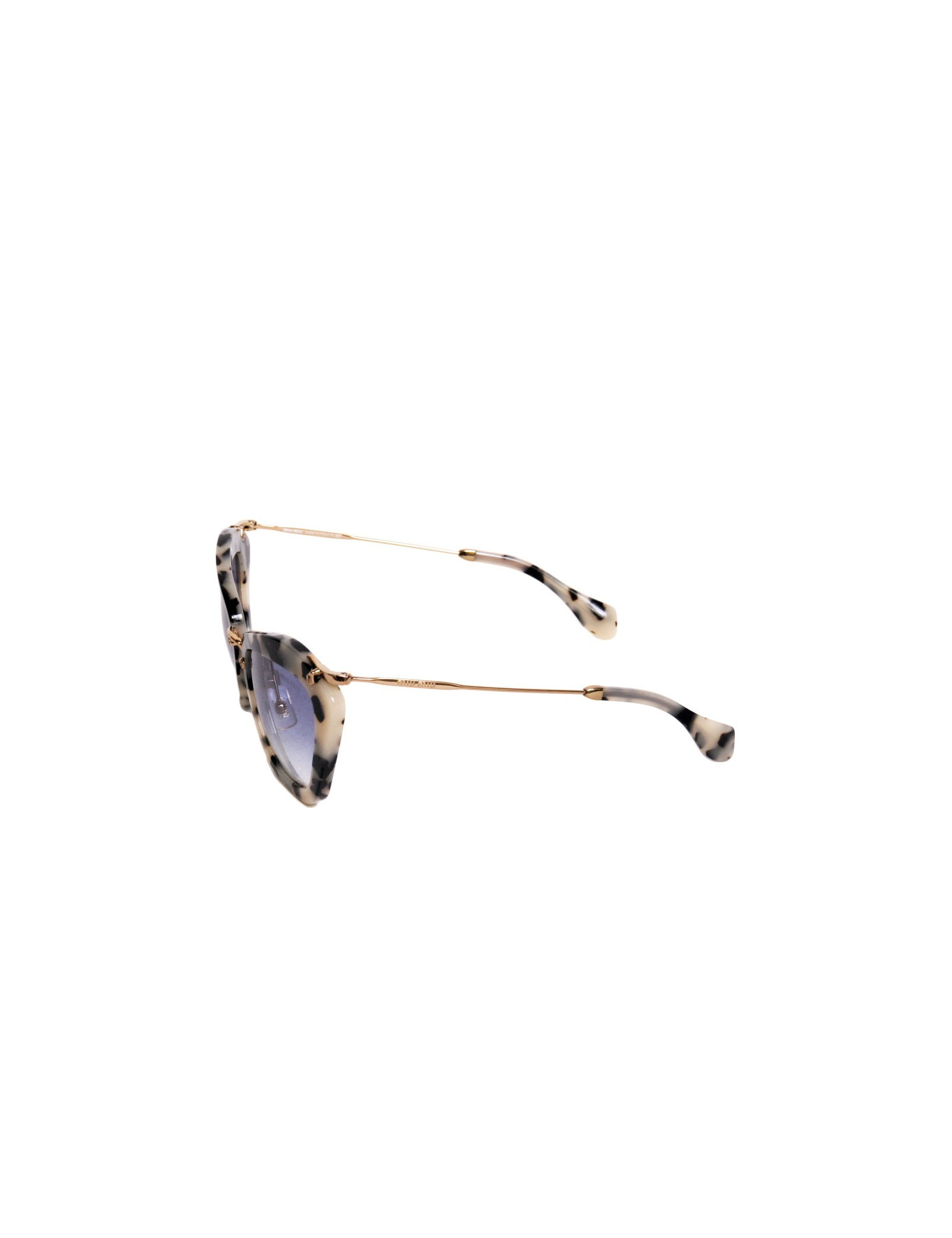 Dernière collection, modèle style années 40. Branches en métal doré, ornée d'une gravure "miu miu" sur chacune. Verres teintés en dégradé bleu.