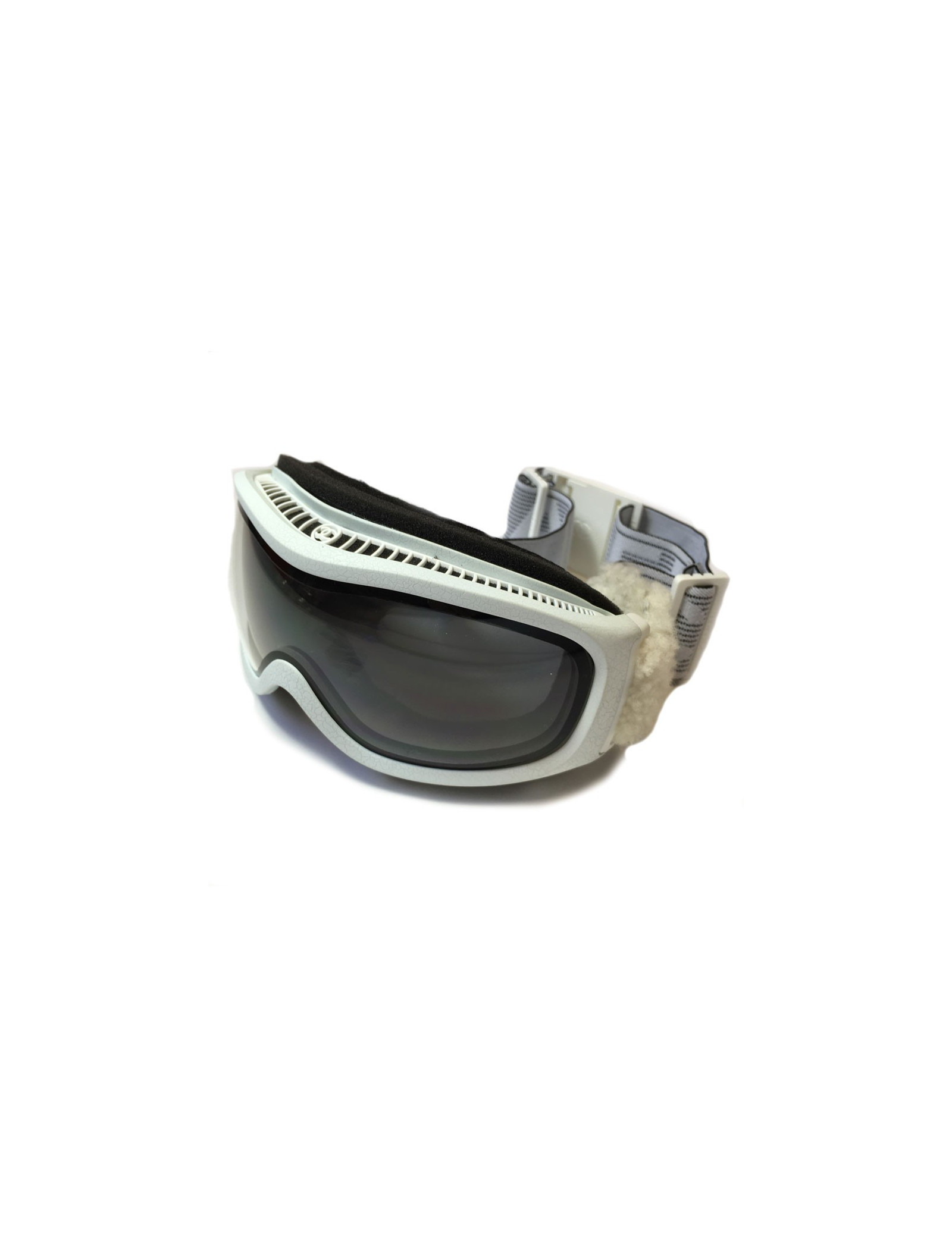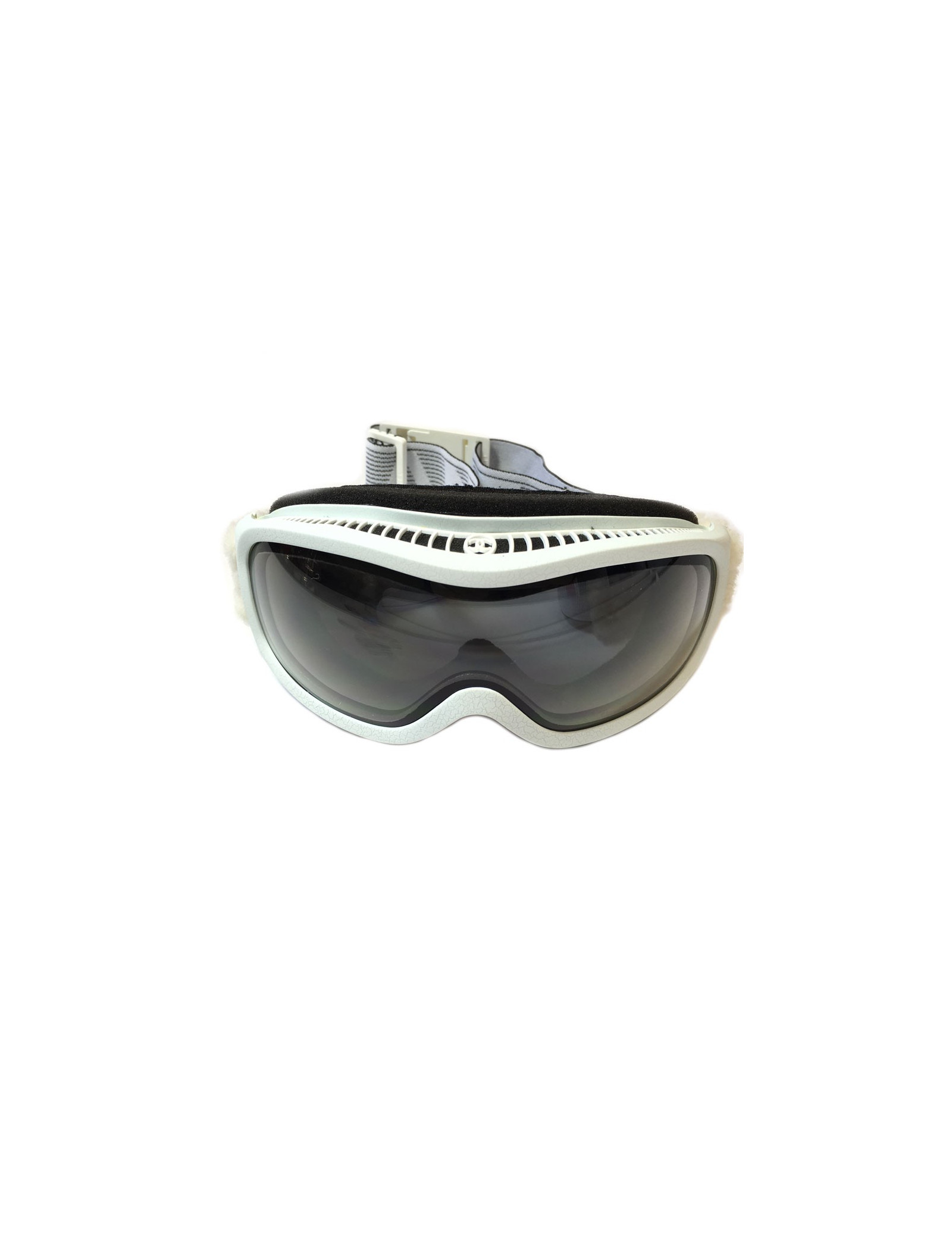 Pour être tendance sur les pistes! masque de ski CHANEL. Monture blanche effet craquelé. Strap élastique molletonné sur les côtés, inscription CHANEL en blanc. Fermoir clip en plastique blanc avec un CC dessus. Verres à teinte foncée. Masque neuf.