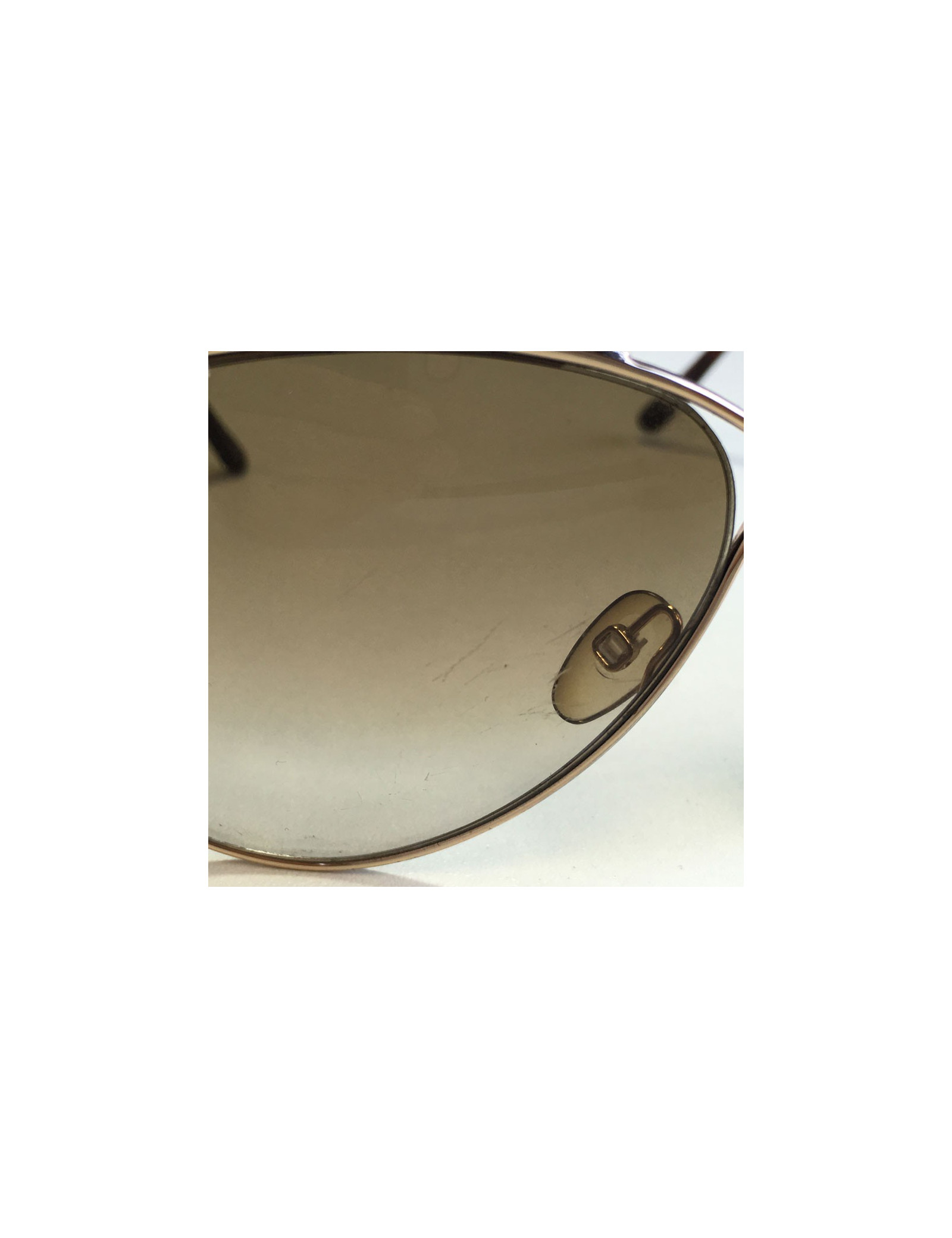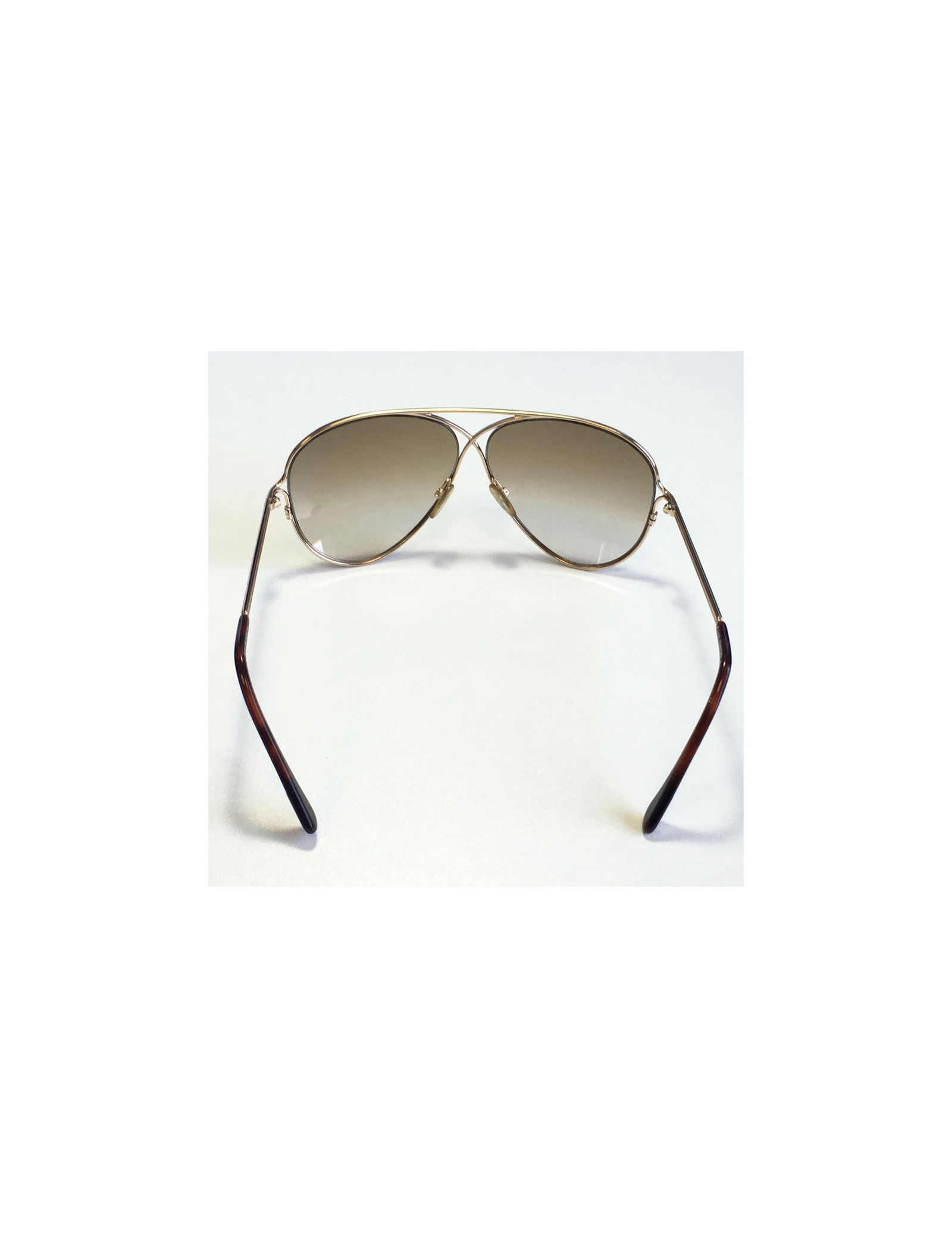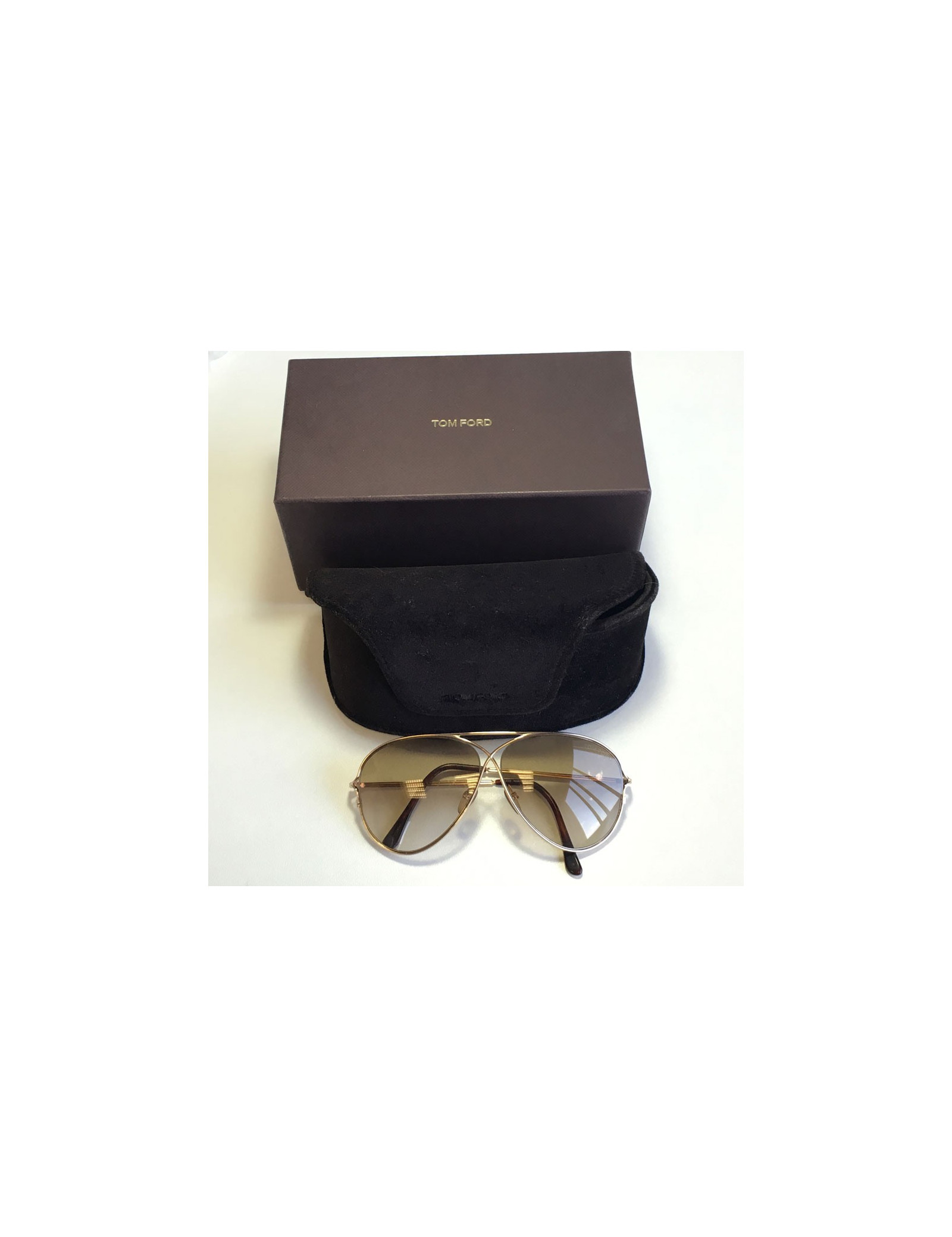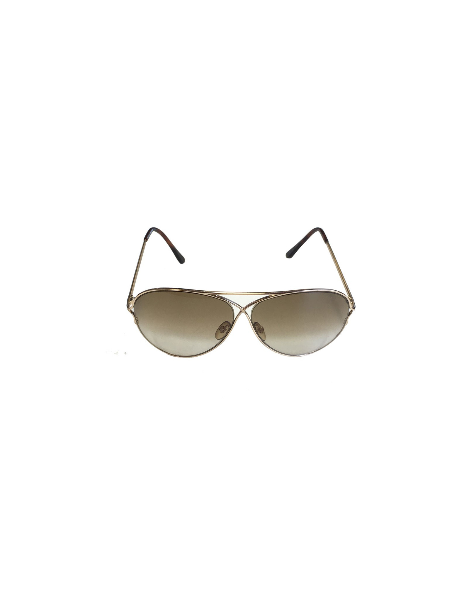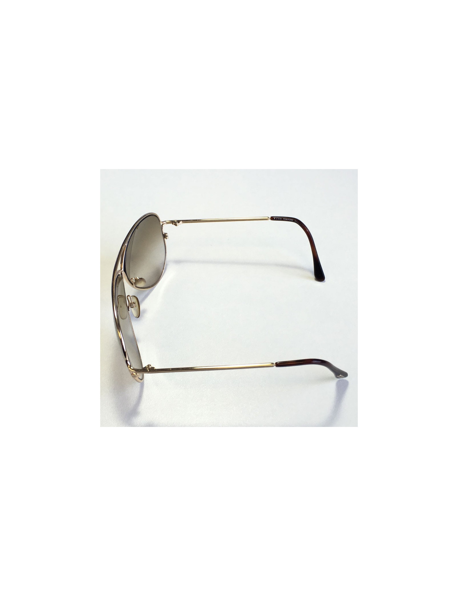Lunettes de soleil TOM FORD, modèle aviateur, en métal doré et verres marrons. les verres sont partiellement rayés (voir photos). Etat correct.