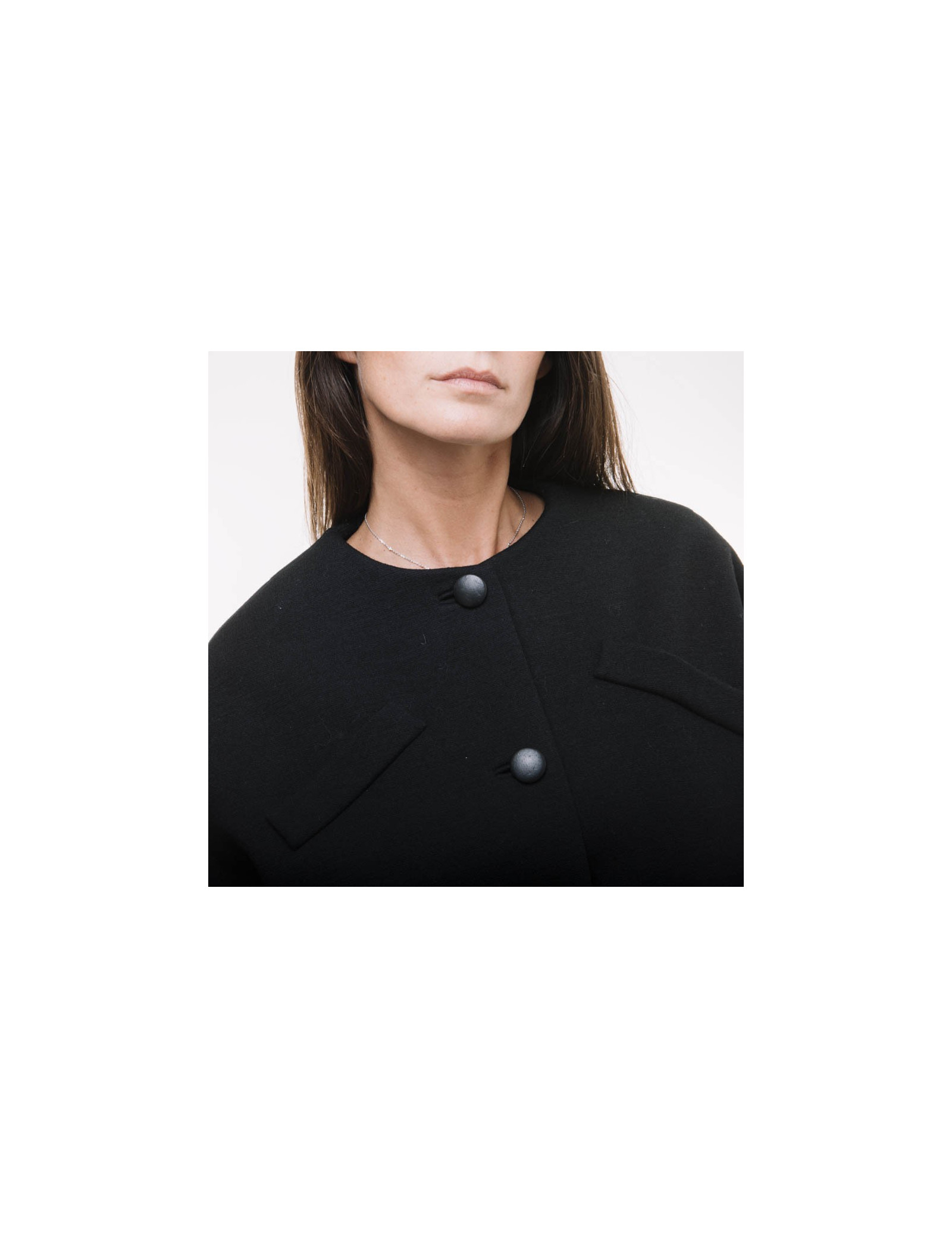 Une martingale dans le dos, ce manteau se ferme a l'aide de 4 boutons gainés de cuir noir. La doublure est en soie noire.