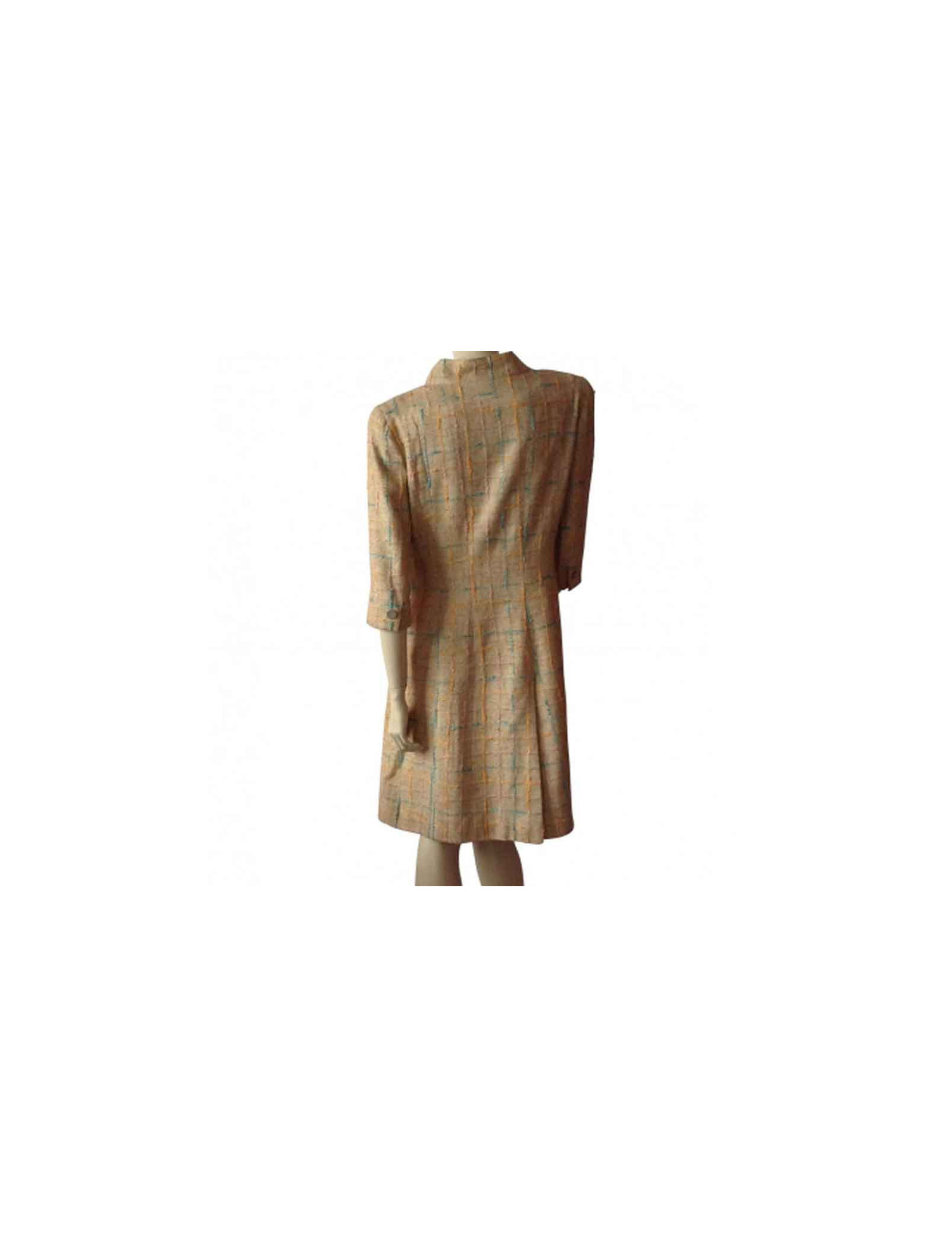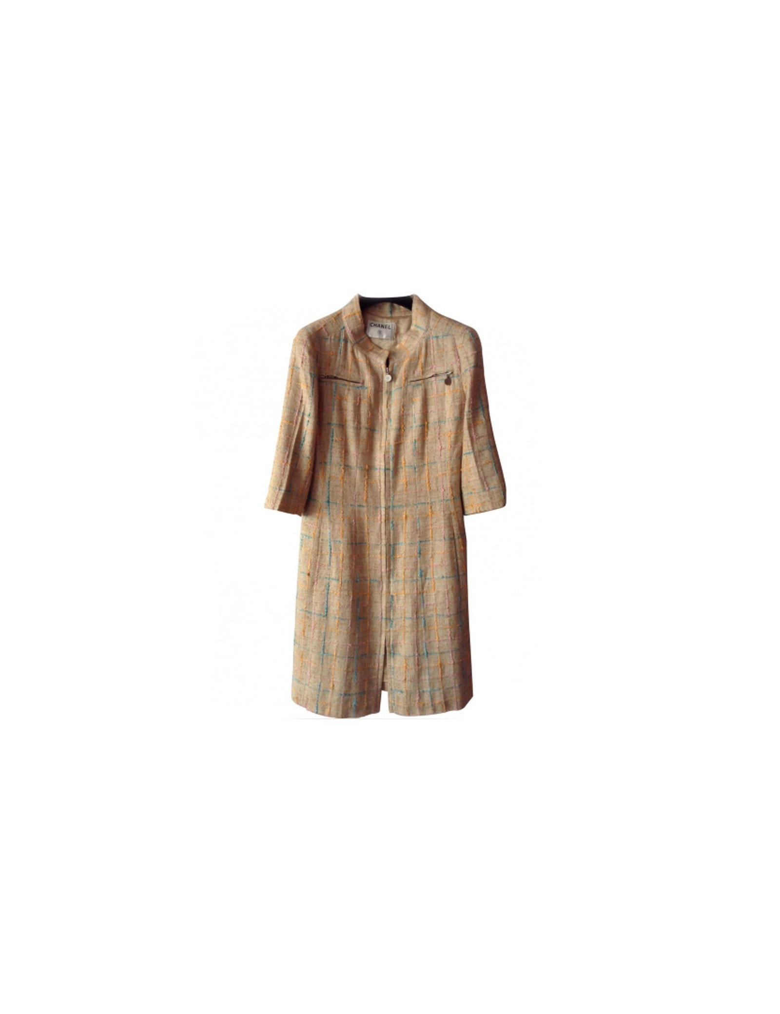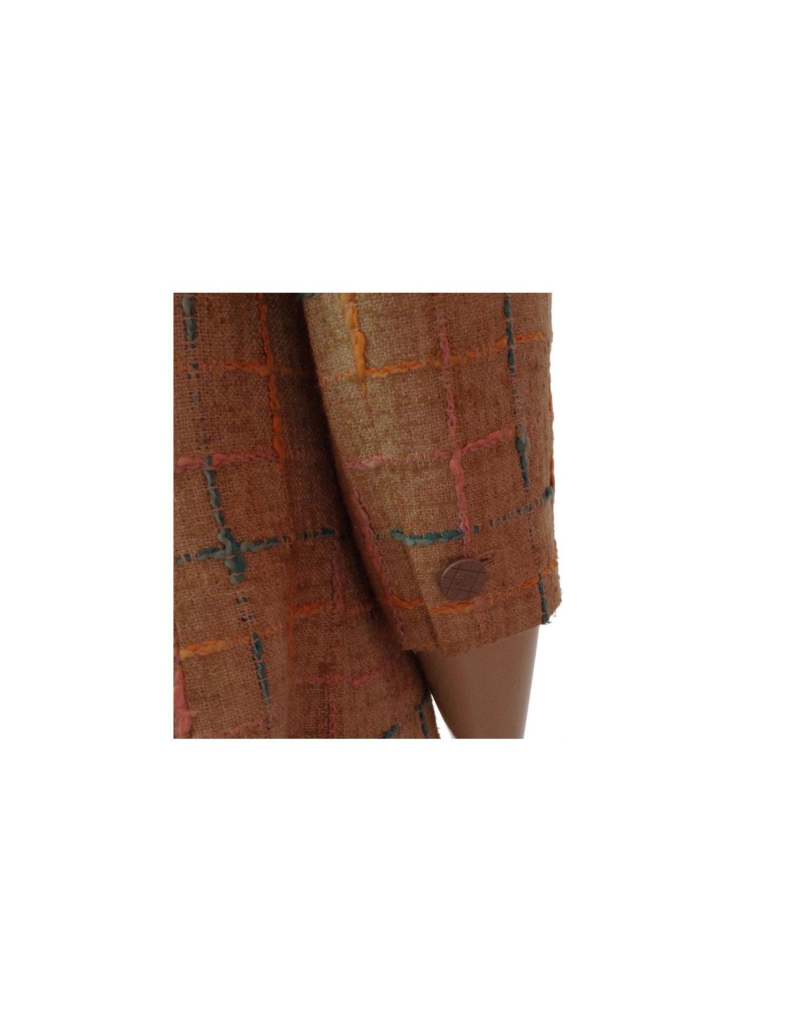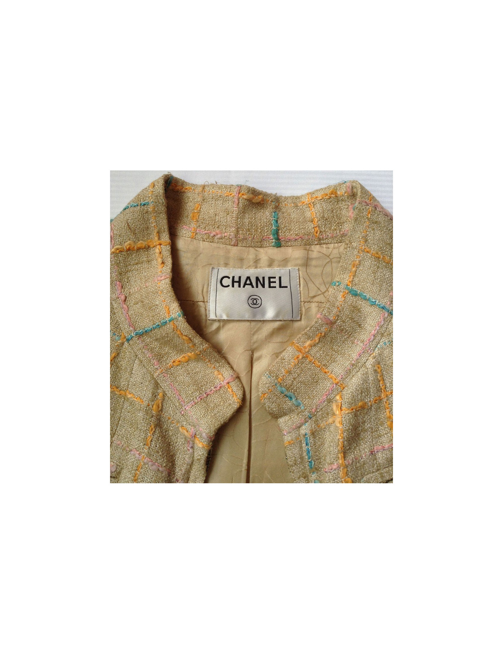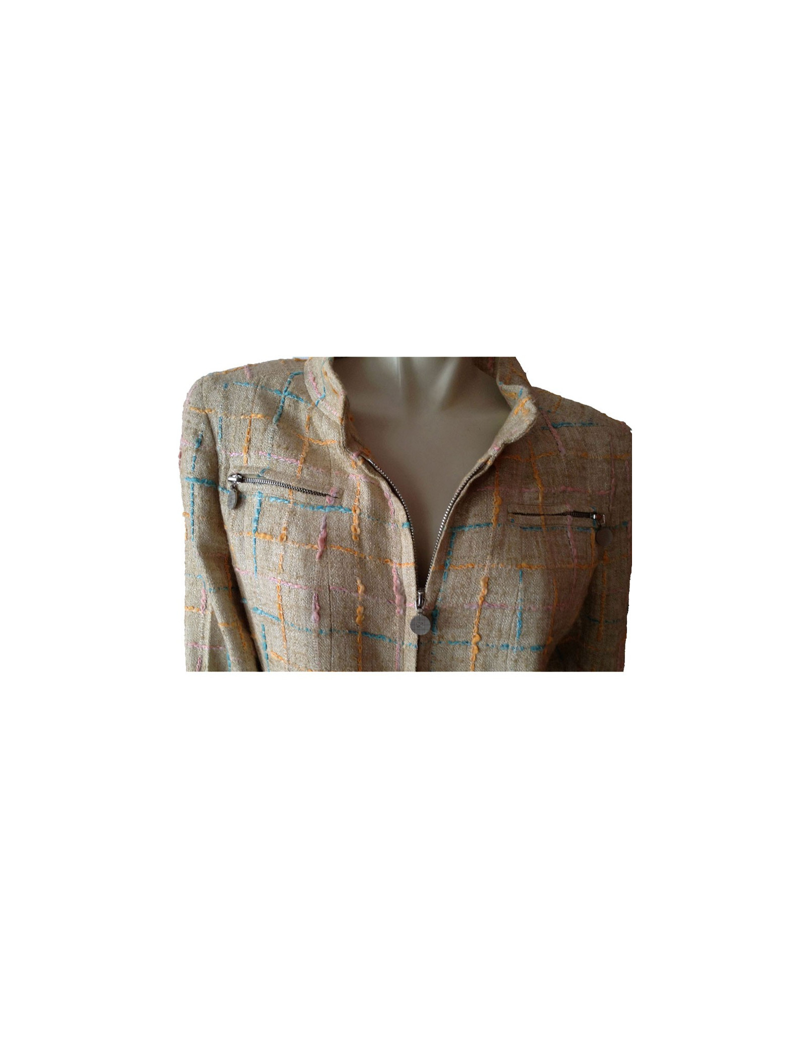 Manteau Chanel en Tweed, surpiqué de fils aux formes géométriques de couleur bleu ciel, rose, orange sur fond beige.