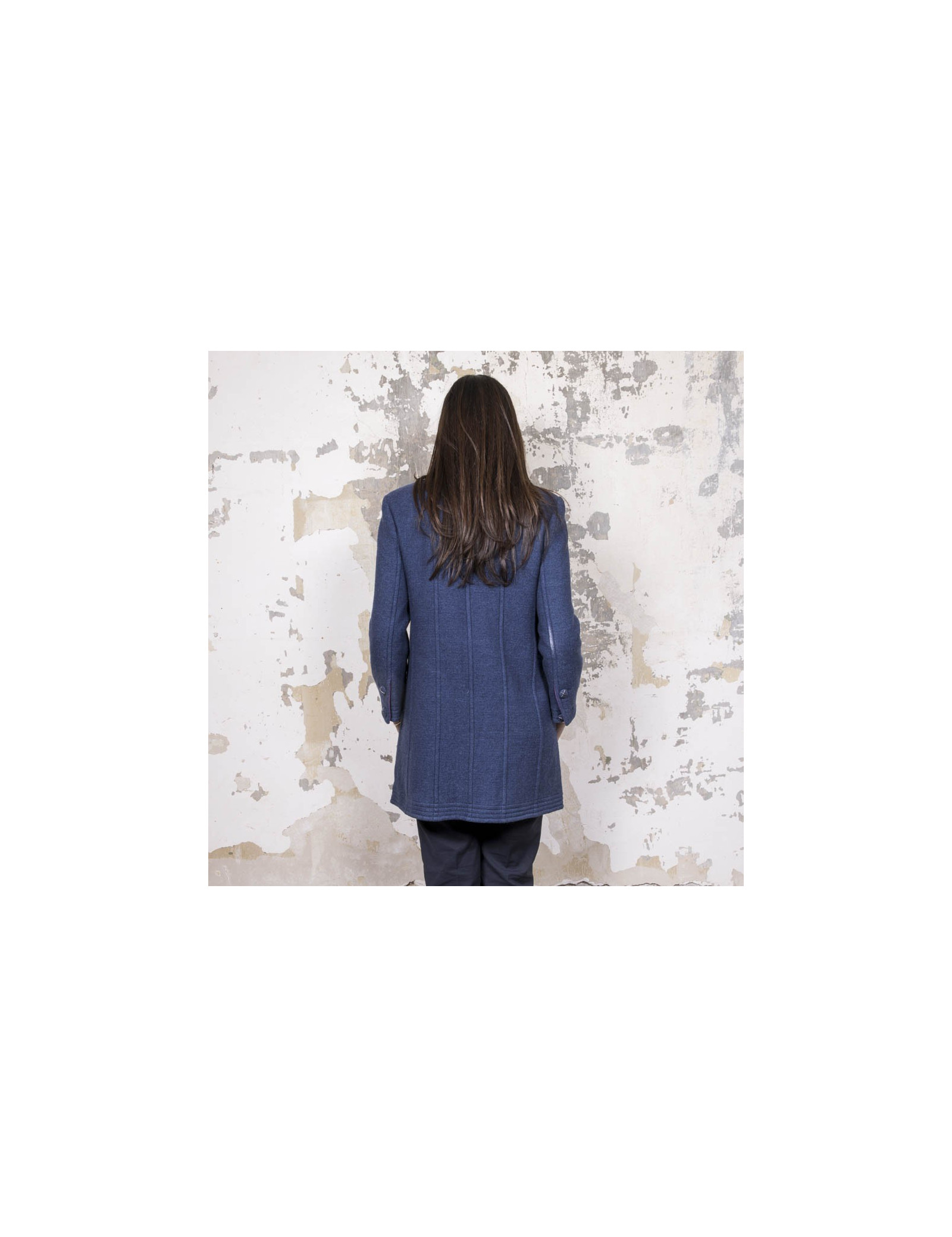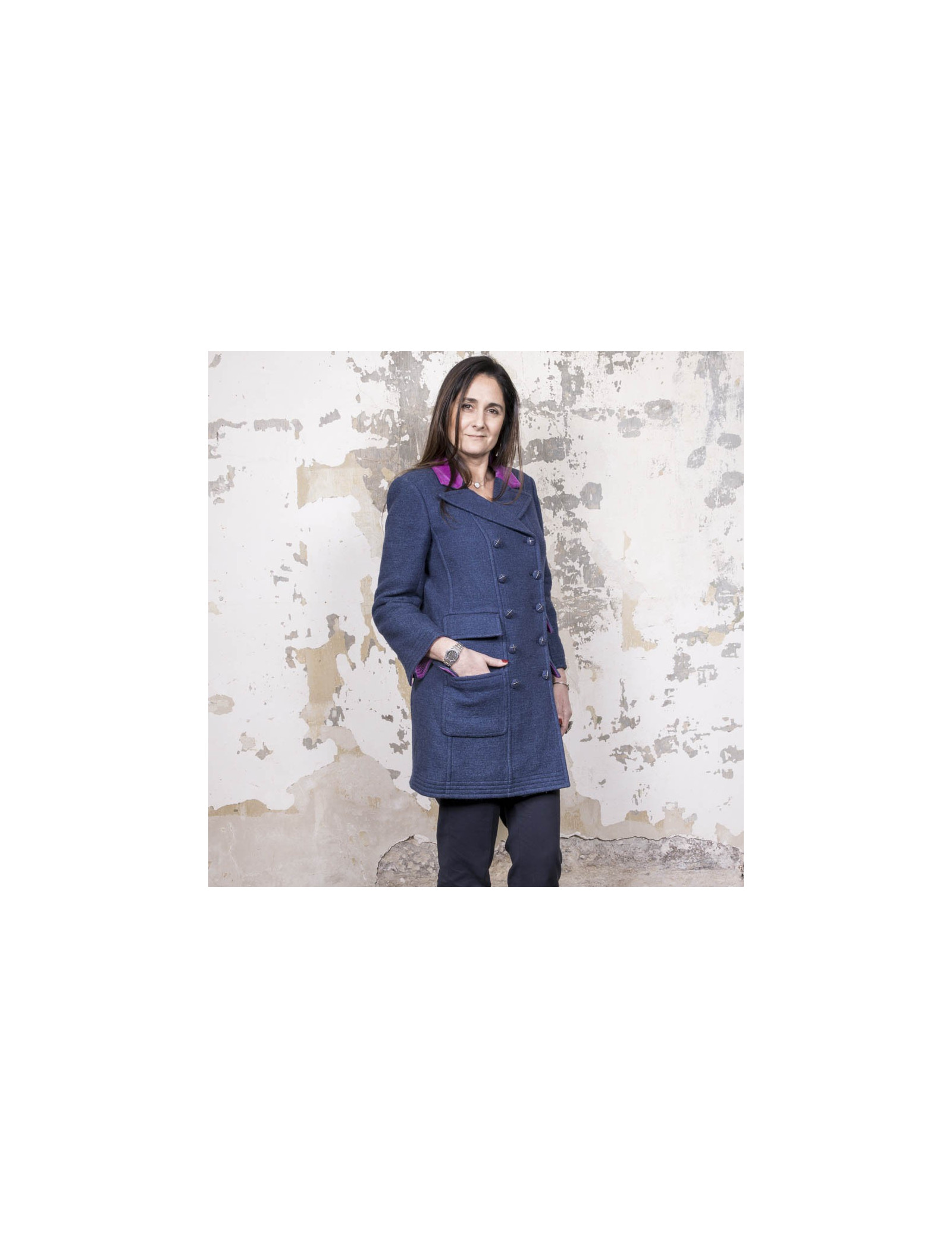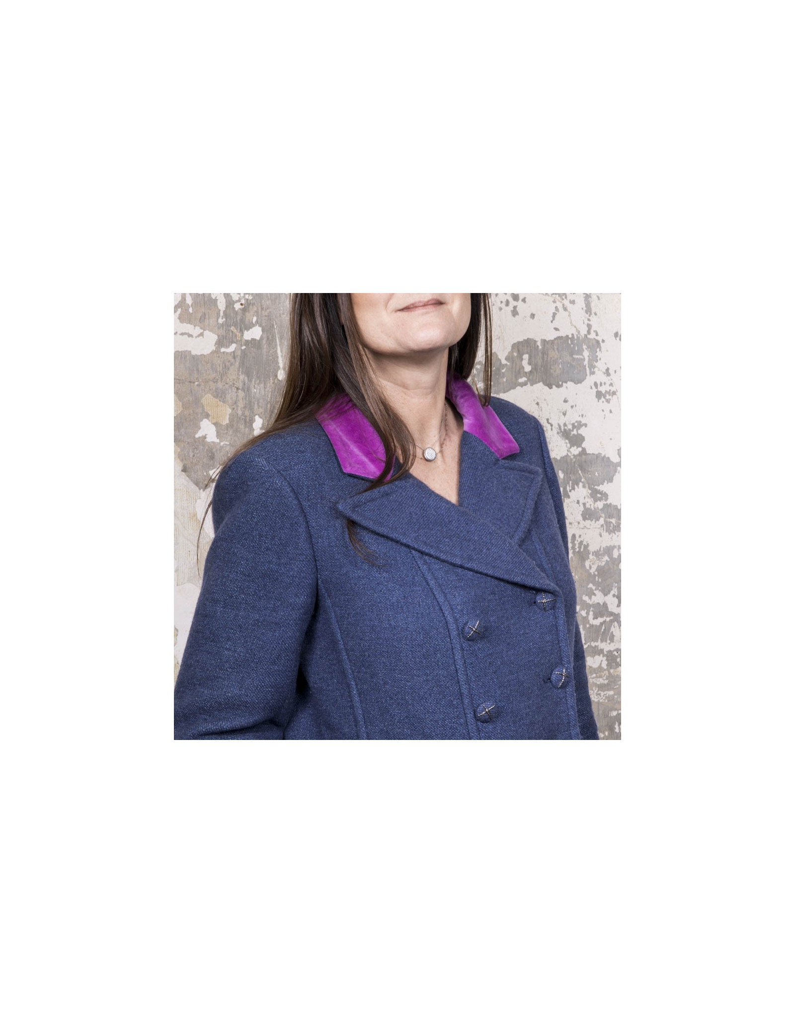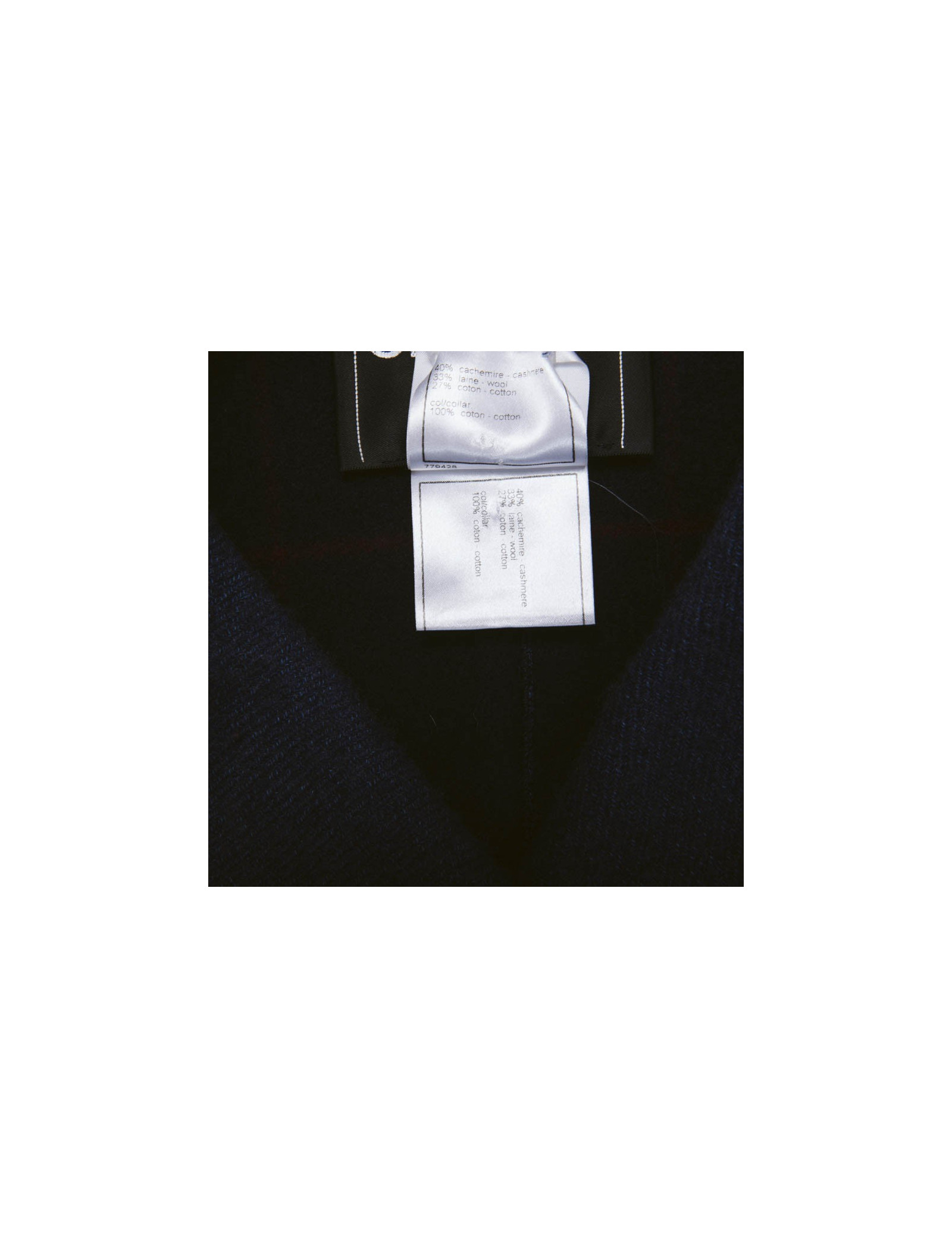 Caban taille 42 Chanel en cachemire, laine et coton bleu avec le col en velours violet. Collection Automne Hiver 2007. Se ferme à l'aide de dix boutons bleus avec une forme de croix en métal argent. On retrouve le même bouton au niveau des manches : deux à chaque poignet. Il y a aussi quatre poches avec rabat. Le caban n'est pas doublé. En très bon état. Made in France.