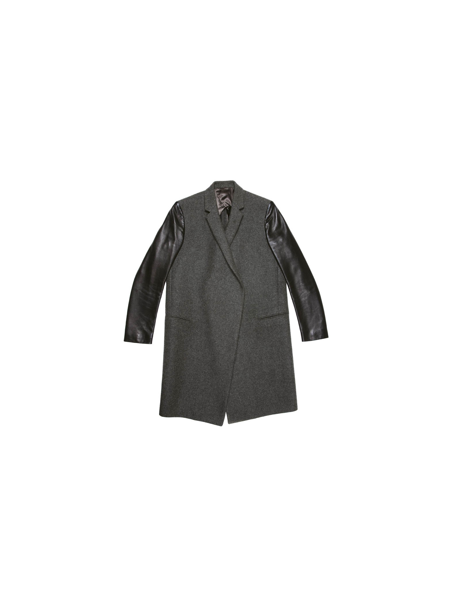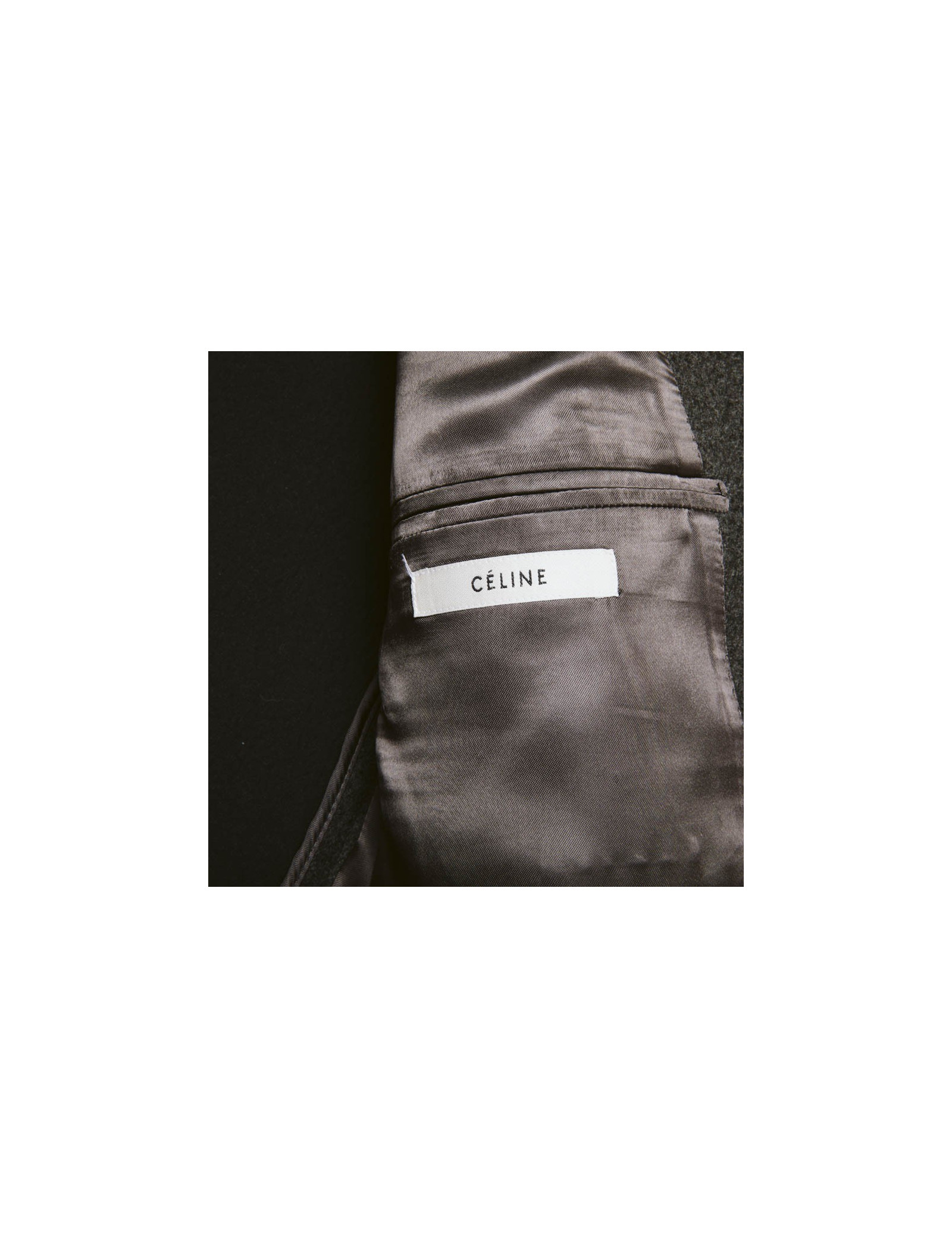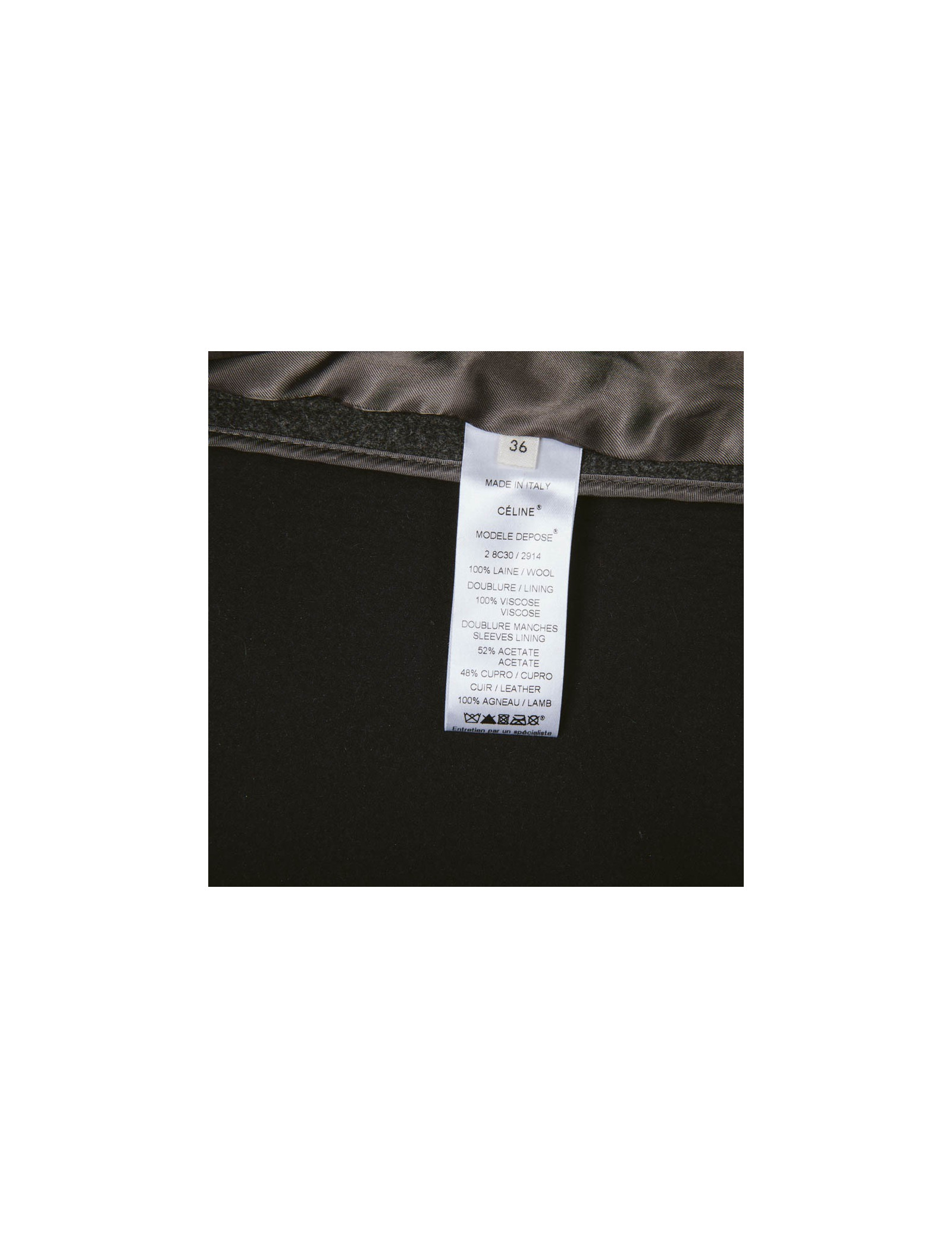 Manteau 'Crombie' Céline 100% laine grise et manches en cuir d'agneau noir souple. Taille 36. Deux poches plaquées devant et une poche au niveau de la poitrine à l'intérieur. Entièrement doublé en viscose. Longueur au dessus du genoux. Très bon état. Made in Italy.