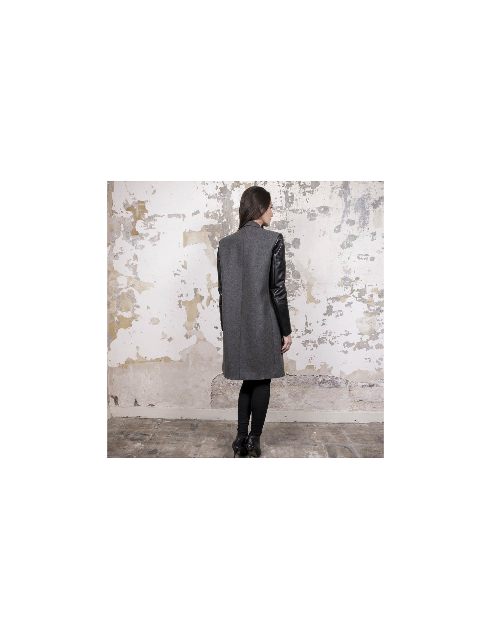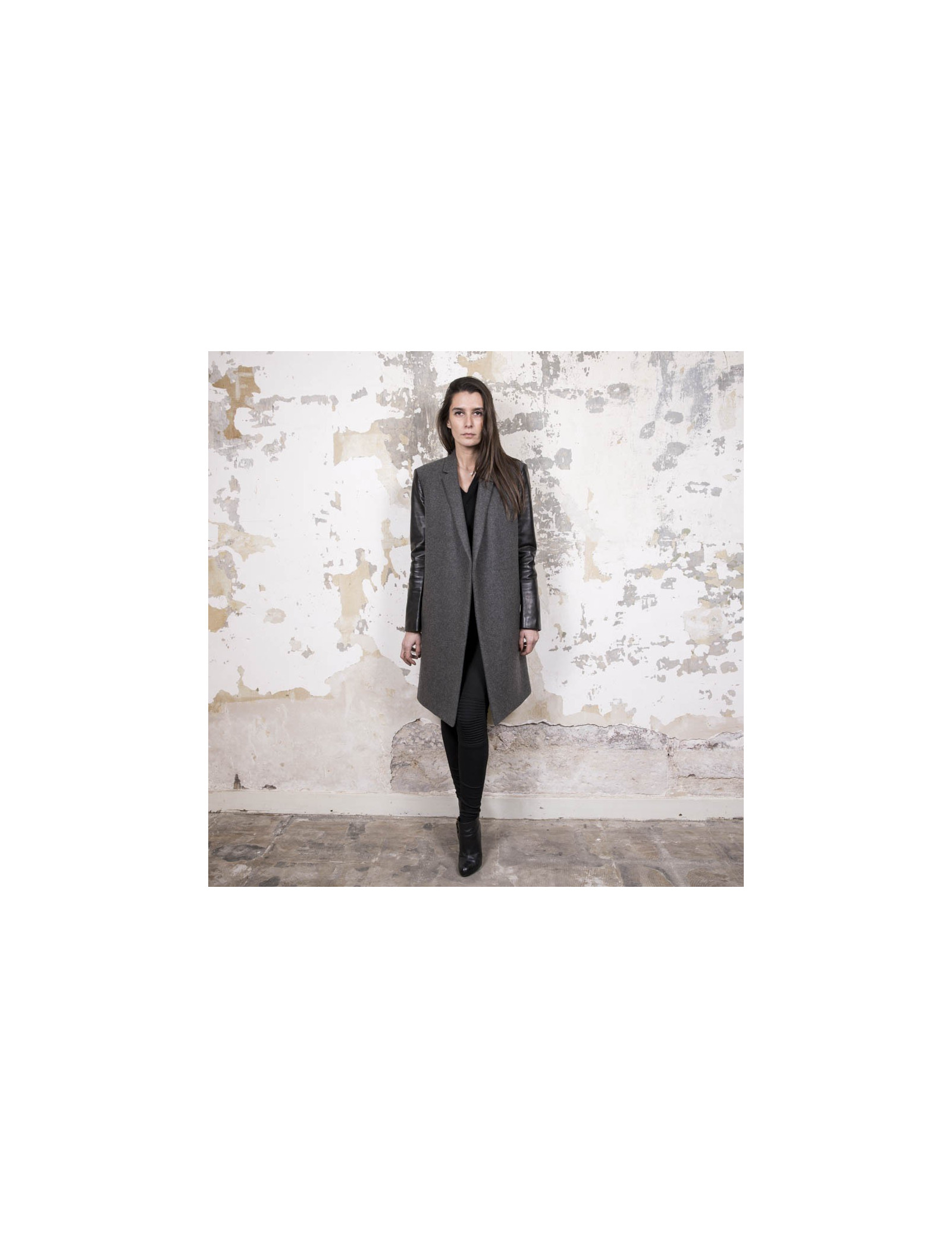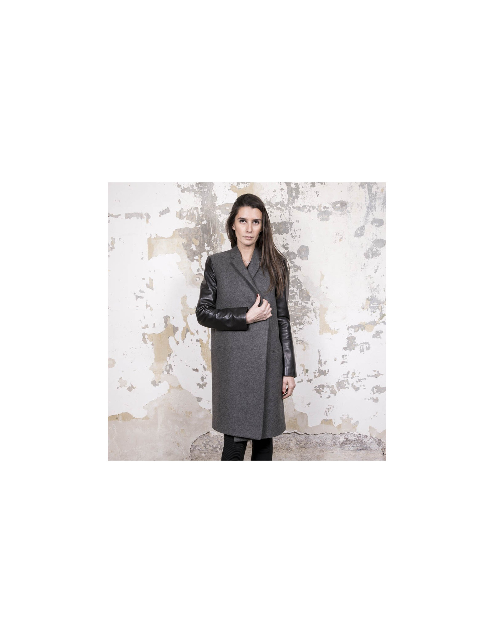 Manteau 'Crombie' Céline 100% laine grise et manches en cuir d'agneau noir souple. Taille 36. Deux poches plaquées devant et une poche au niveau de la poitrine à l'intérieur. Entièrement doublé en viscose. Longueur au dessus du genoux. Très bon état. Made in Italy.