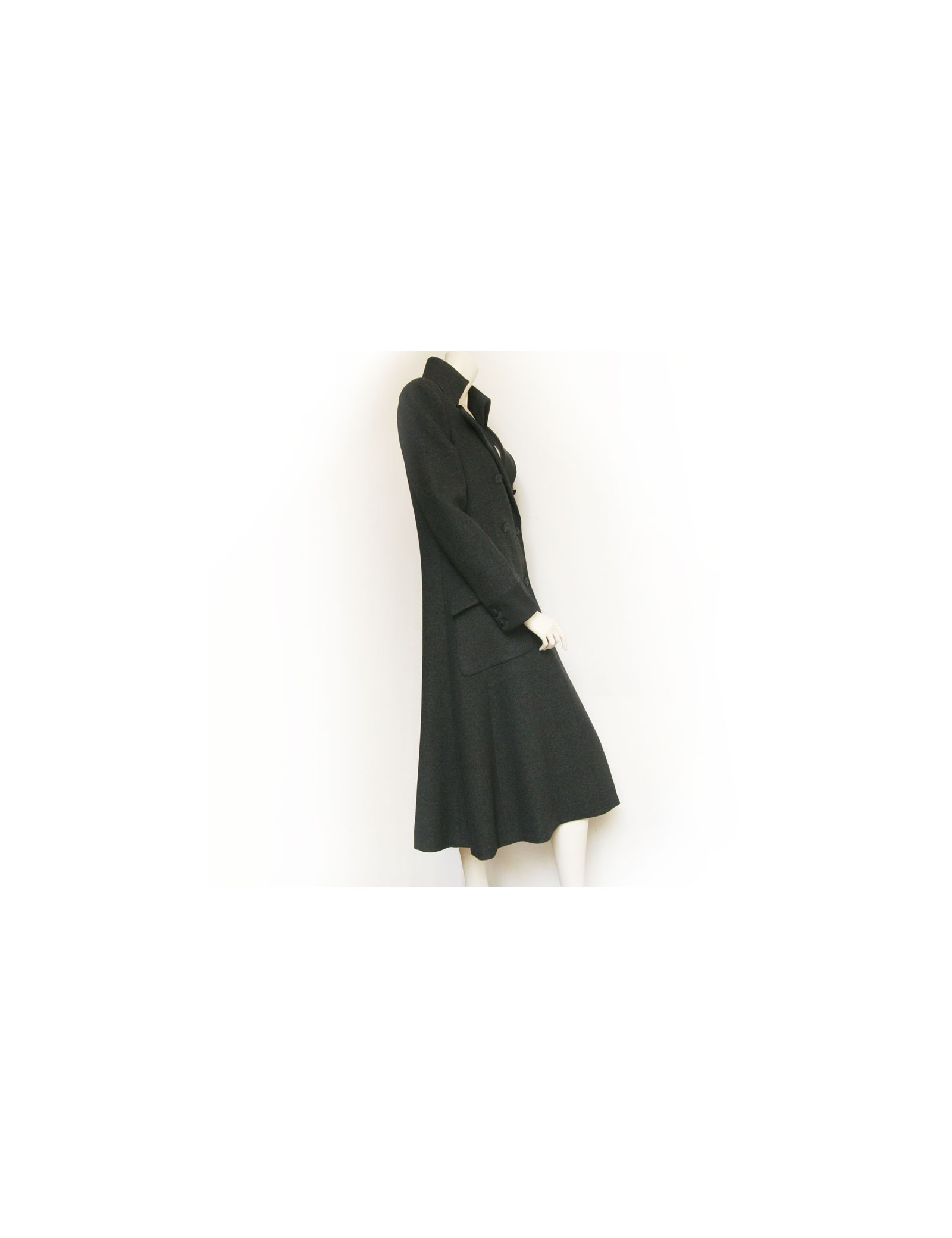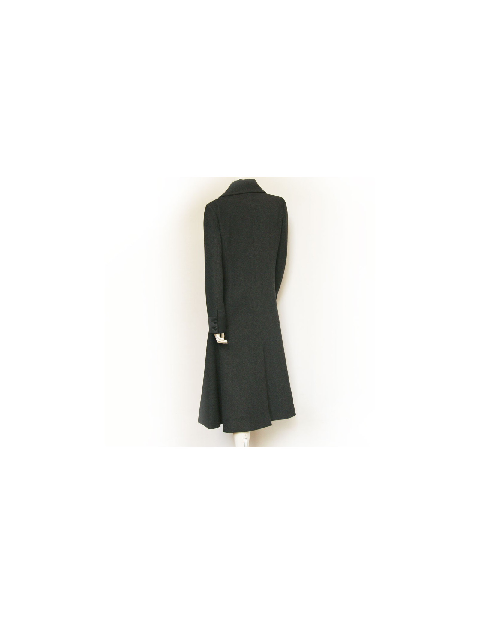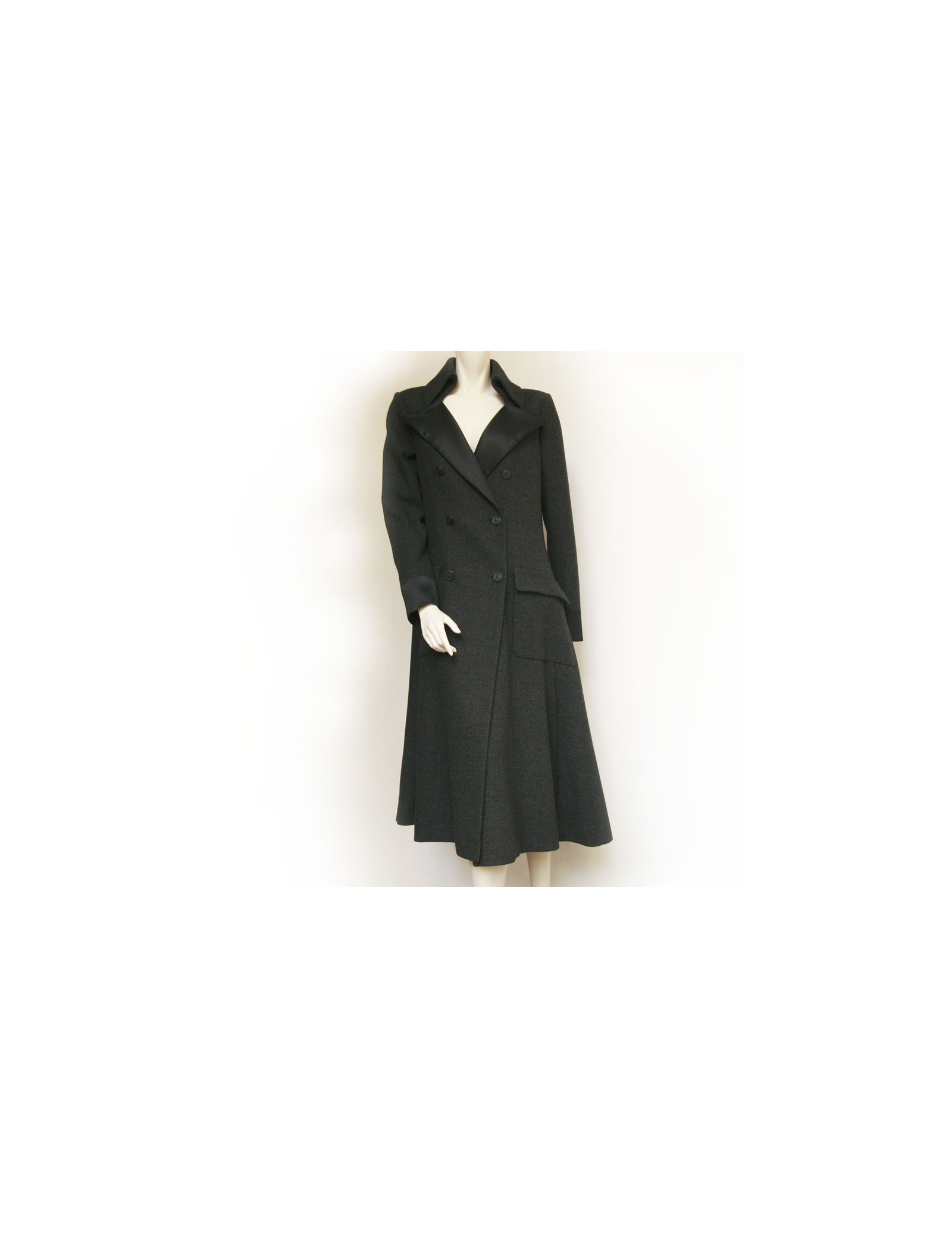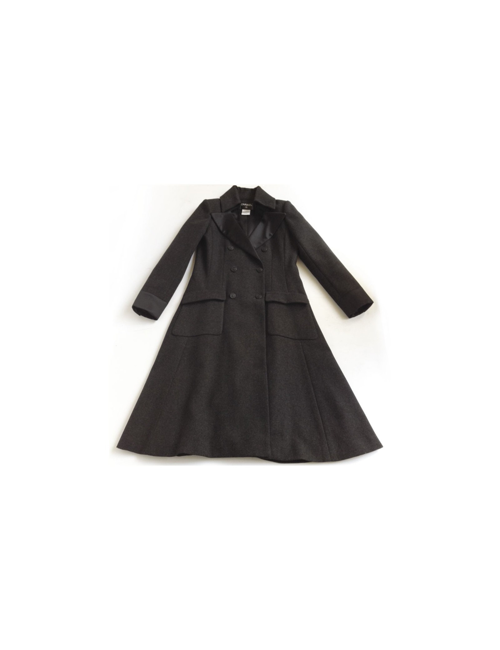 Magnifique manteau long t 42 Chanel en laine gris anthracite . Le col et les poignées sont en soie noire, la doublure également. Il y a devant deux poches plaquées. La fermeture du manteau est croisée par des boutons siglés "CC". Collection (O8 A) Automne 2008. En très bon état.