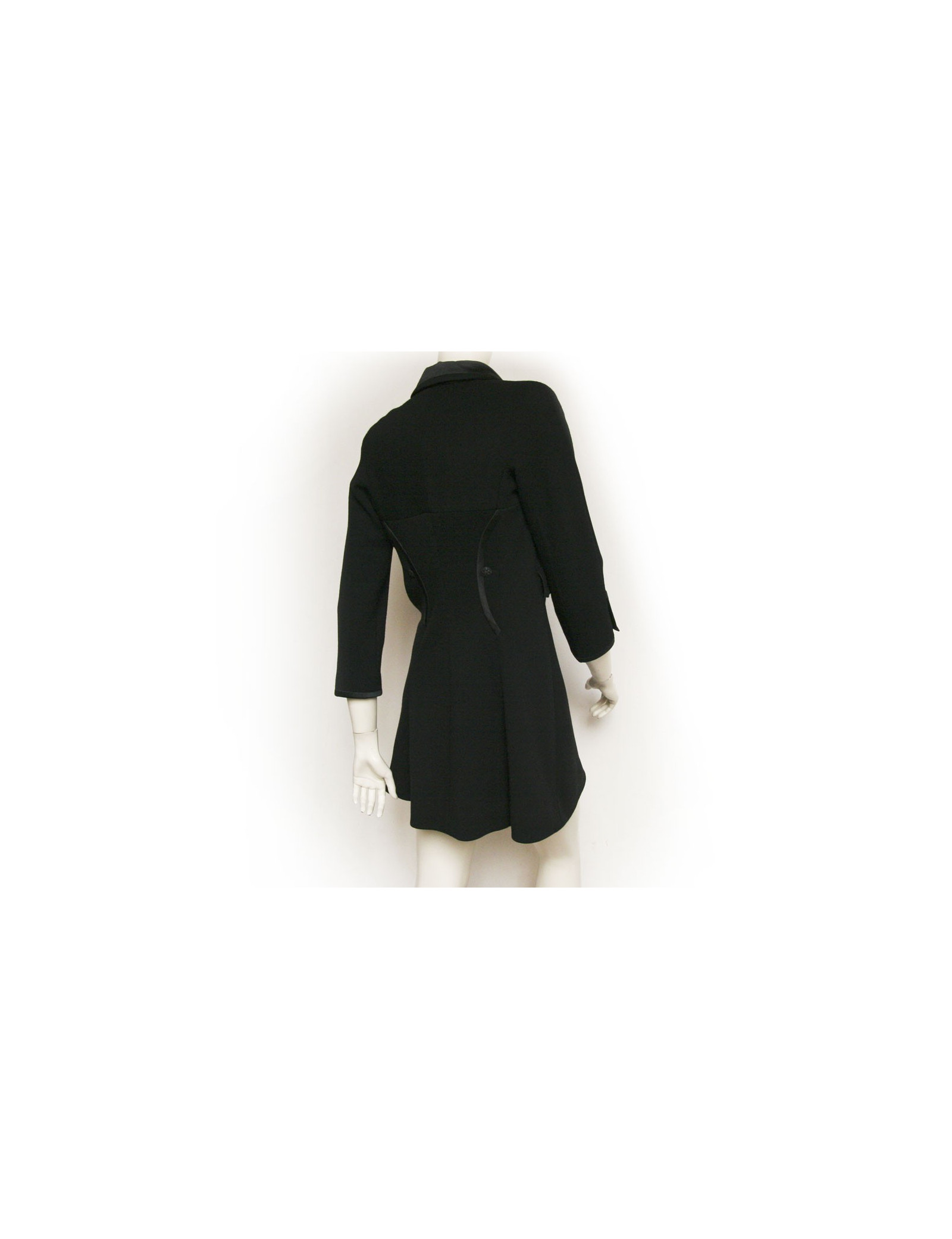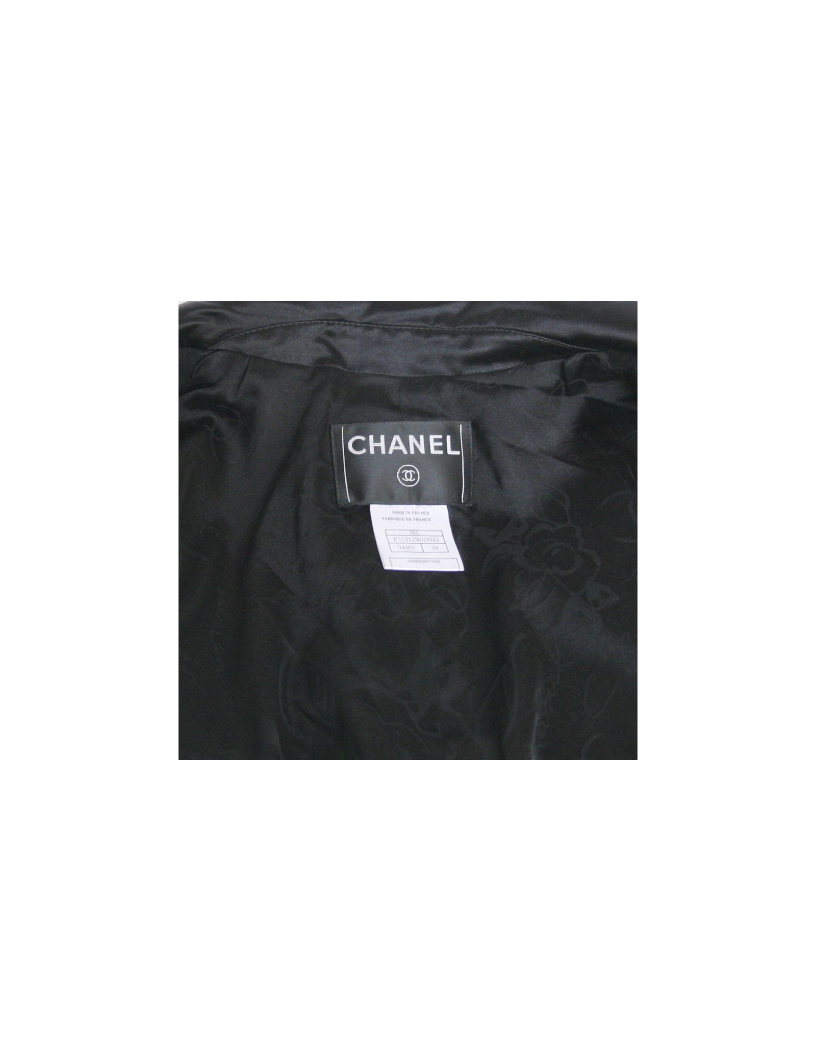 Manteau noir Chanel en laine, avec son col en soie ainsi que ses 2 poches plaquées. Ligne ajustée. Fermeture 3 boutons noirs unis et sur chaque poignet, 3 boutons décorés de petites pierres noires. Le rappel de la soie se fait également sur chaque extrémité des poignets et au dos ajoutés de 2 boutons noirs surpiqués de pierre noir. L'intérieur est en soie 100% de couleur noir imprimé du logo CC et du camélia. Taille 38FR en laine 100%. Collection: Automne/Hiver