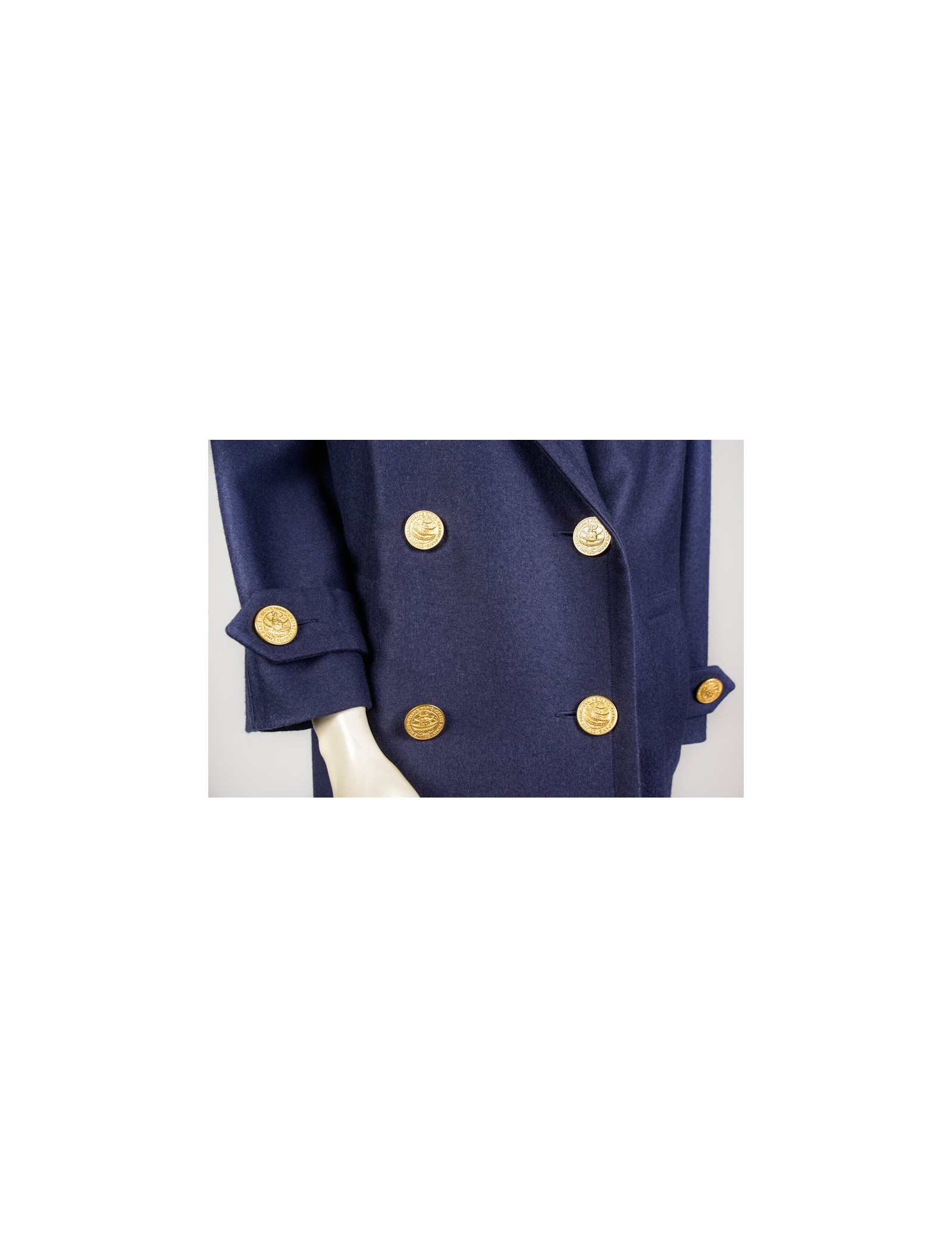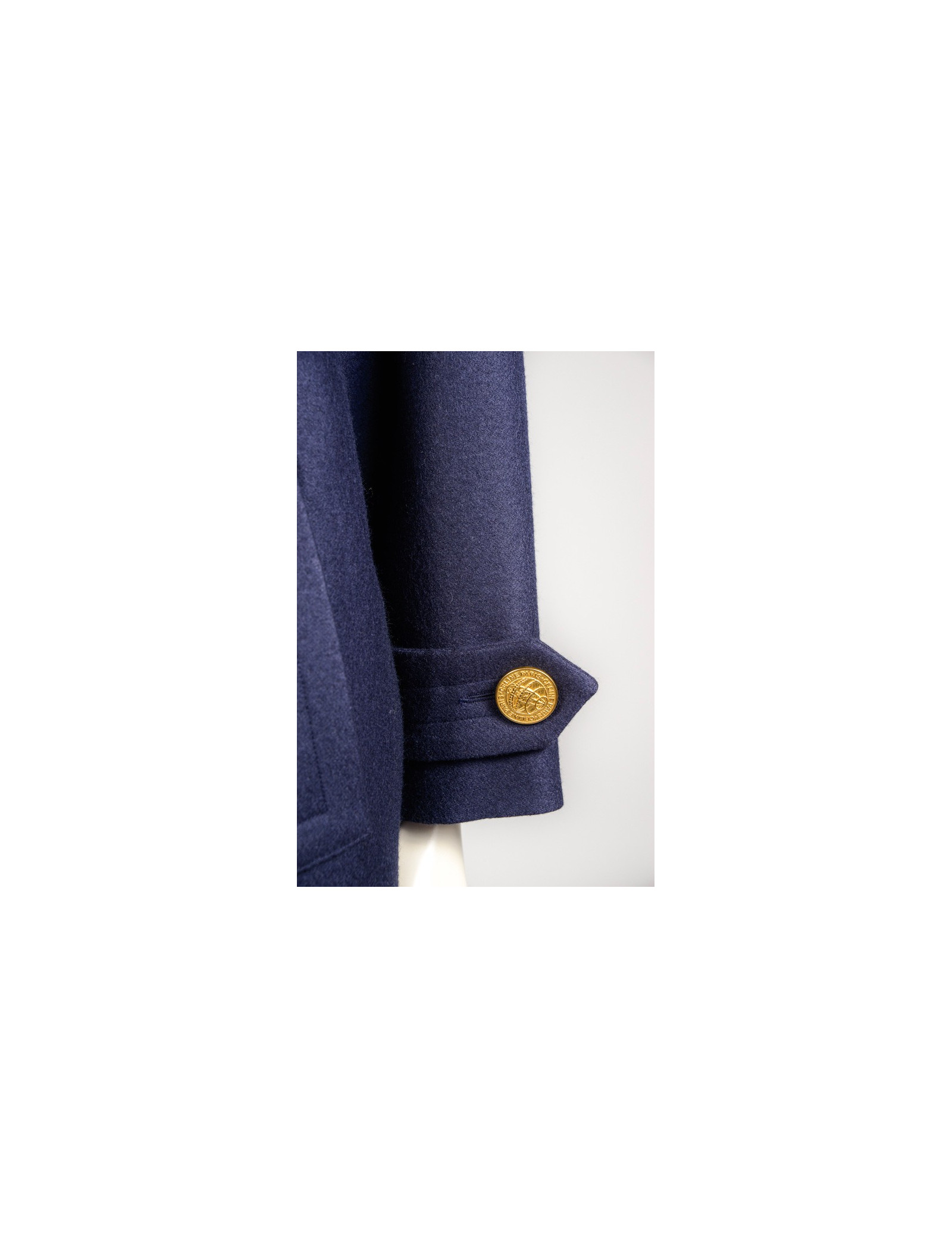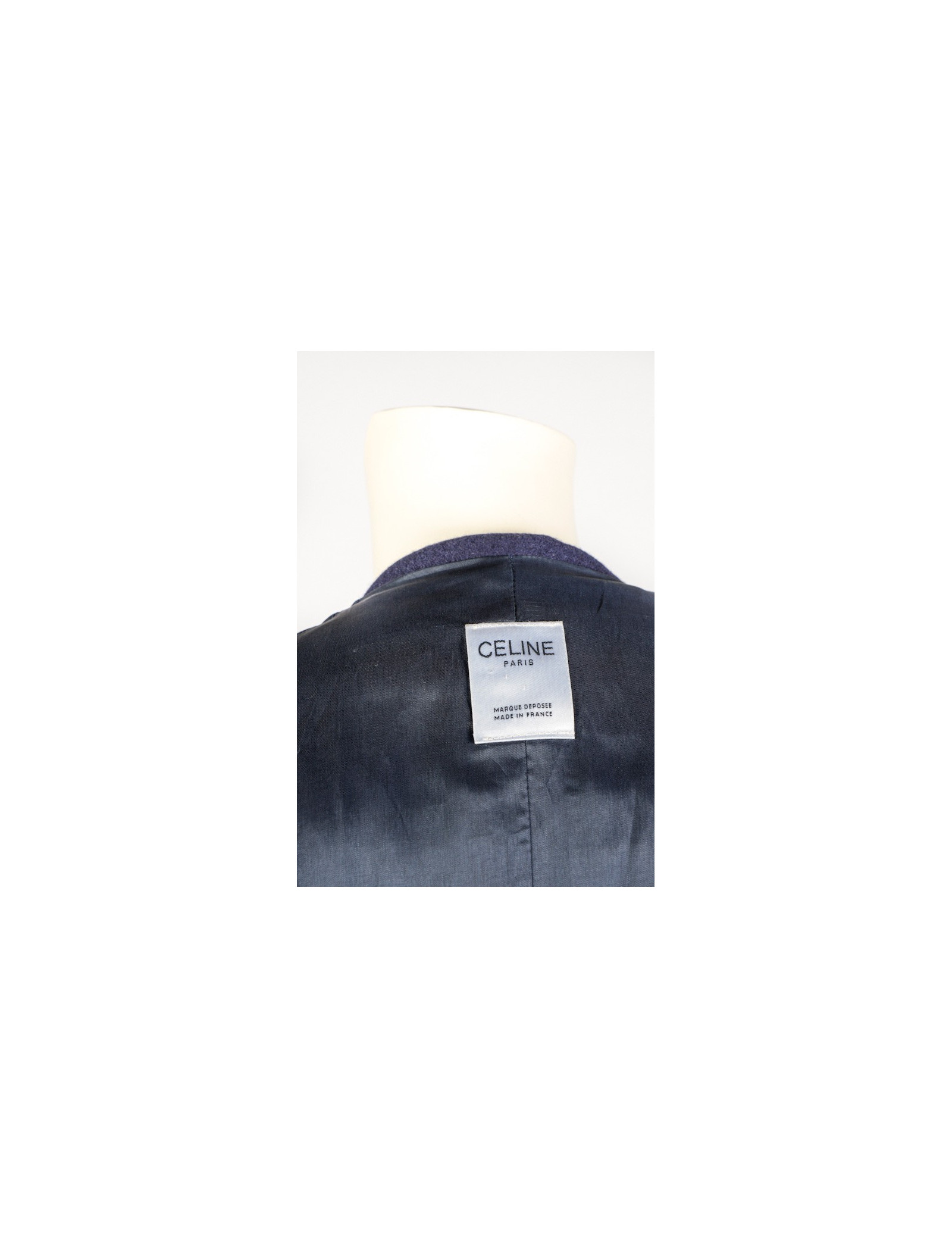 Caban Céline en laine bleu marine, taille 44. Fermeture 4 boutons. Les boutons sont en métal doré siglés Céline Paris. Une poche plaquée de chaque côté. En très bon état.