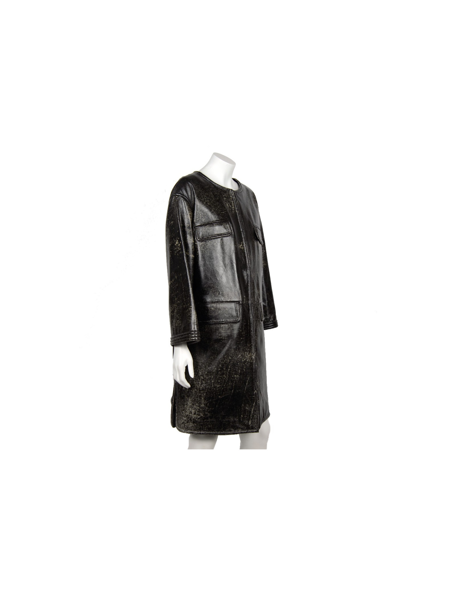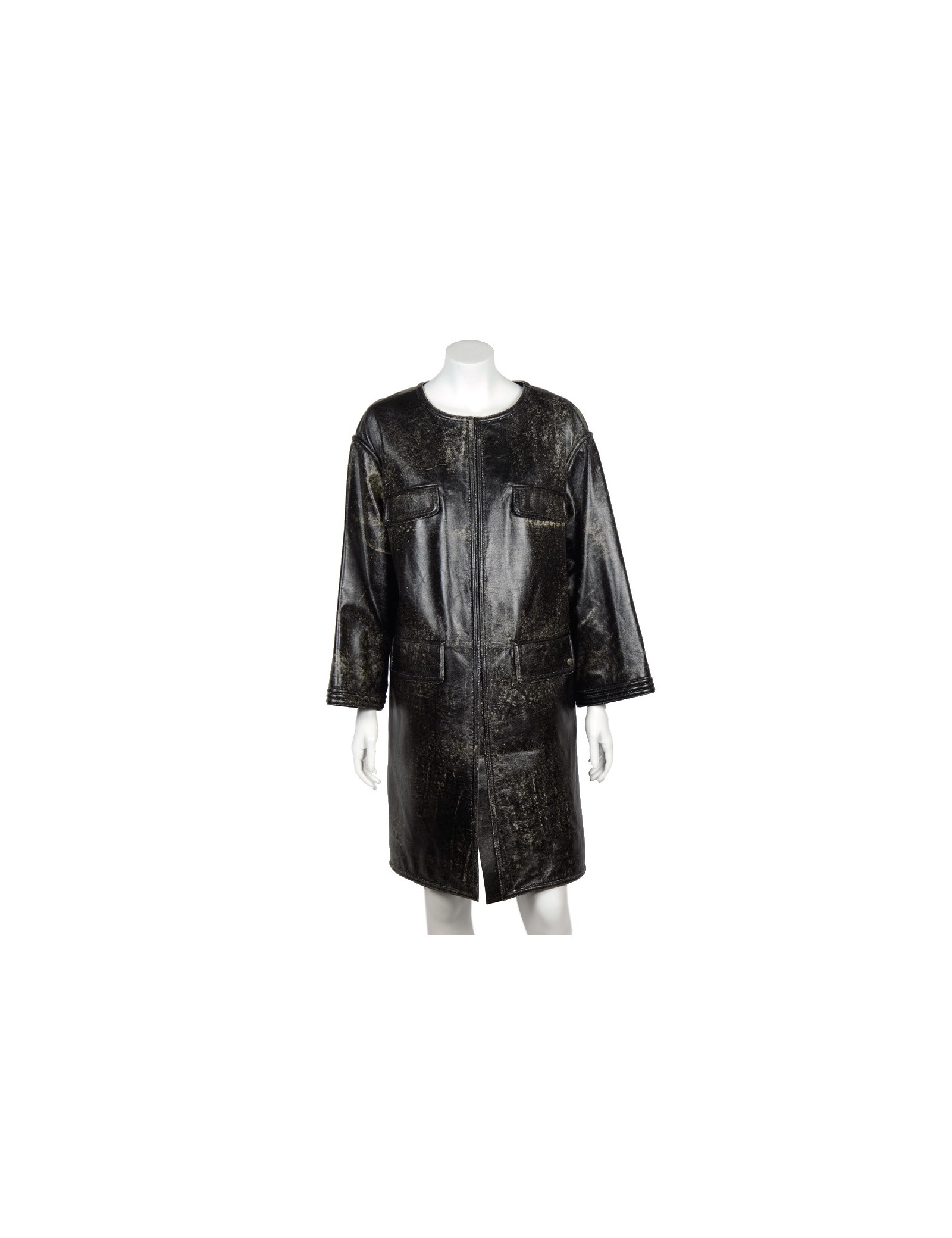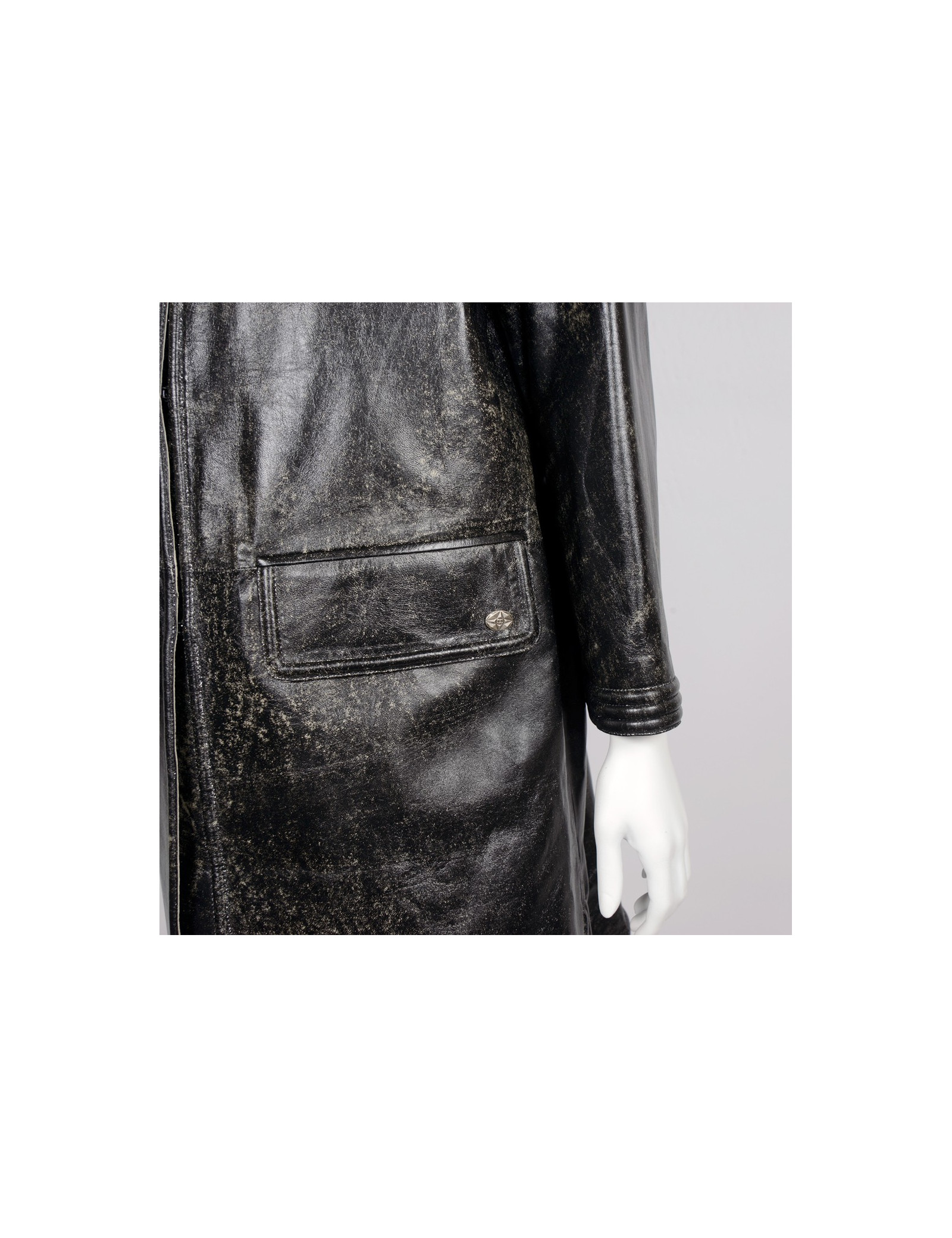 Manteau Chanel en cuir d'agneau noir tacheté de blanc, collection récente. Taille 44, gansé d'un fil d'argent. Fermeture par crochets. 4 poches plaquées à l'avant. Col rond. La doublure est en soie noire avec des motifs qui représentent des camélias, des "CC", etc. Provient des soldes. En très bon état.