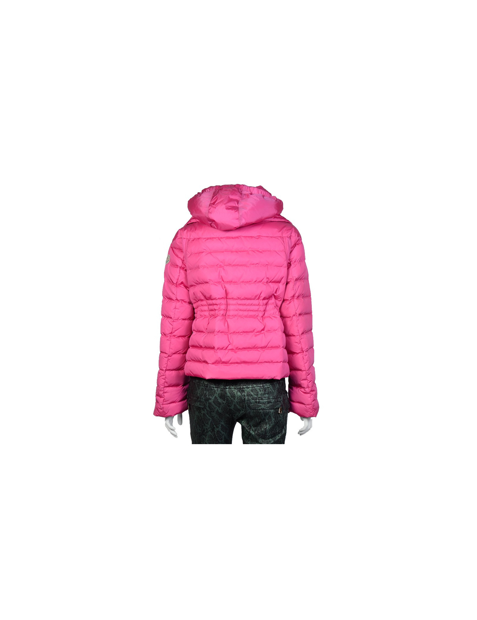 Mythique doudoune Moncler en toile cirée de couleur fuschia. T0 équivaut à un 36 français. Fermeture zippée en métal doré et par bouton pression par dessus. Elle dispose d'une capuche amovible. A l'intérieur, vous y trouverez un cordon qui permet de resserrer la taille. Une poche en biais de chaque côté zippée. En très bon état.
