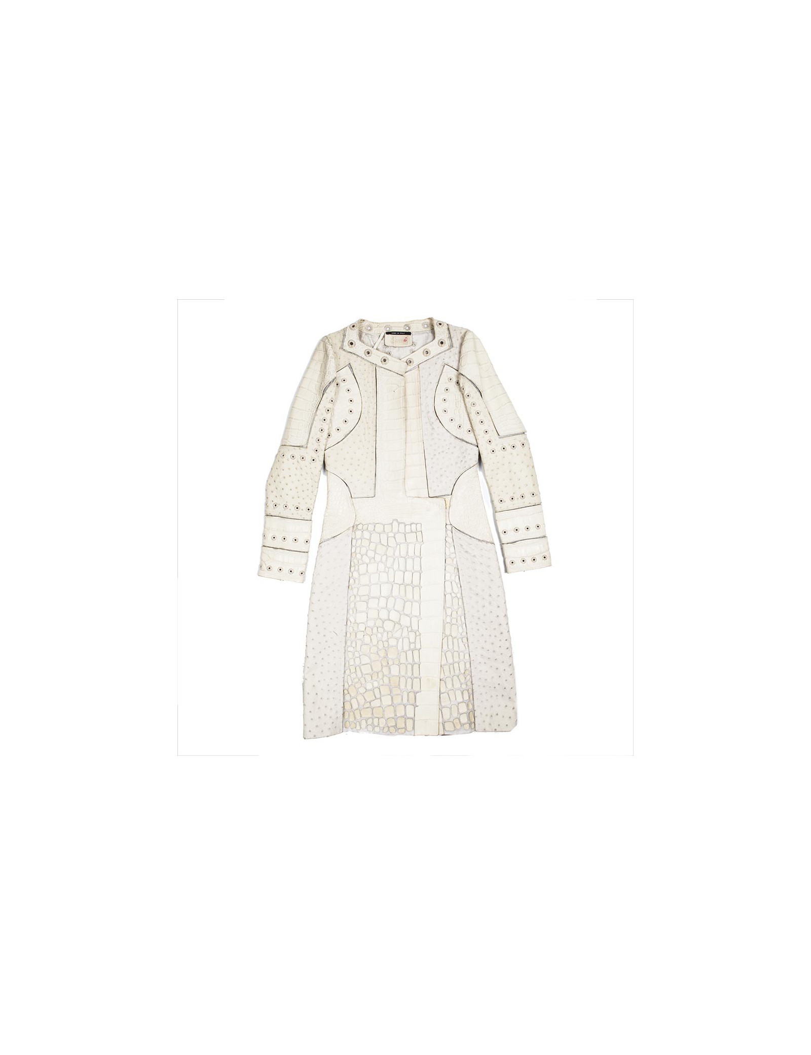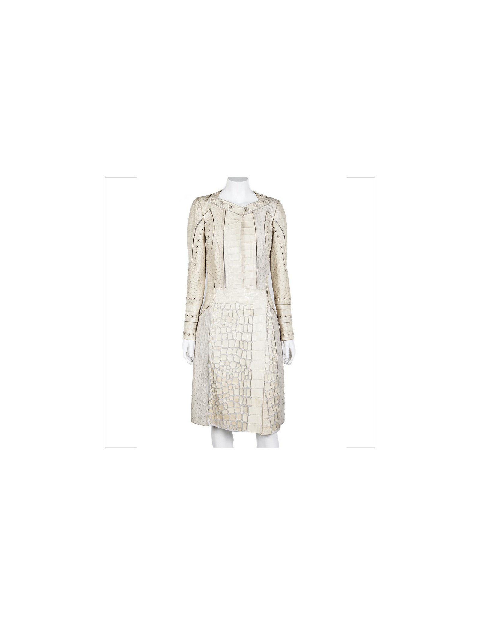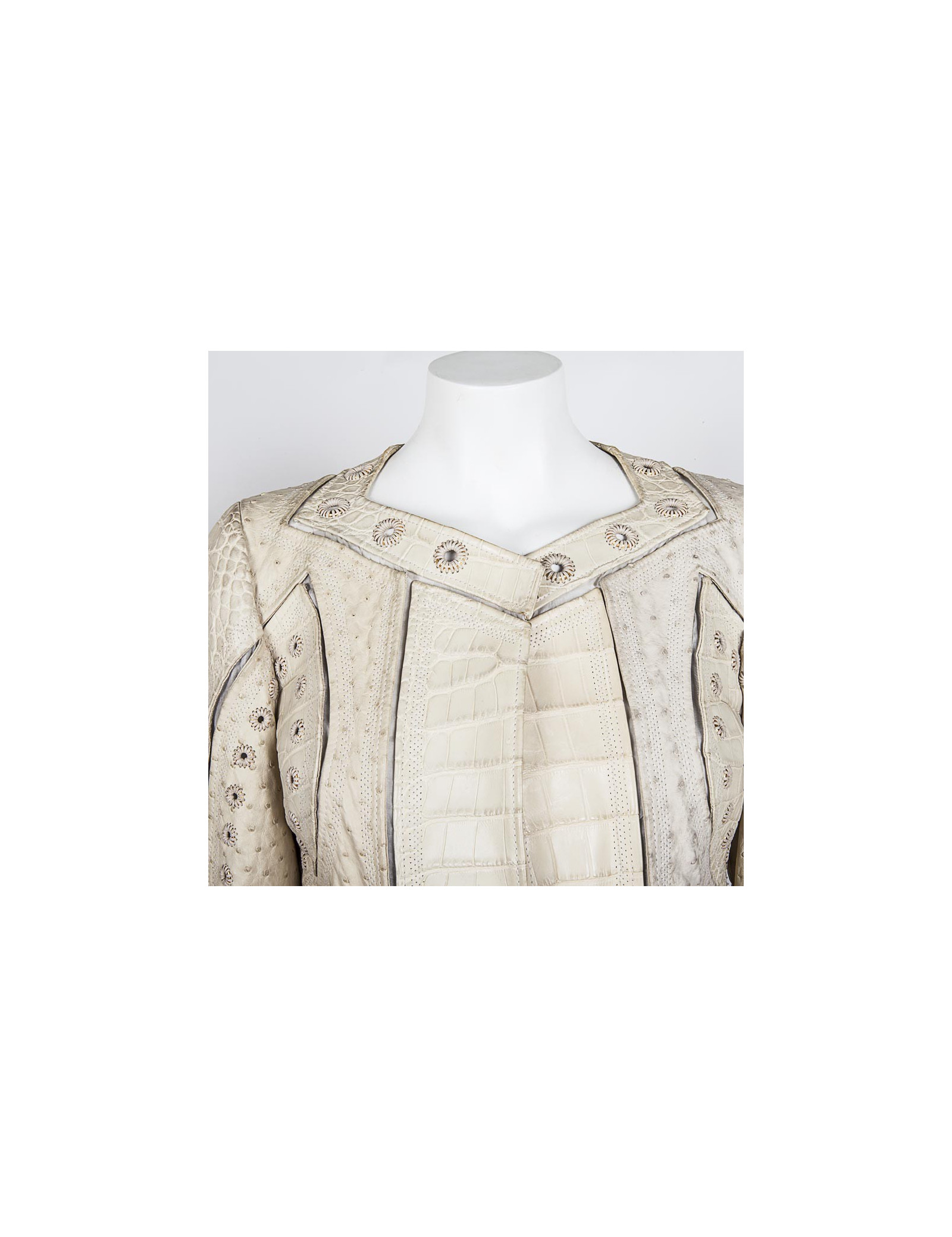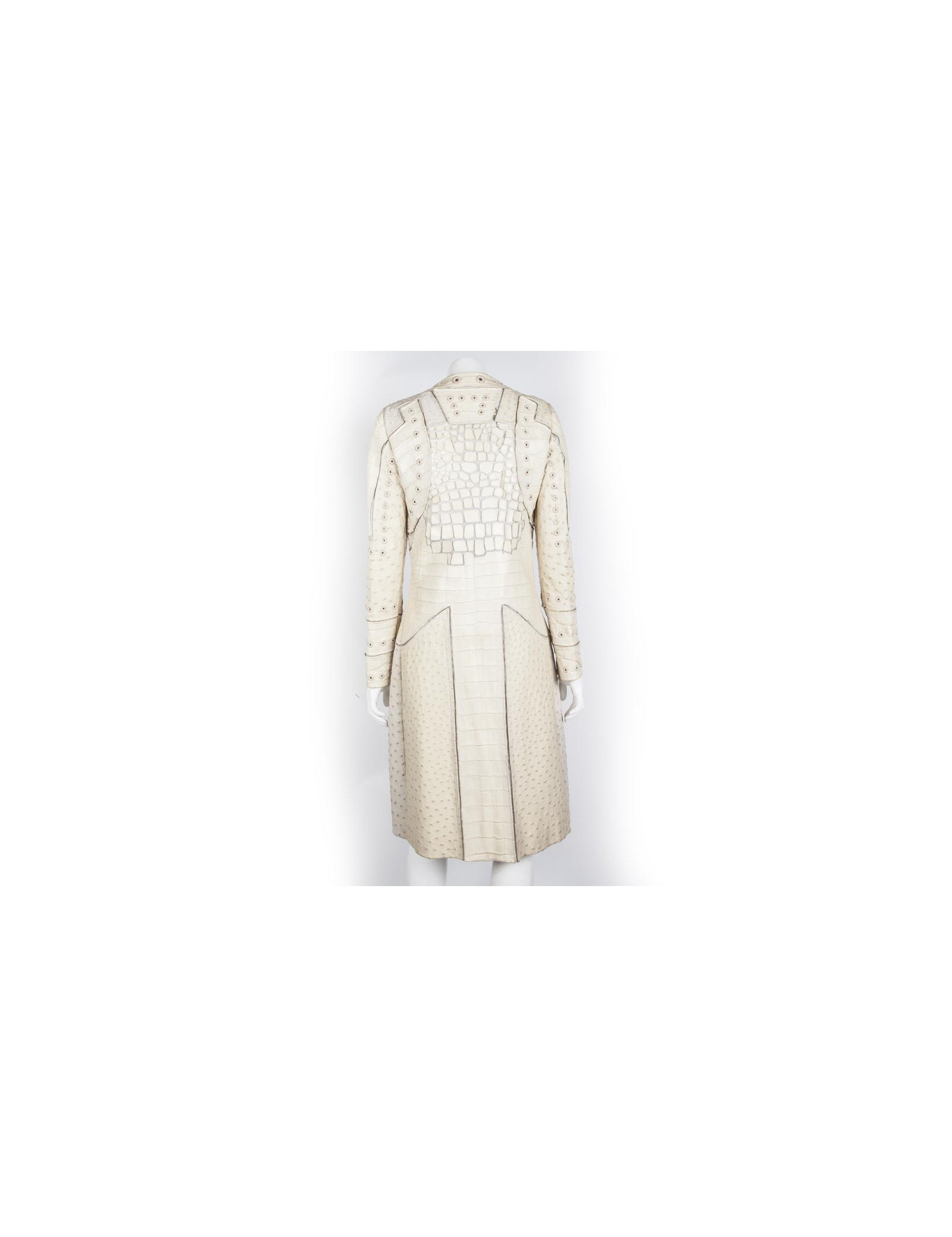 Pièce d'exception. Manteau beige en cuir Gucci taille 42 italien (38 FR). Fendu sur 28 cm des deux côtés arrière. Composé de cuir d'autruche et de crocodile, orné de fils dorés autour du col rond large et sur les manches.