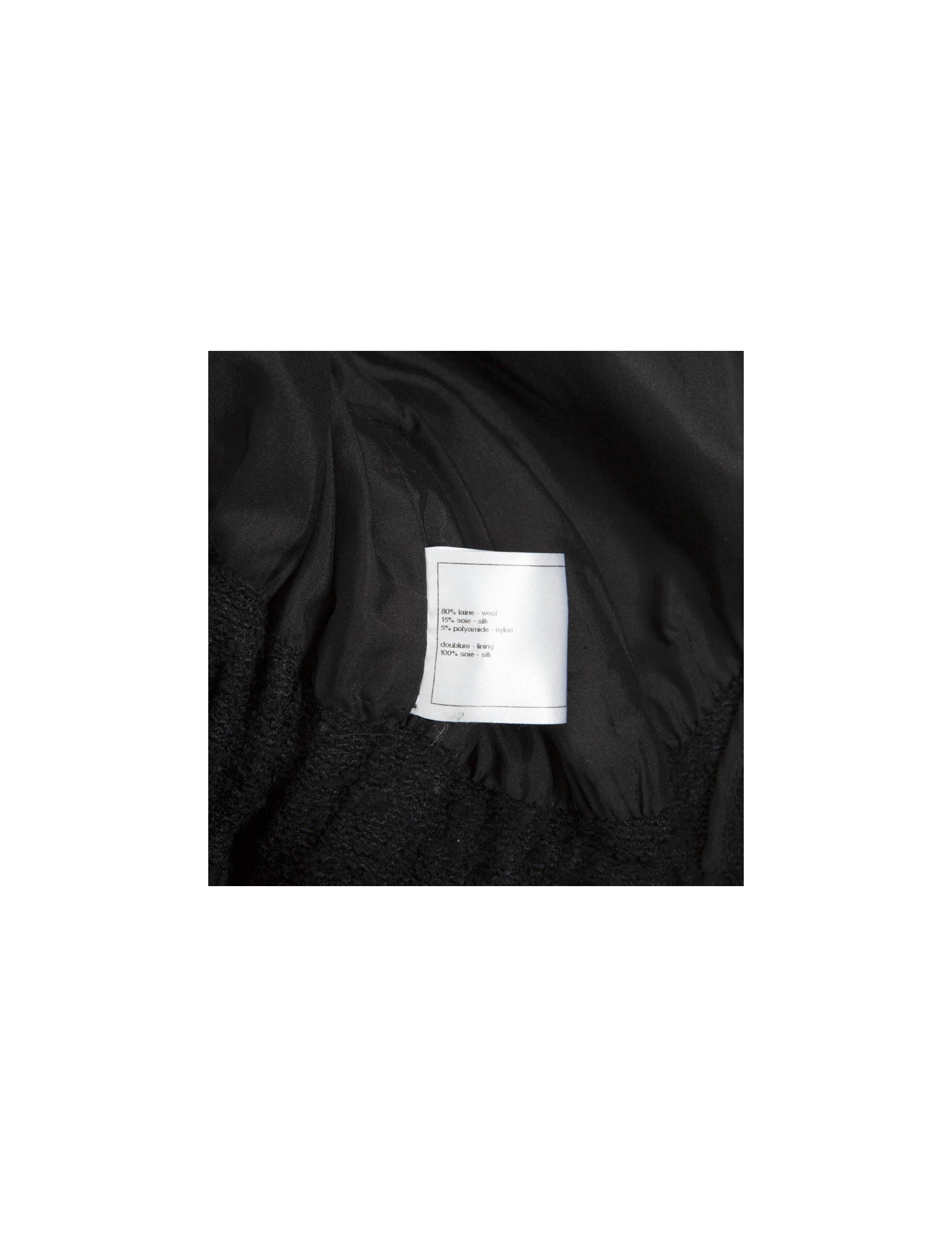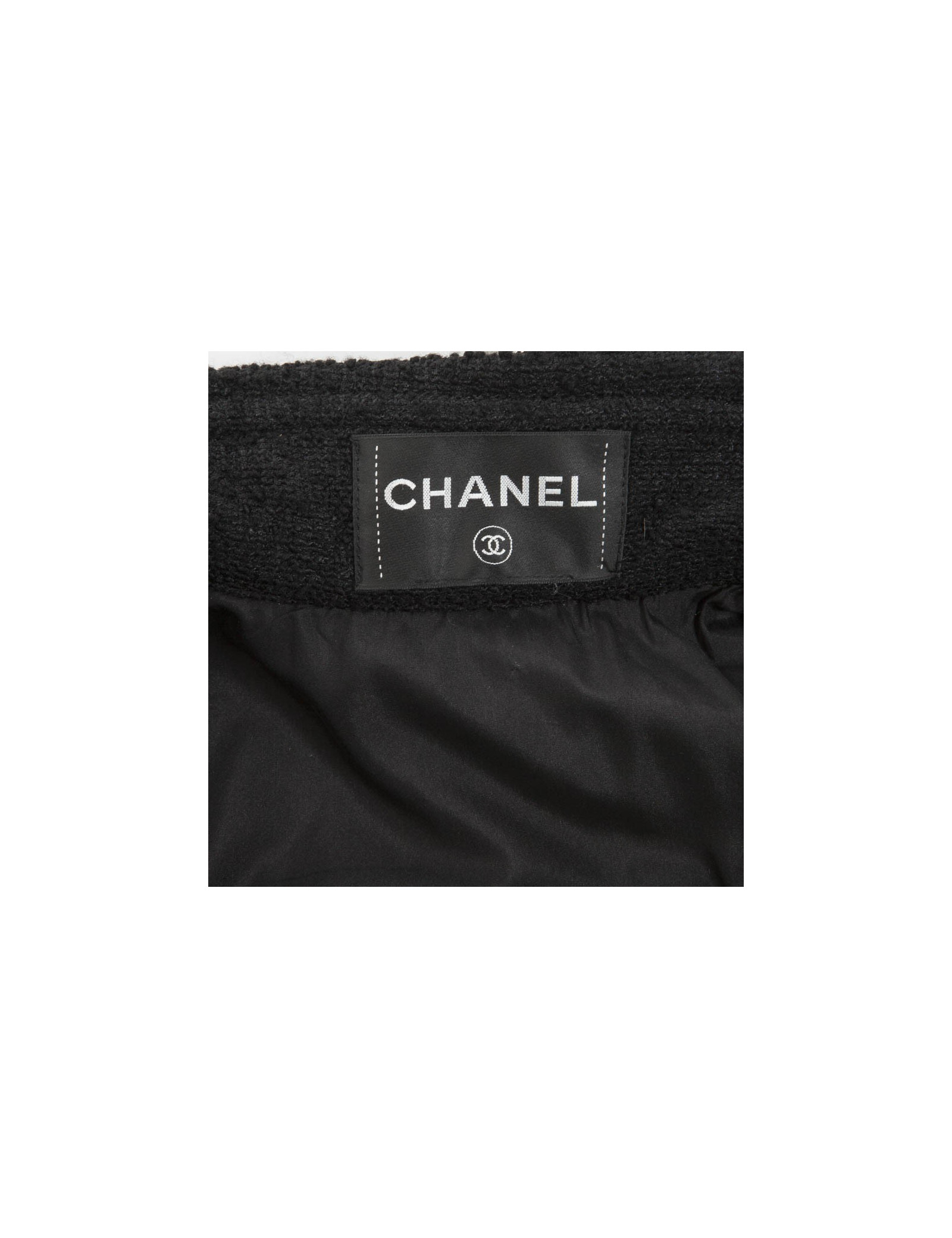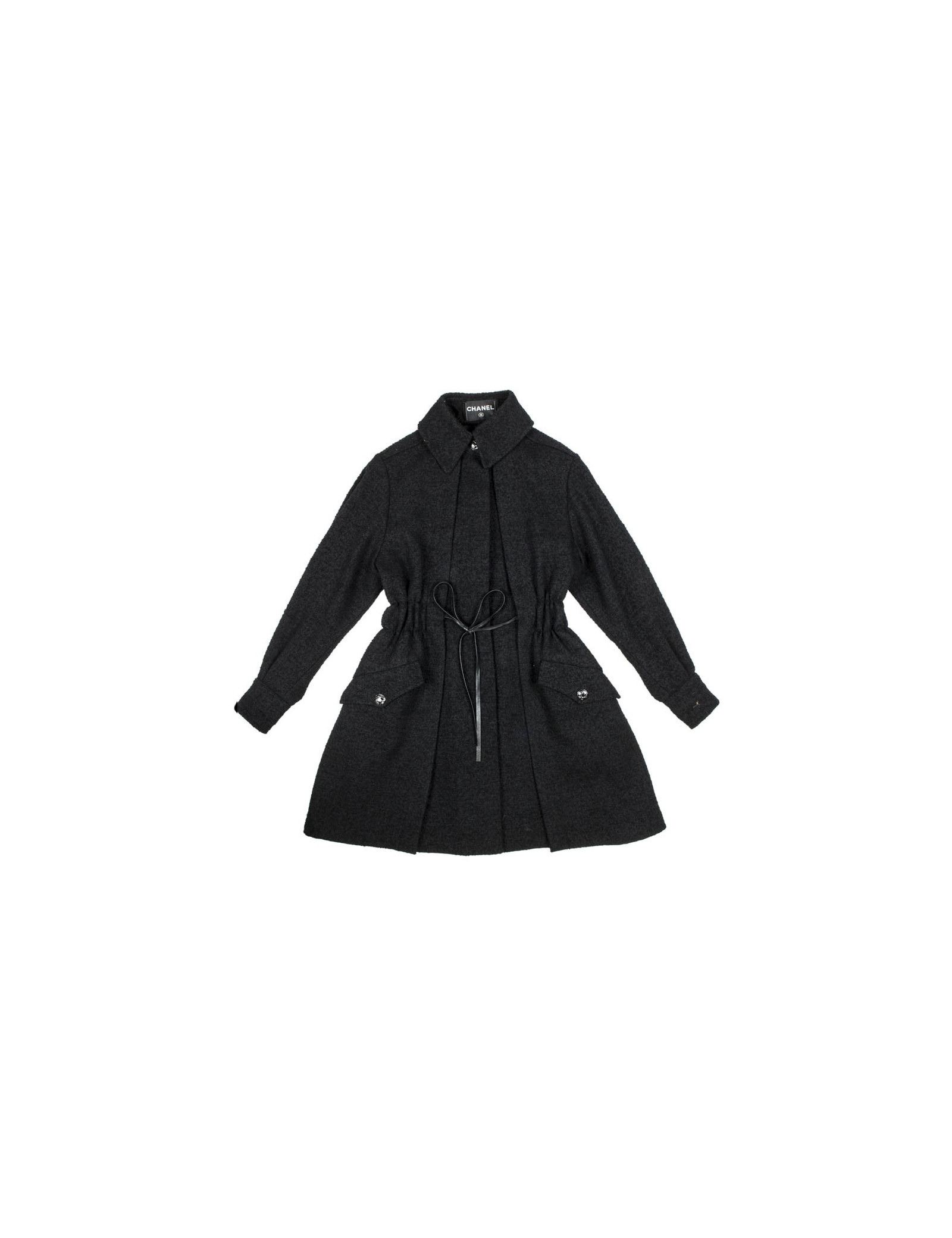 Il se ferme par 6 boutons siglés Chanel et des lanières de cuir noir coulissantes au niveau de la taille. La doublure est en soie noire.