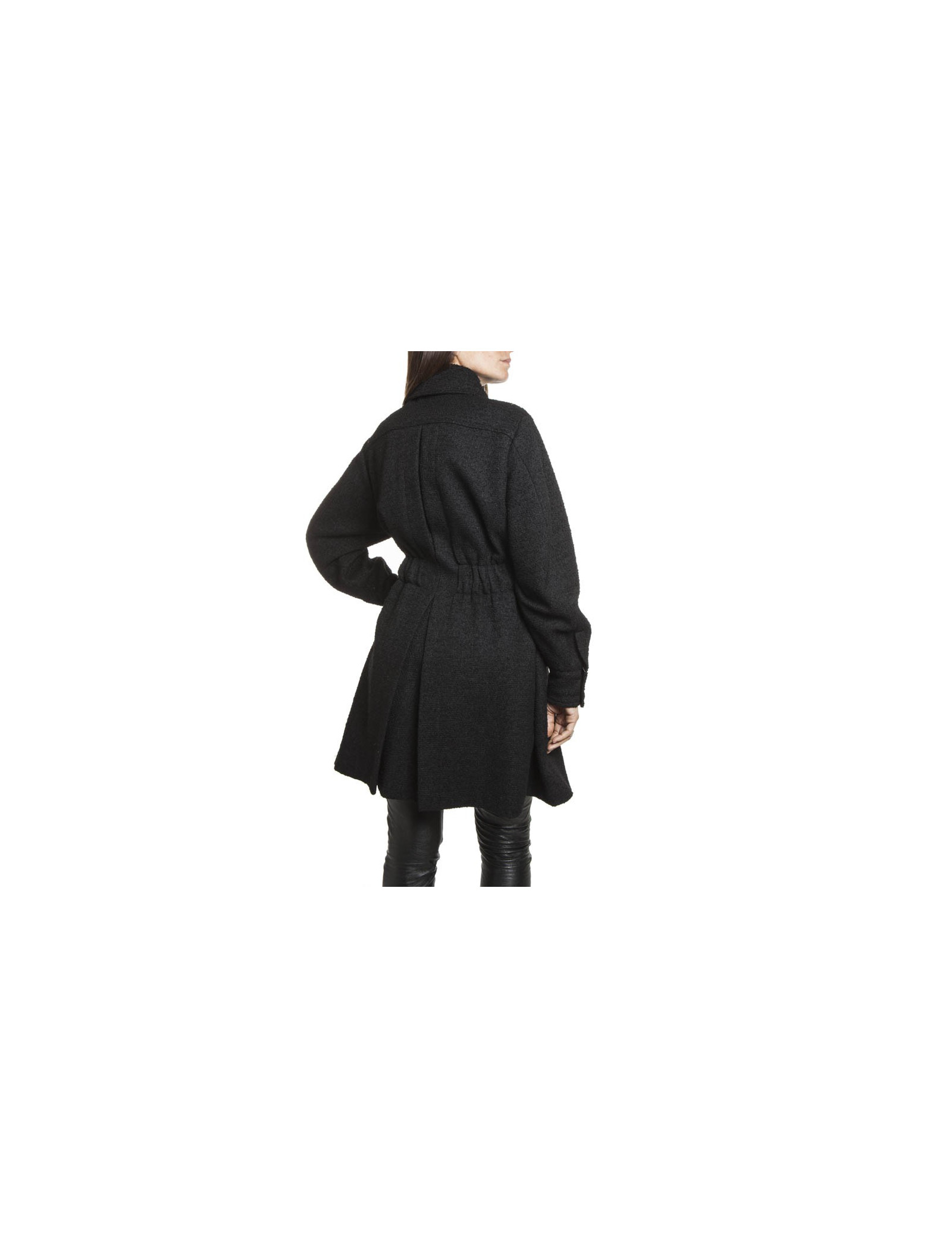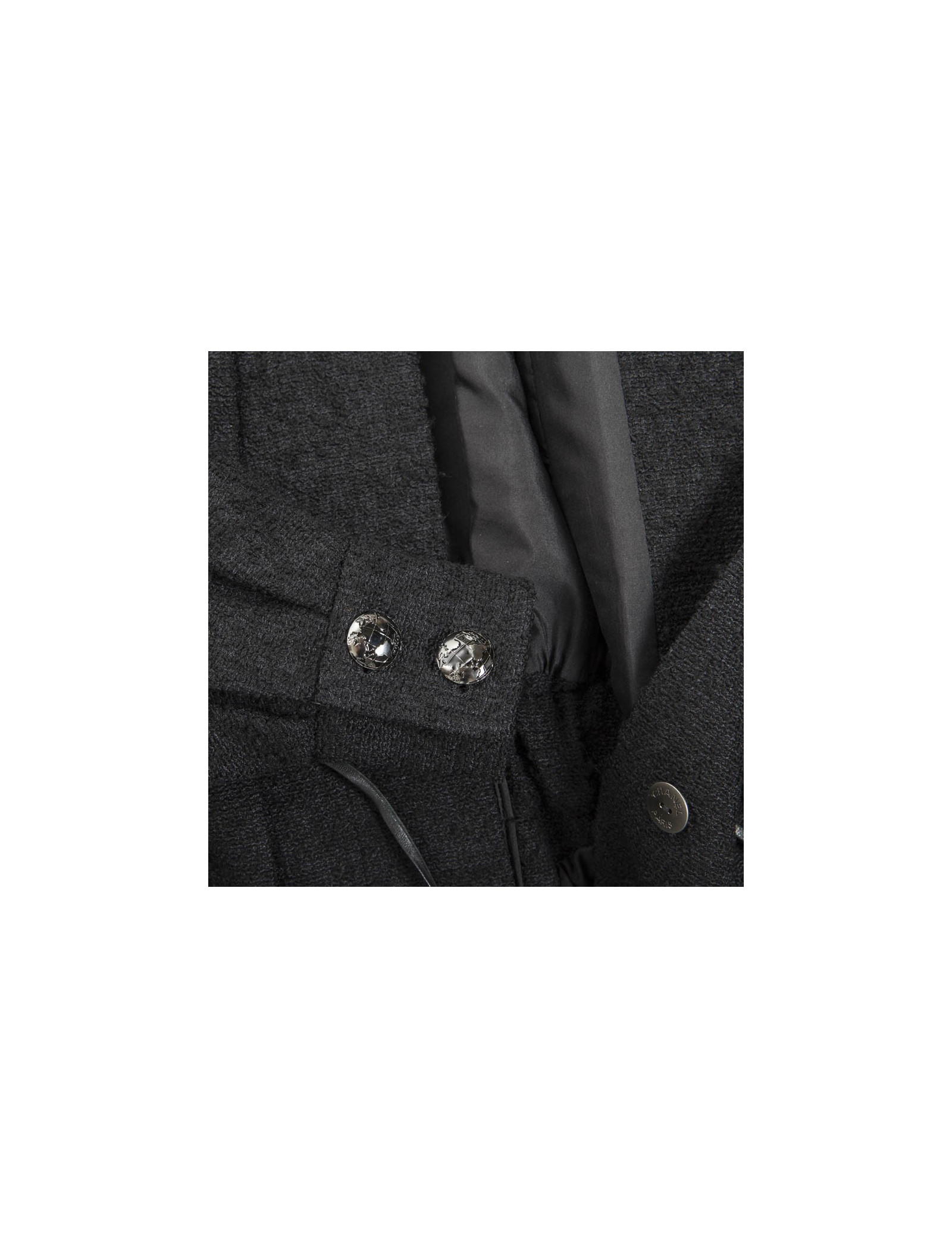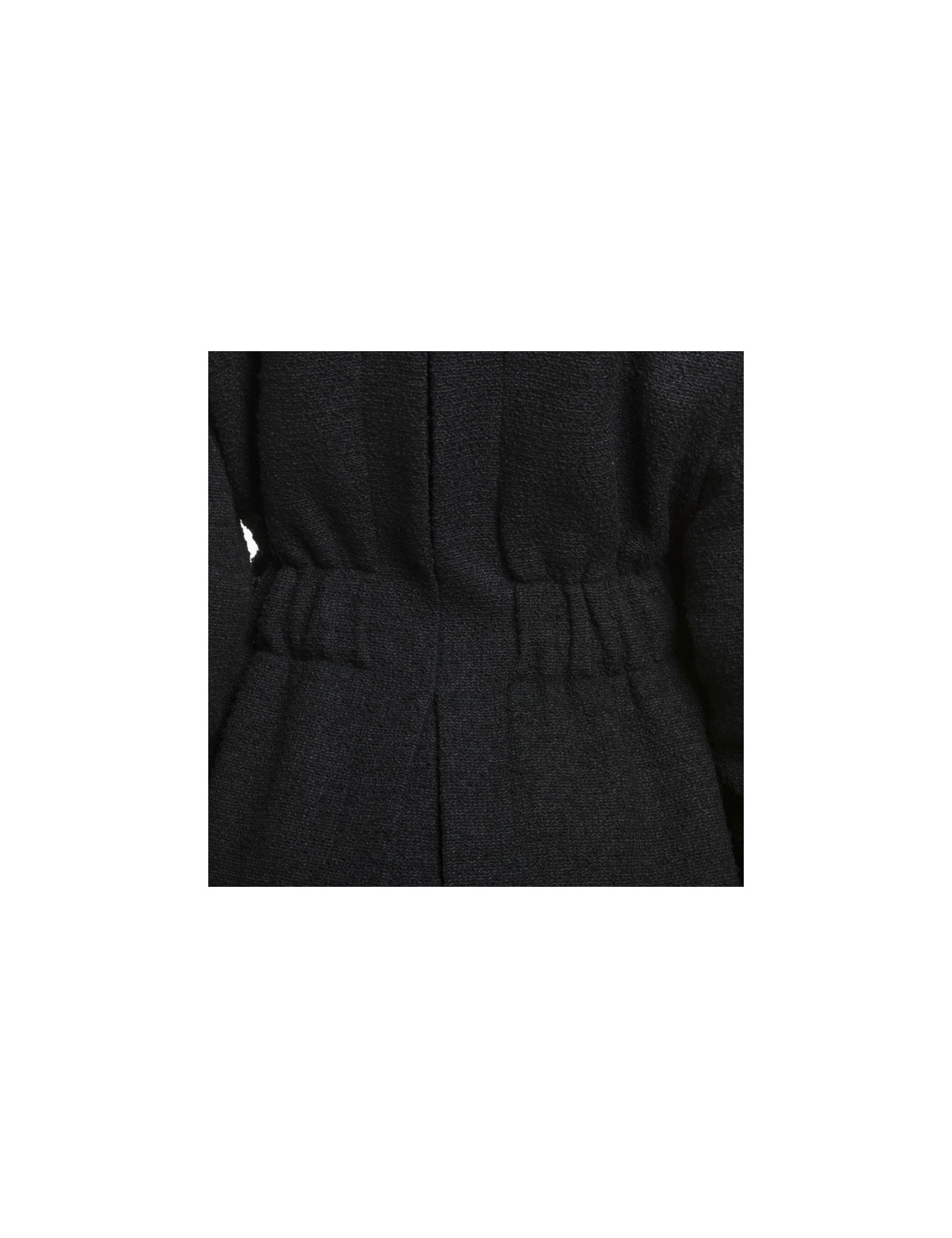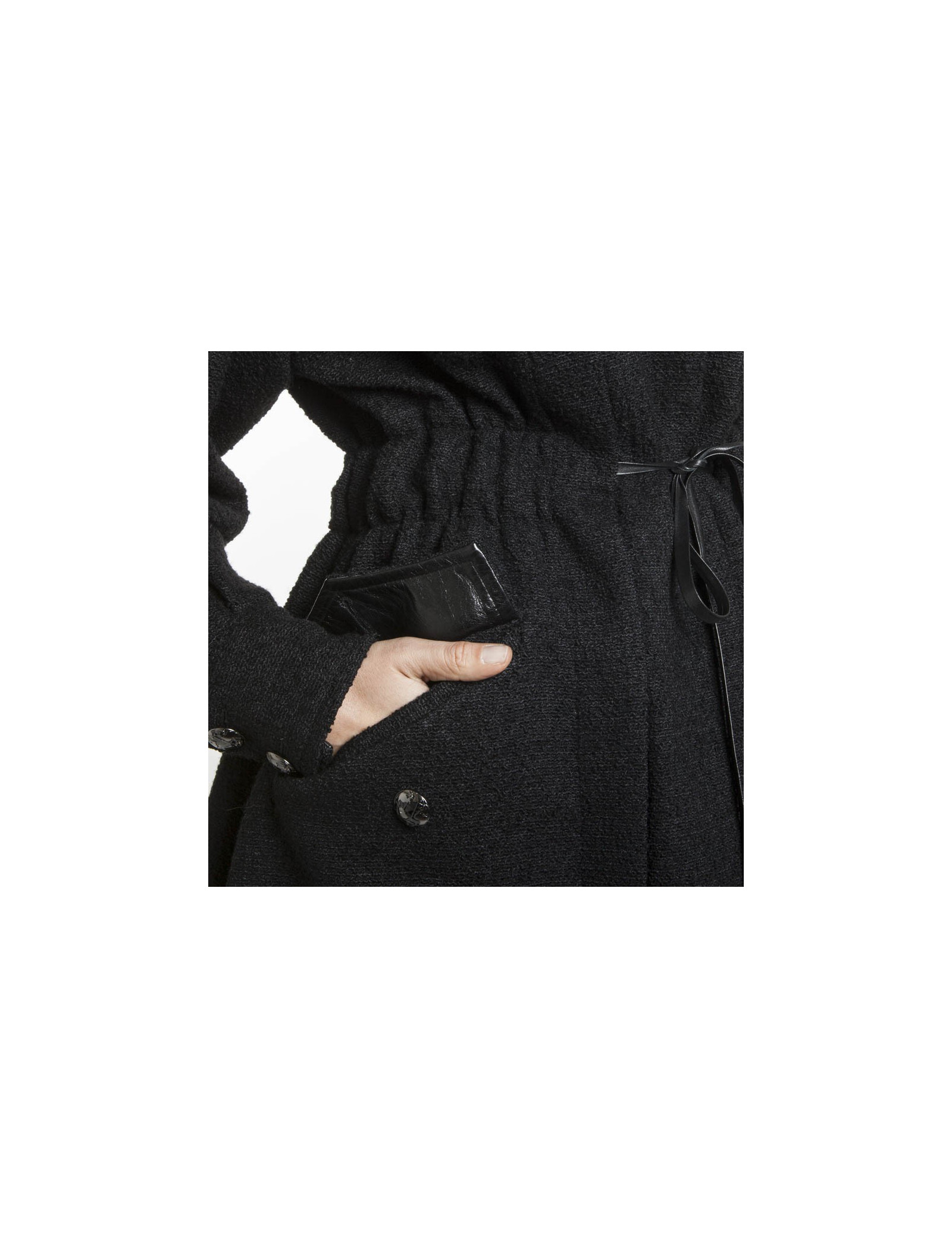 Il se ferme par 6 boutons siglés Chanel et des lanières de cuir noir coulissantes au niveau de la taille. La doublure est en soie noire.