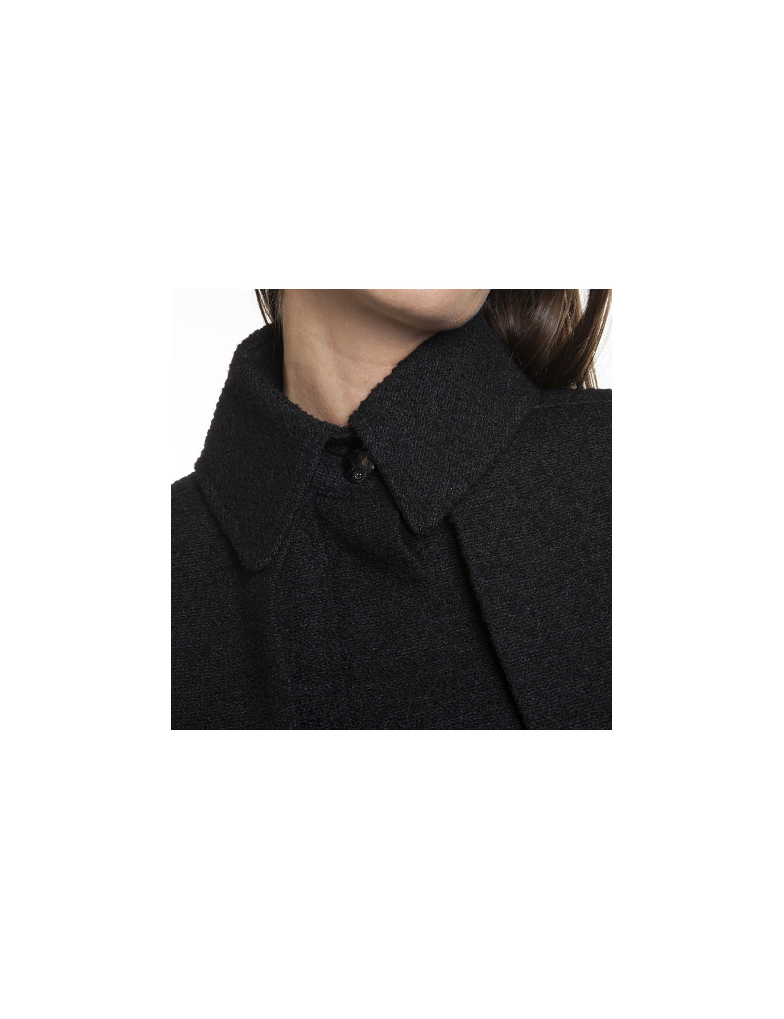 Manteau CHANEL t 38/40 FR en tweed de laine noire avec un très beau col doublé de cuir ainsi que les revers des poches. En très bon état.