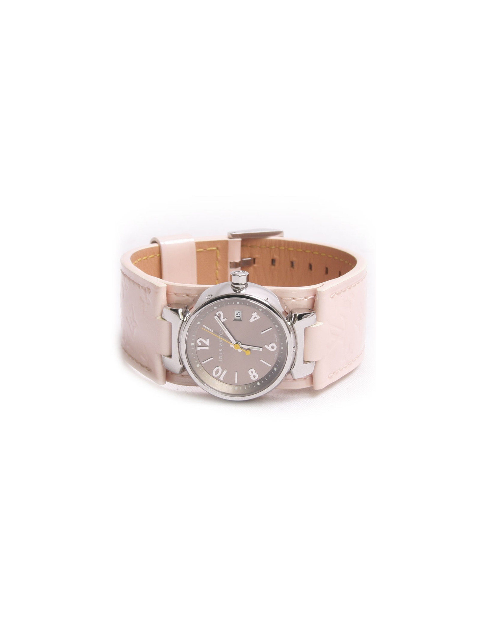 Montre "Tambour" Louis Vuitton, avec bracelet monogram rose poudré verni, à quartz, petit modèle.