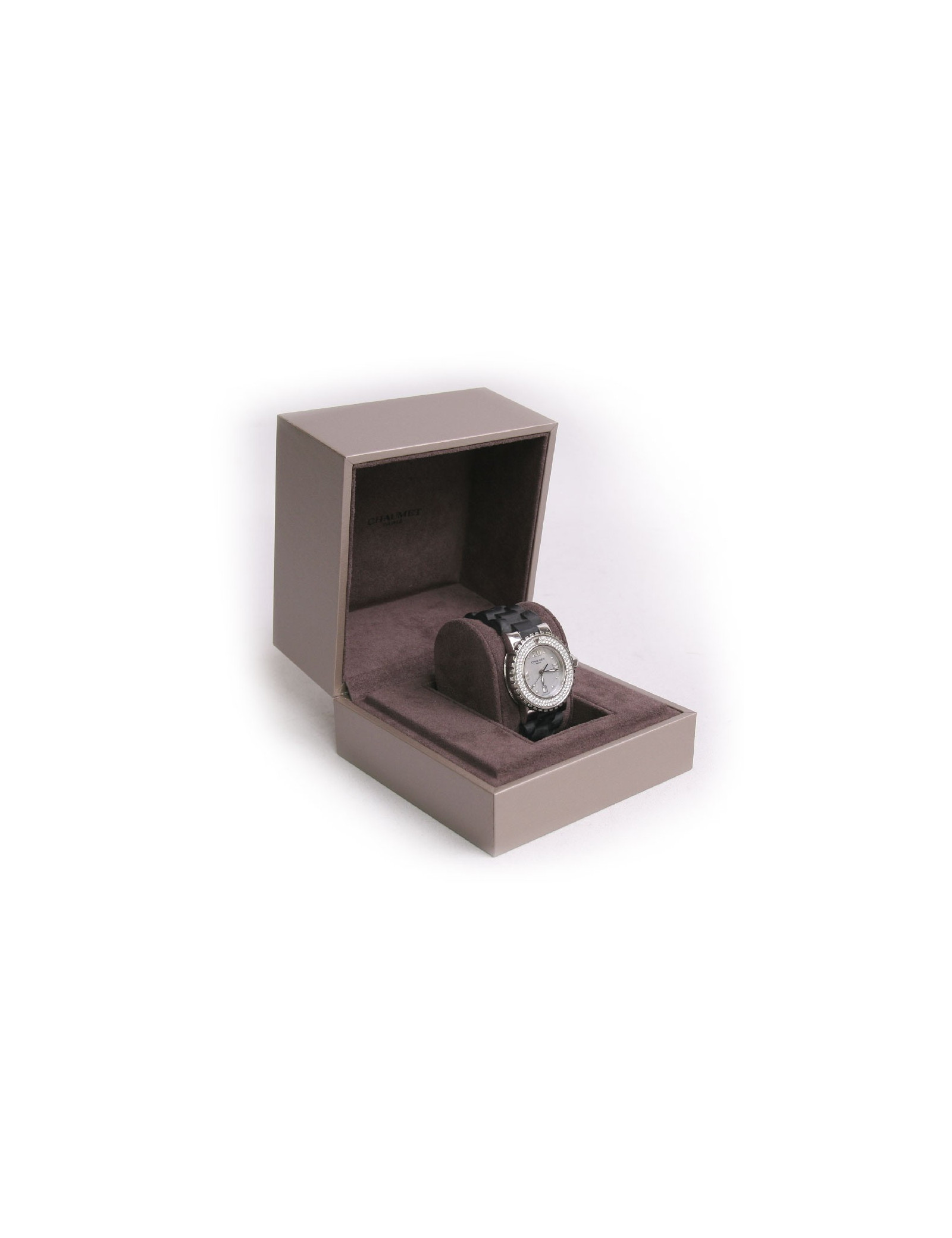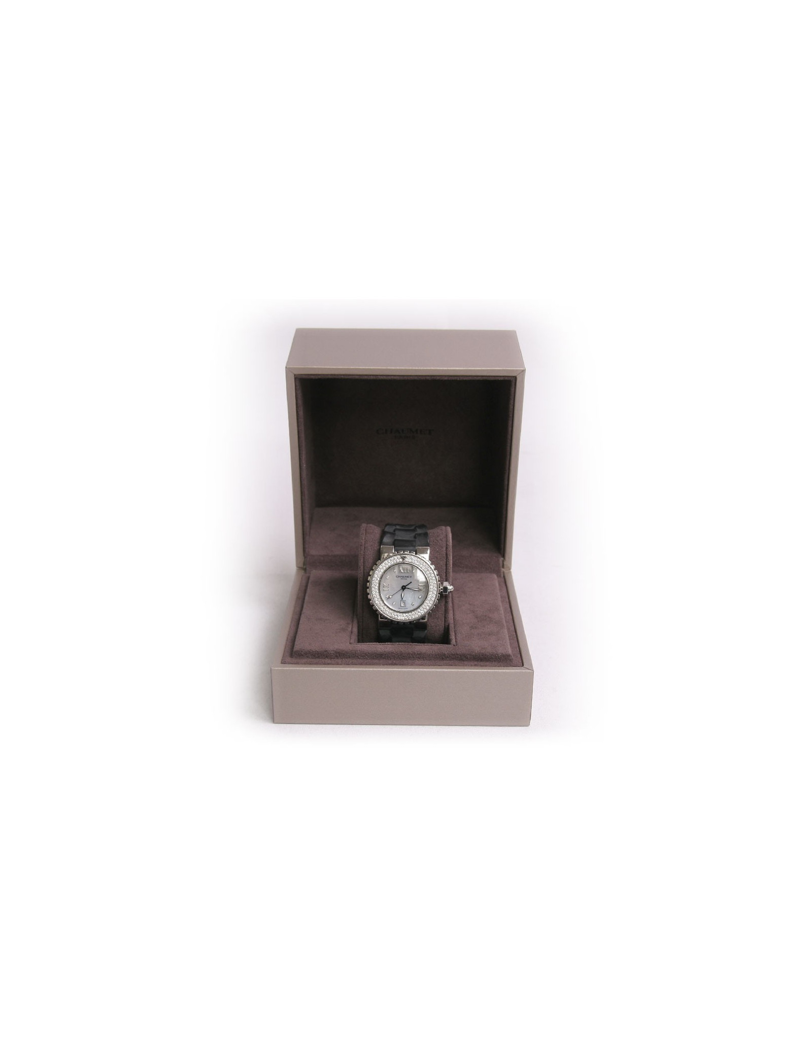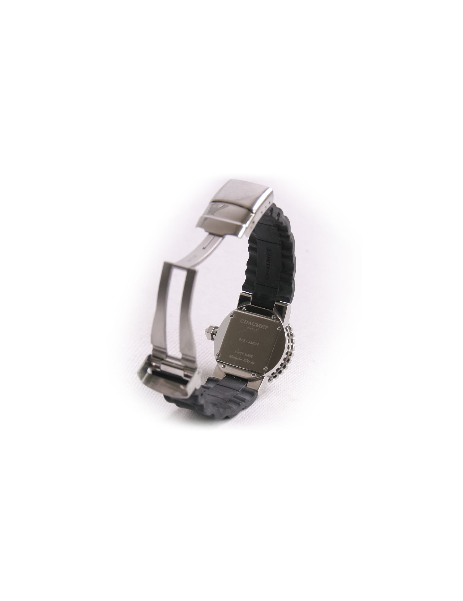 Montre Chaumet Class One en diamants, et acier. Elle est à quartz avec un diamètre 33 mm et étanchéité de 100 mètres. Le verre est en saphir. Le cadran est nacré bleuté. Les chiffres arabes sont en acier. Il y a également le calandrier. Elle a été portée (en très bon état); le bracelet est légèrement blanchi.