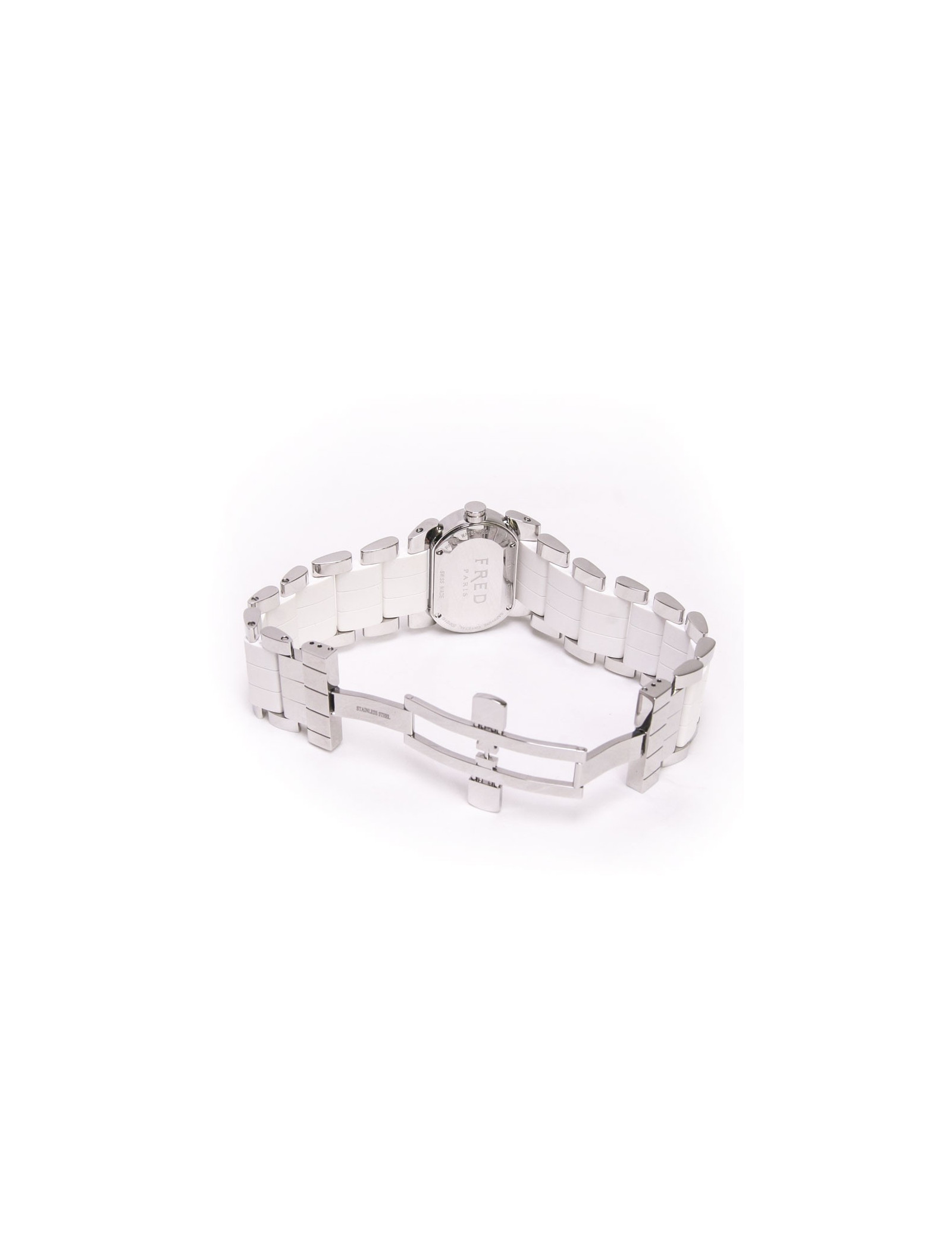 Montre Fred avec bracelet acier et caoutchouc blanc, idéal pour cet été. le mouvement est à quartz. Etat neuf. le cadran est : ovale et mesure : 3 cm x 2 cm. waterresistant : 30 mètres. Elle a une boucle déployante. le bracelet mesure : 17.3 cm. Il est possible de faire retirer des maillons chez Fred.