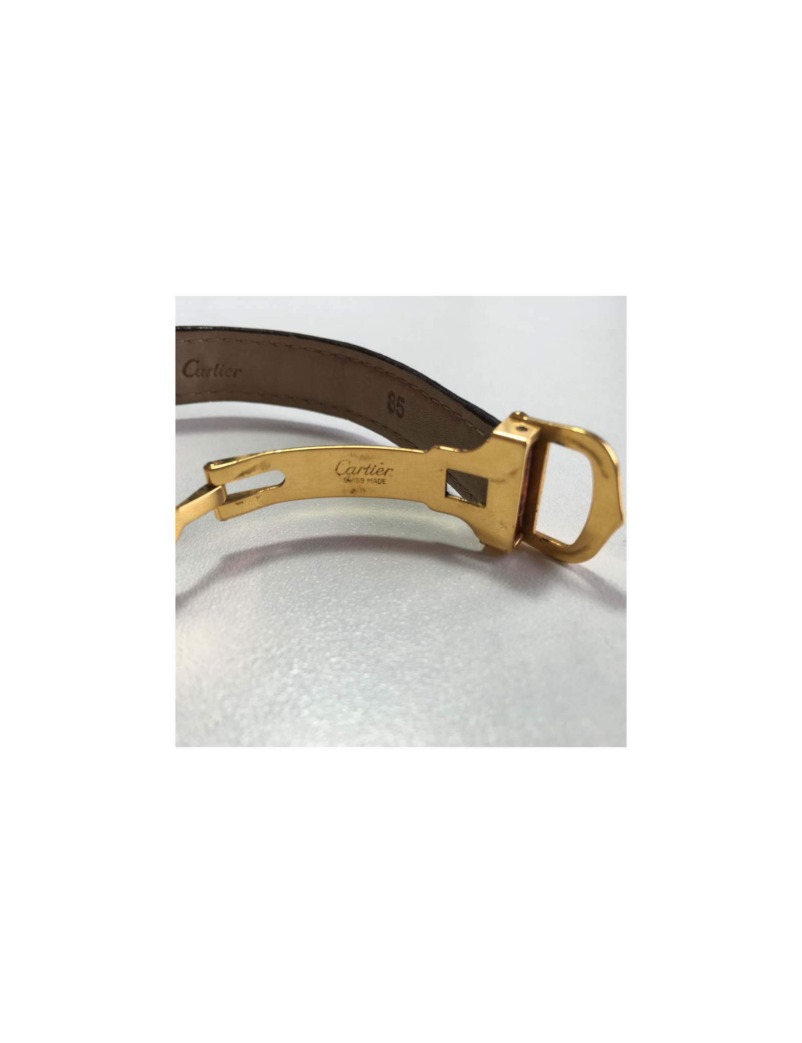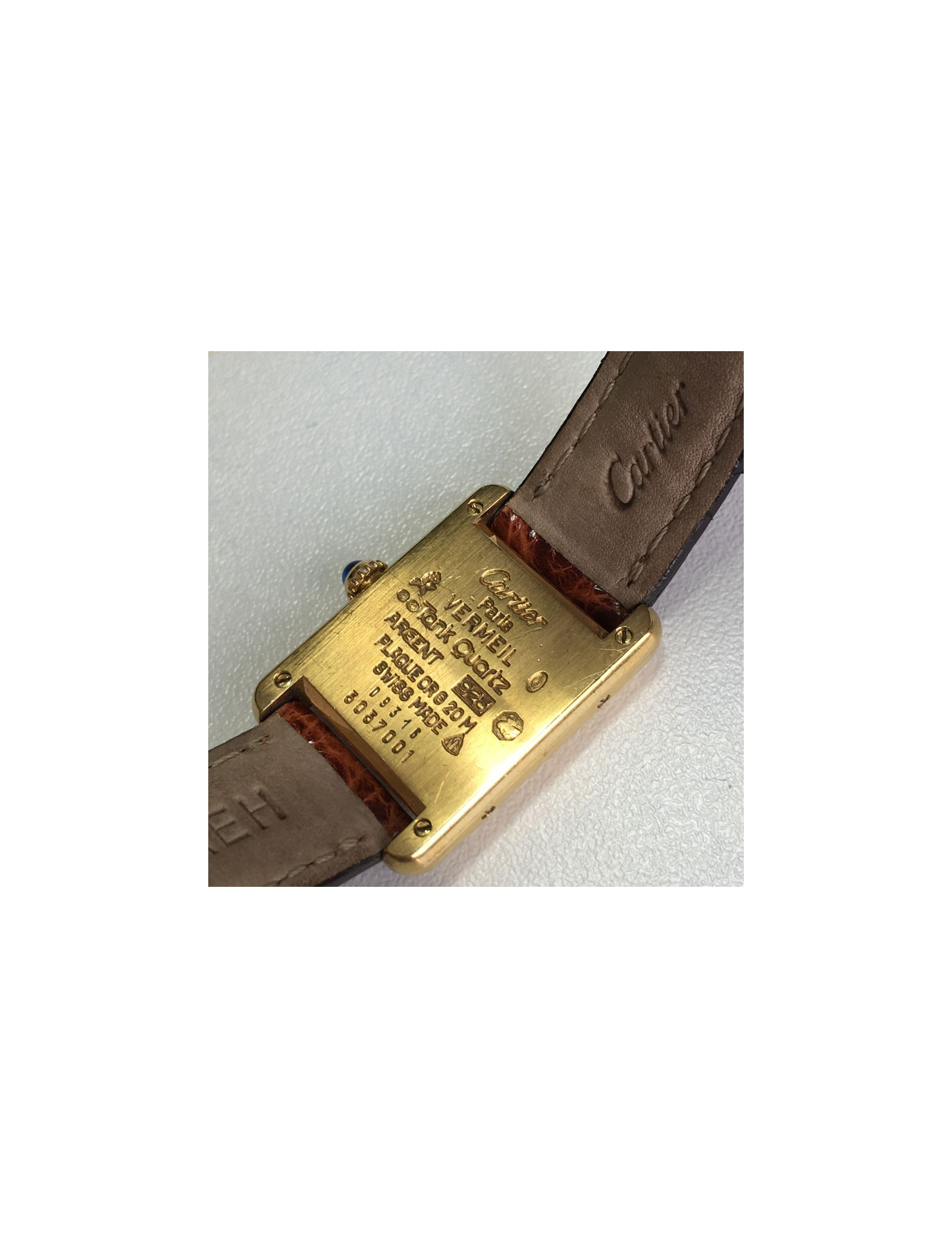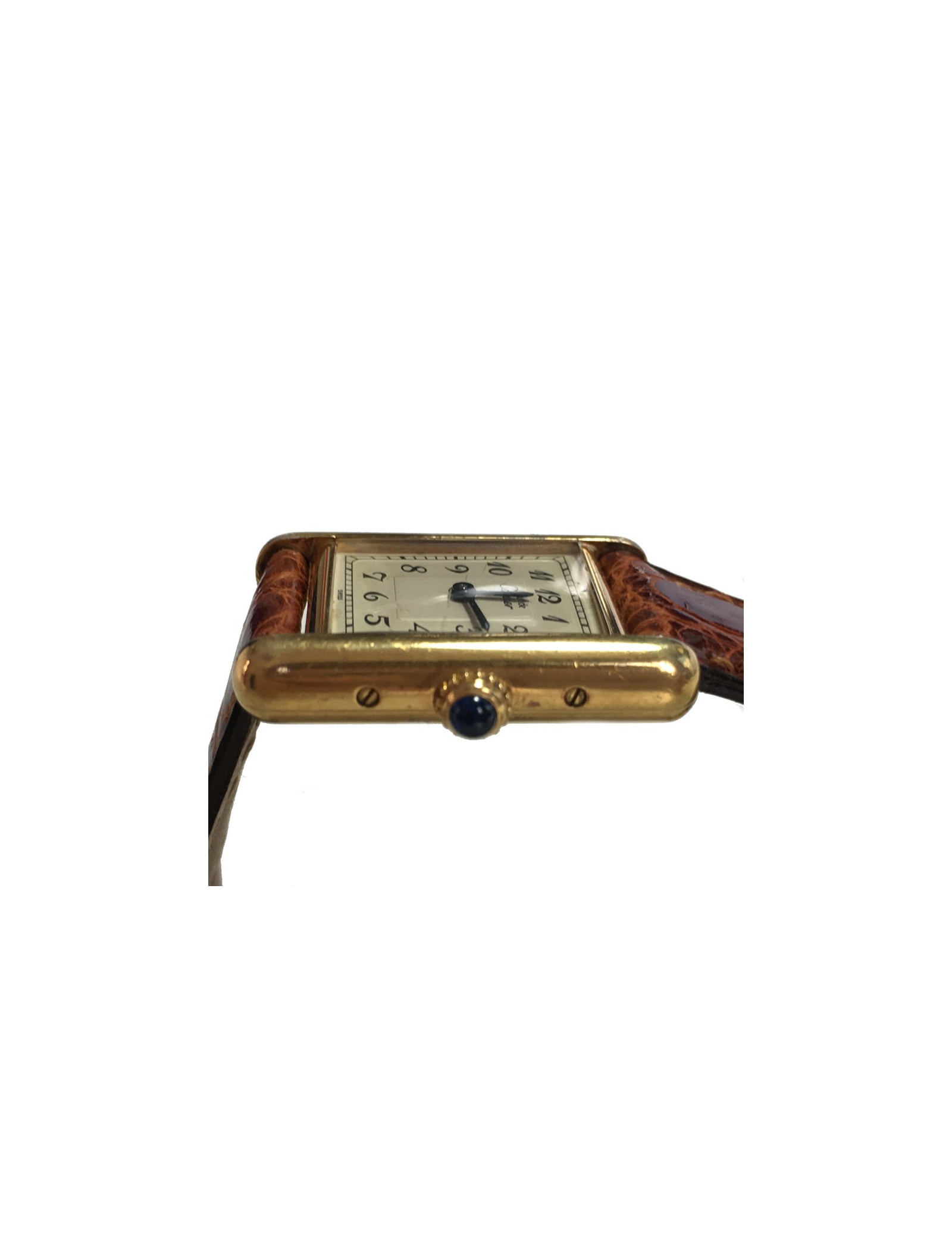 Très belle montre Must de CARTIER, collection TANK, plaqué or 20 microns. Boîtier de 22 mm en vermeil. Son cadran est en argent. Mouvement à quartz, aiguilles bleuté, cabochon saphir. Bracelet en croco marron. Chiffres analogiques.