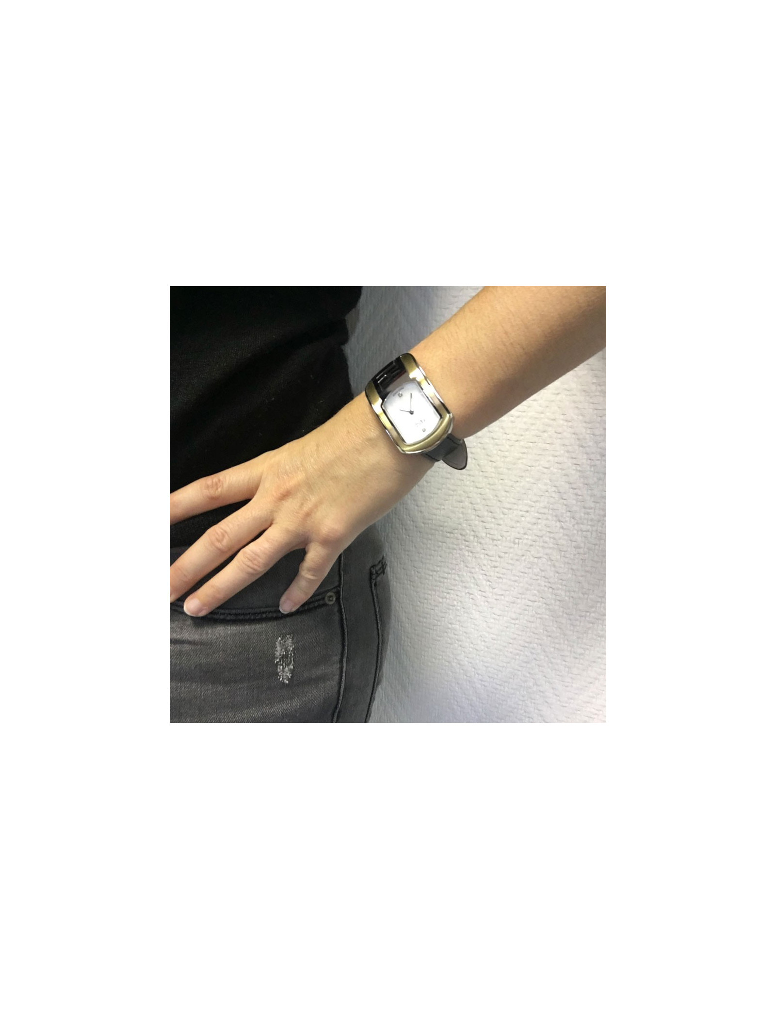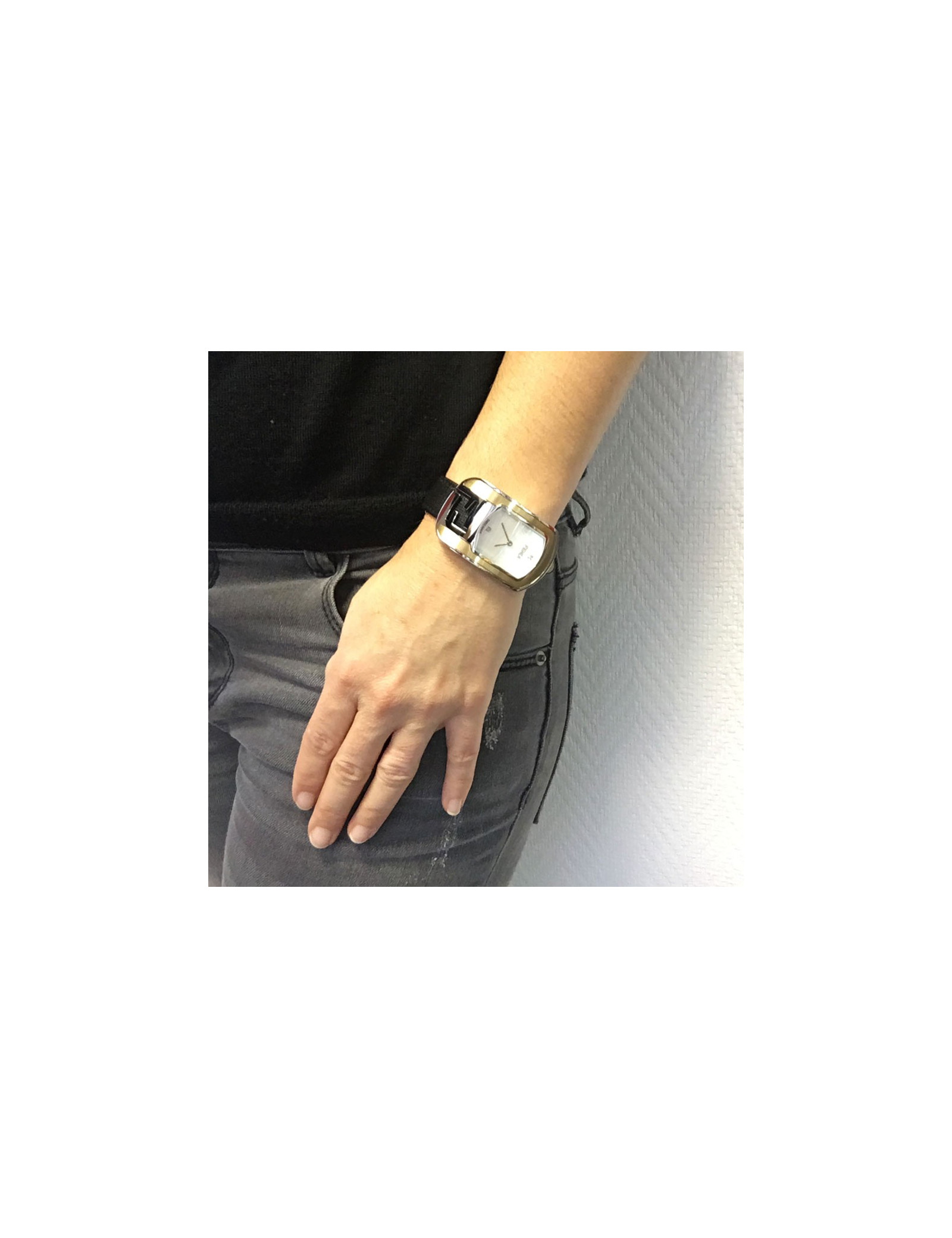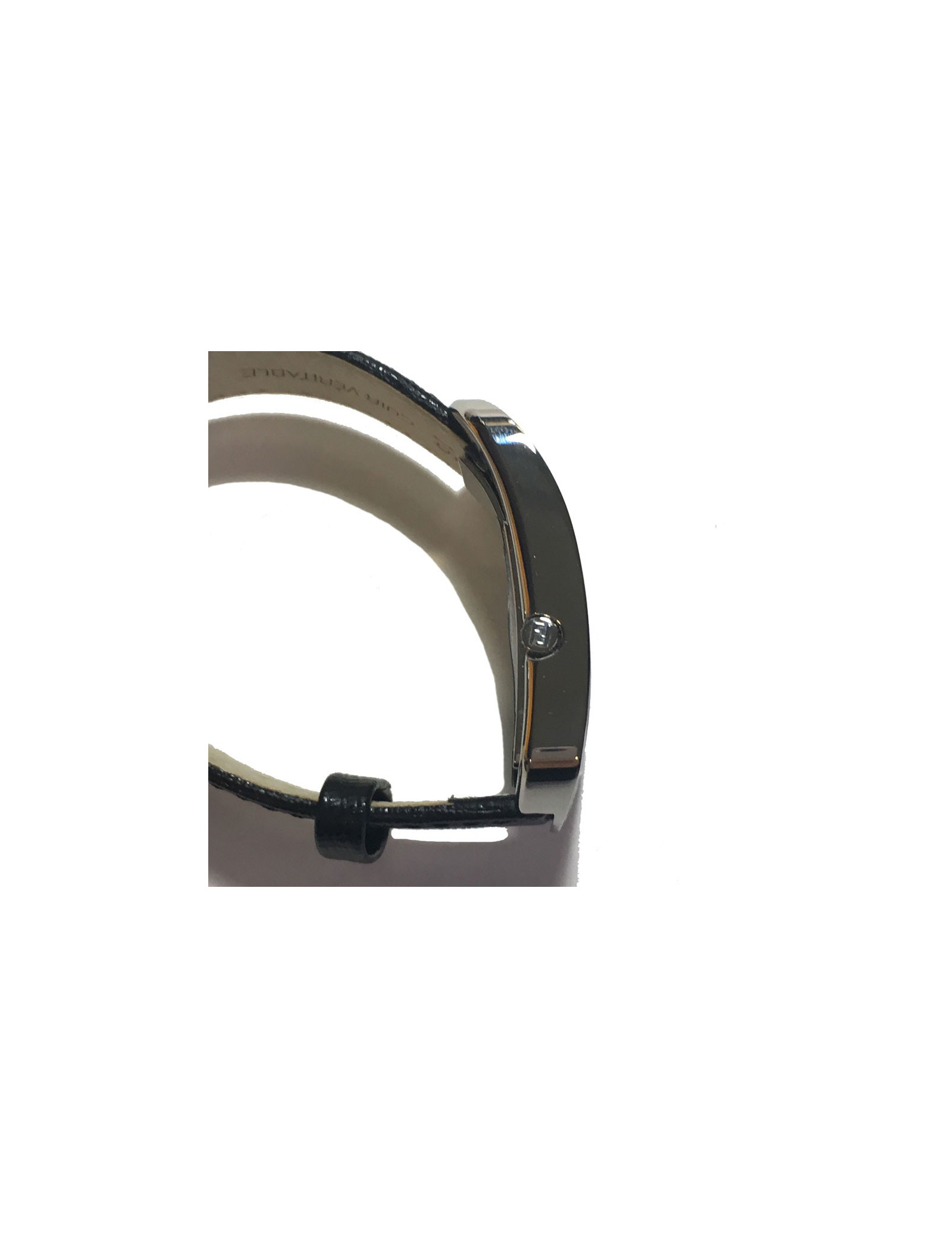 Cadran nacré. Deux diamants sur le cadran. Bracelet en cuir noir. Boucle en acier argenté. Glace saphir. Mouvement à quartz.