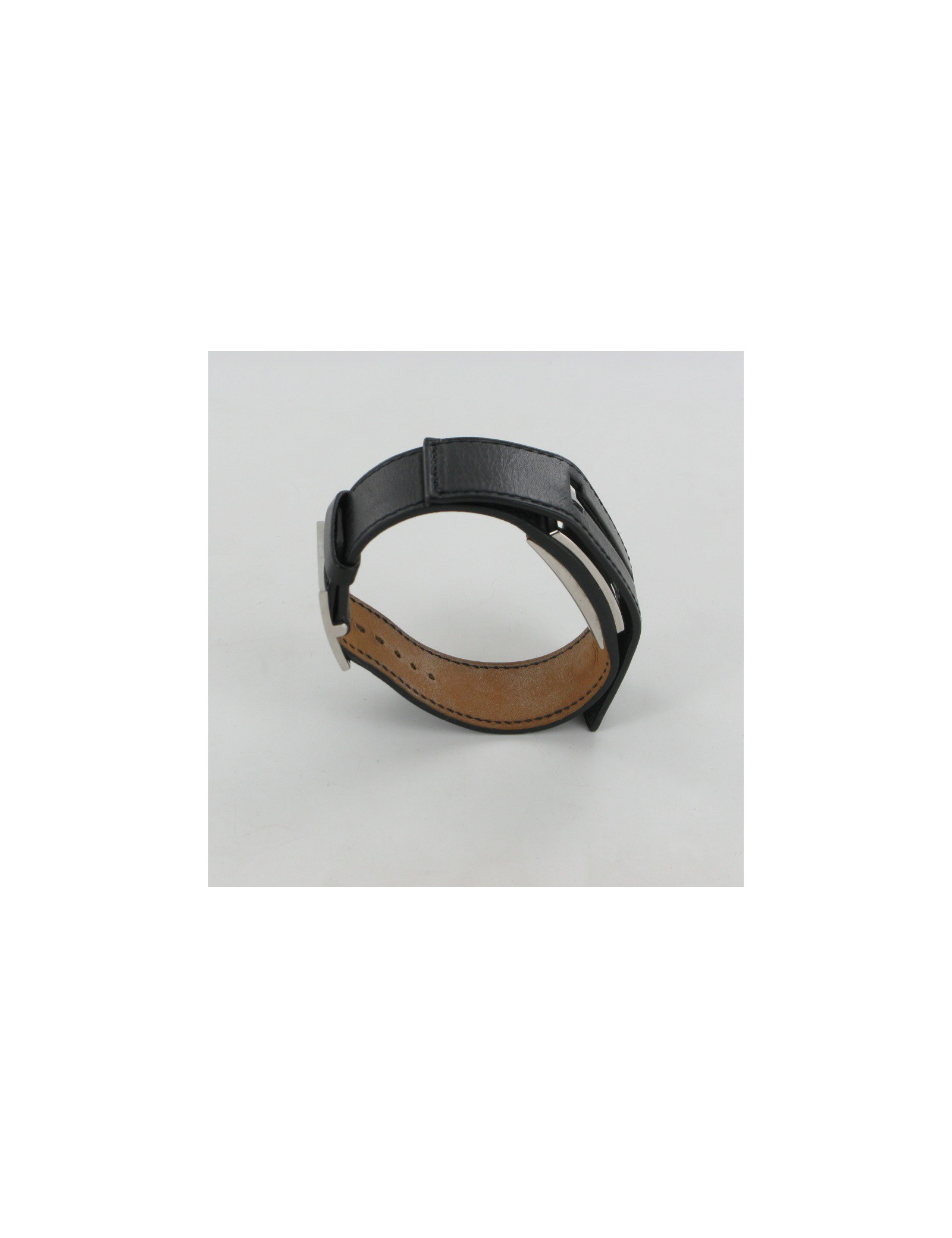 Bracelet en cuir noir, monture acier, cadran fond argent, mécanisme à quartz