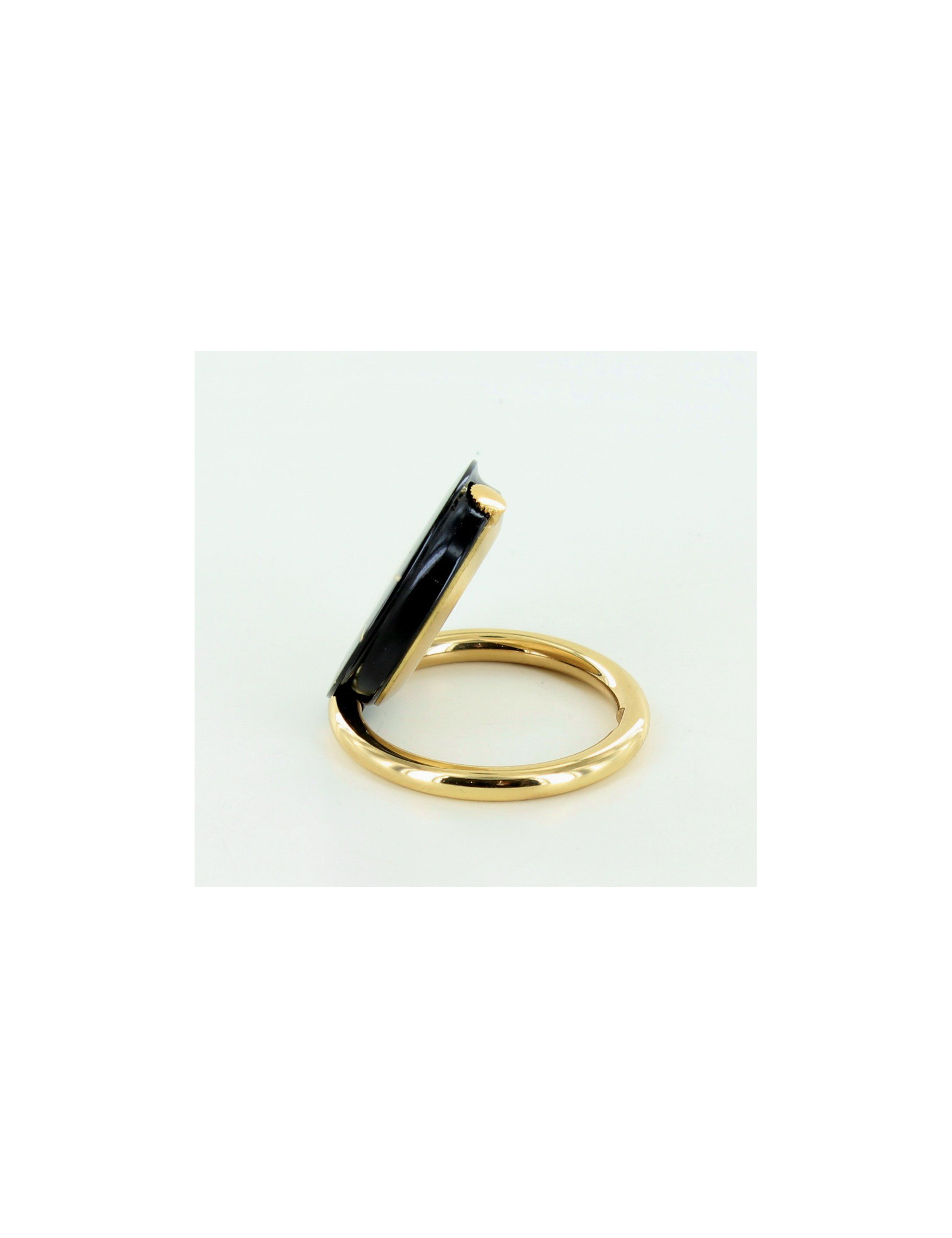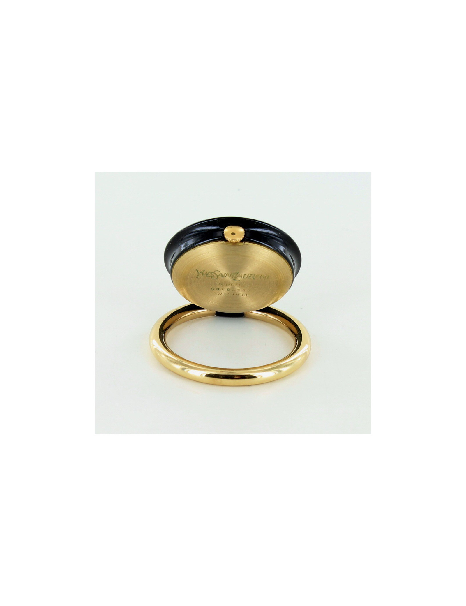 Pendulette de voyage élégante et raffinée Yves Saint Laurent Collection, noire et or. Équipée d'un mouvement swiss made à quartz - chiffres arabes et dateur