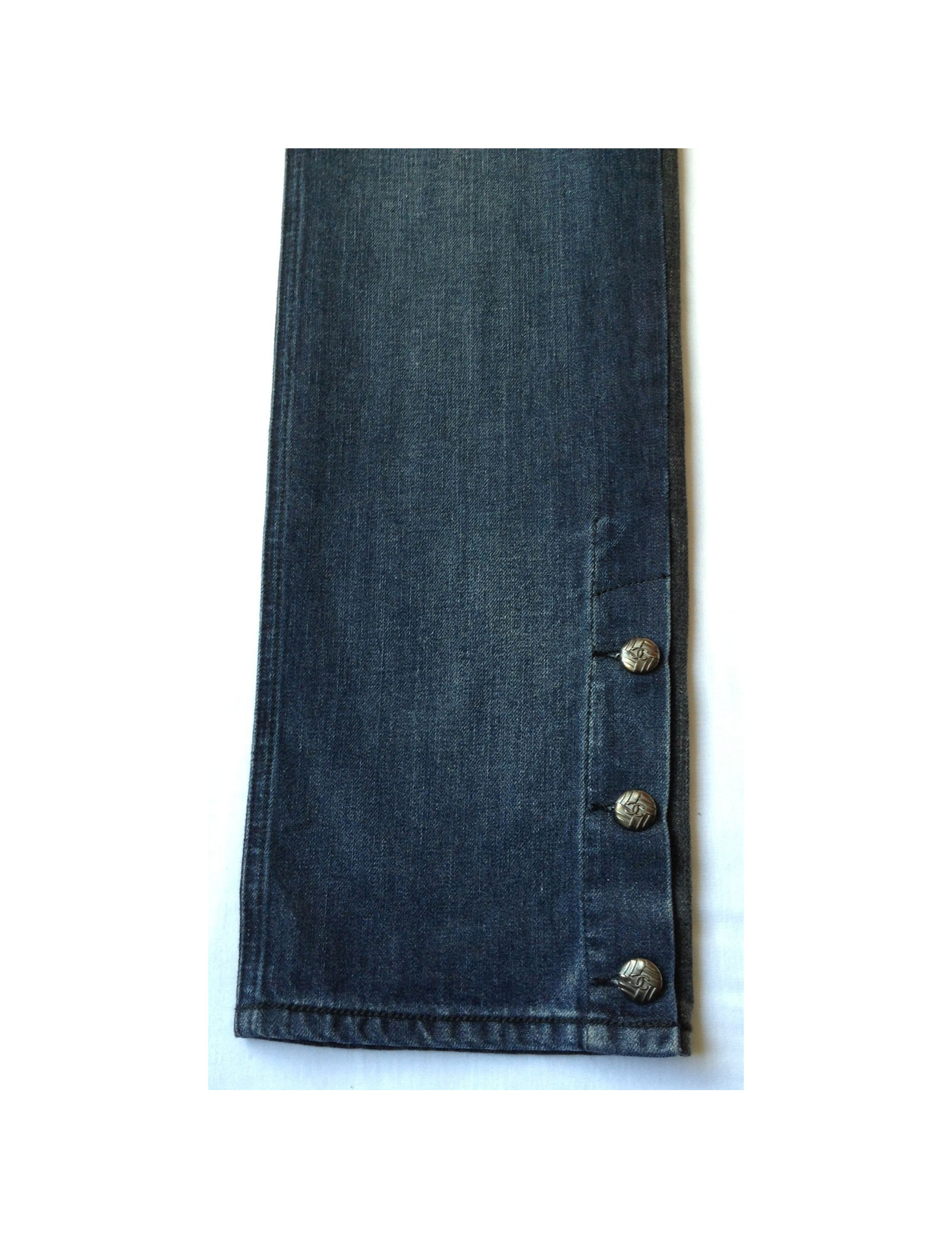 Jeans Chanel bicolore 100% coton. Taille 42FR. Coupe droite, fermeture 1 bouton à la taille et 3 boutons à la cheville siglé CC. Pantalon de couleur bleu jeans sur le devant du pantalon et de couleur noir délavé de l'autre côté. Un look très tendance!